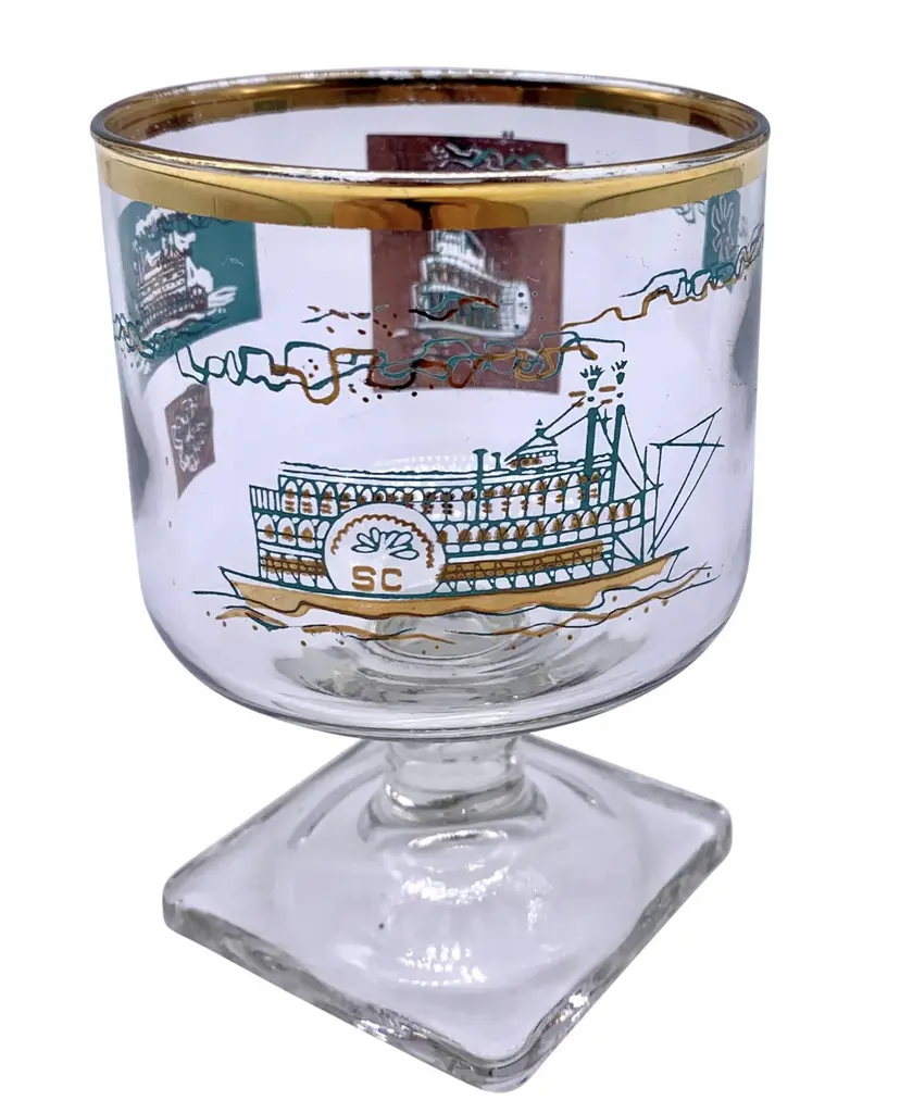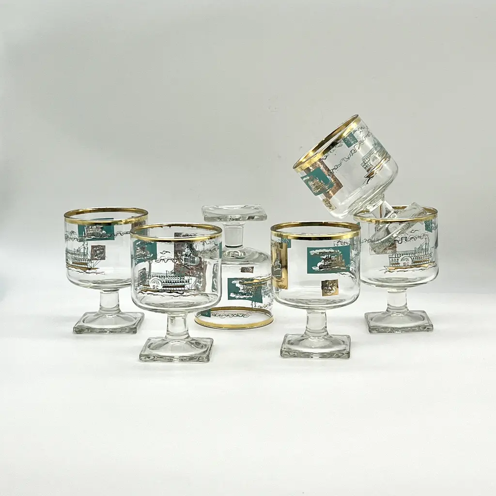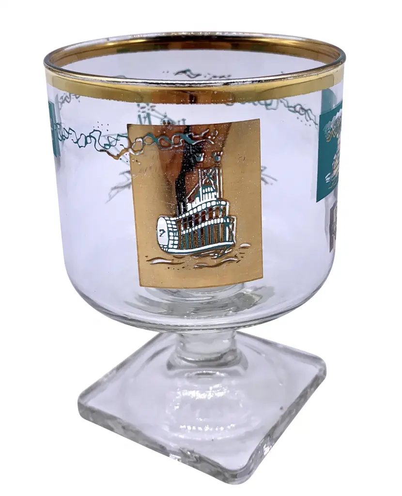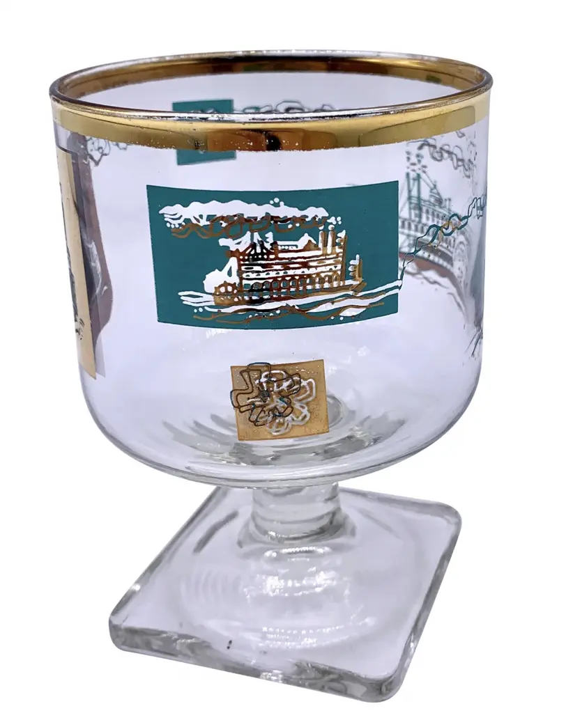 Set of six c. 1960s Mid-Century Modern square footed cocktail glasses with 22K gold and turquoise riverboat motif by Libbey. Libbey glass was founded in 1818 in East Cambridge, MA. These commemorative glasses were made for Southern Comfort's 1968 Centennial. The initials "SC" are visible on one of the steamboat's paddle wheels on each glass. 22K gold rim is featured on each glass.