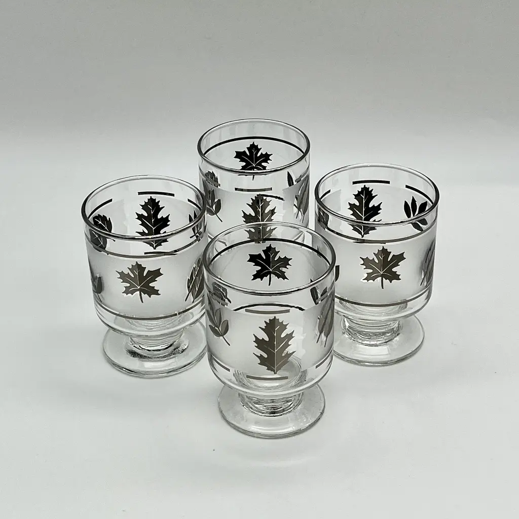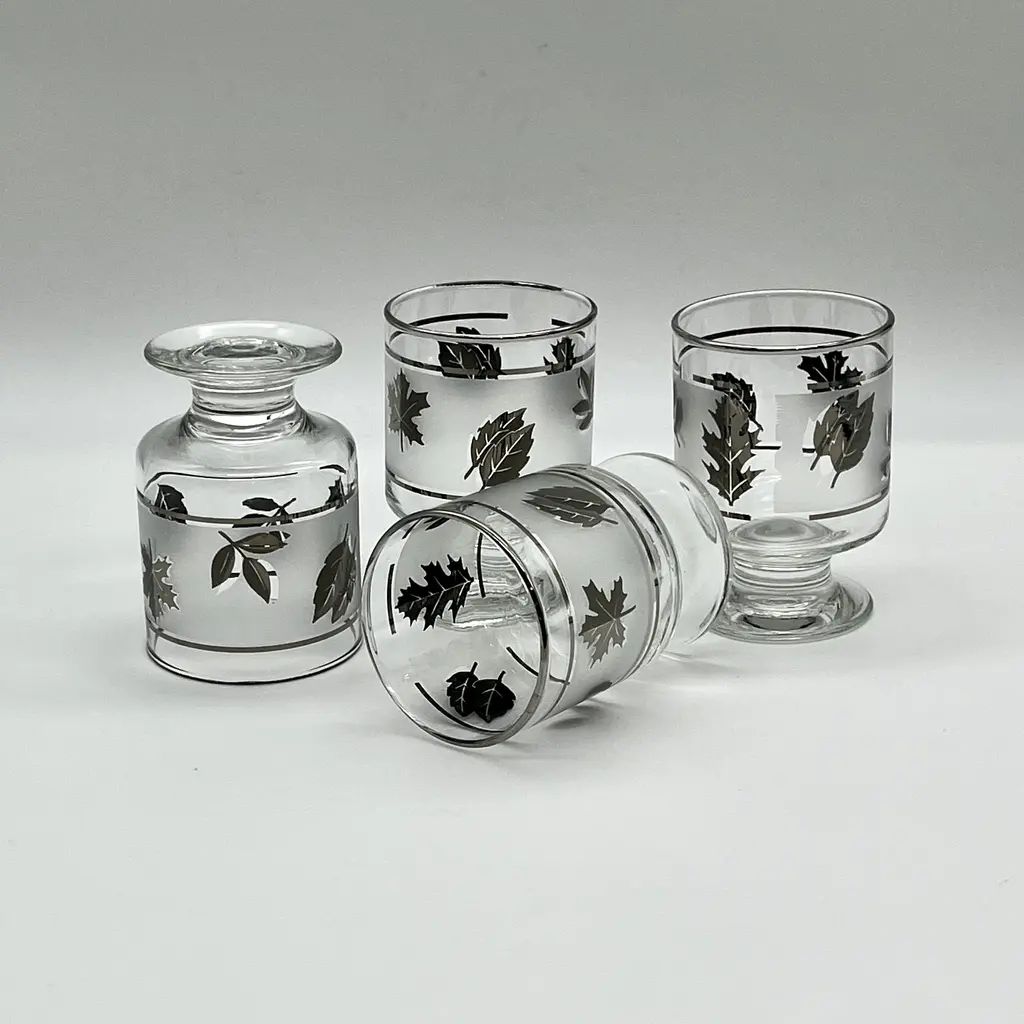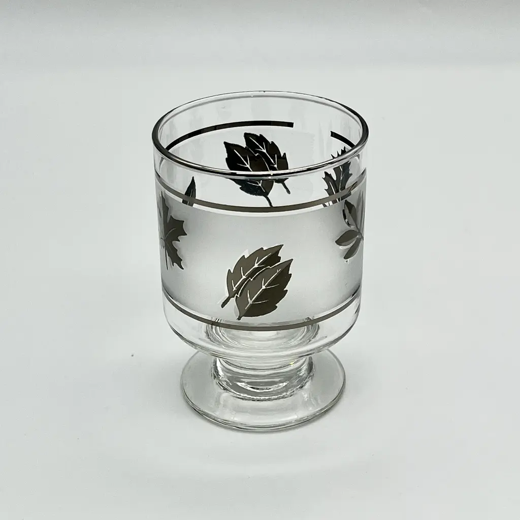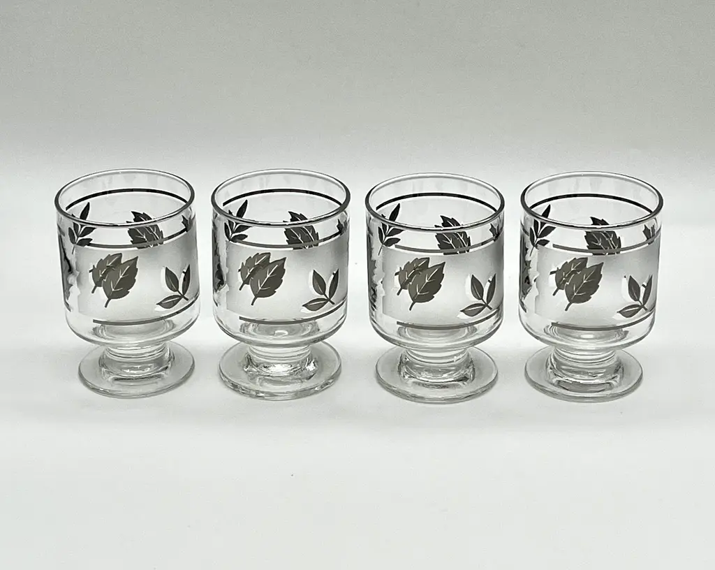 Set of four c. 1970s Mid-Century Modern small stemmed silver leaf frosted drinks glasses. Versatile drinkware for water, table wine, or mixed cocktails.