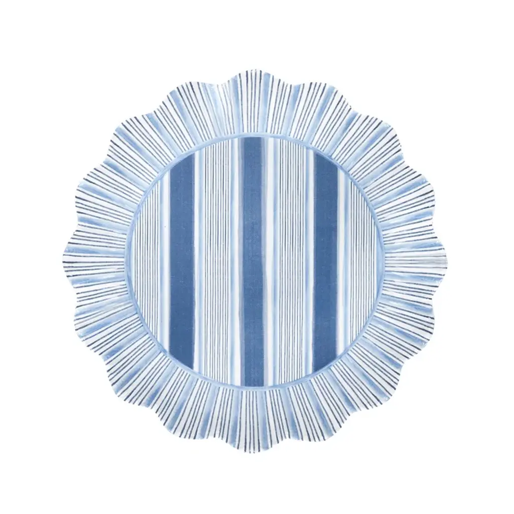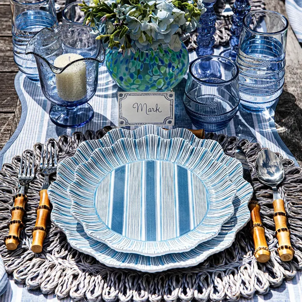 Reminiscent of a sunburst, we’ve added a radiant ruffle trim in vibrant and happy hues to the classic cabana stripe—making this chic and shatterproof plate set a splash more special, feminine, and fun.