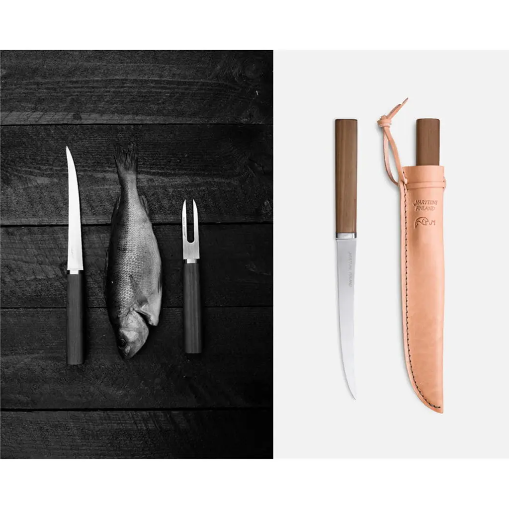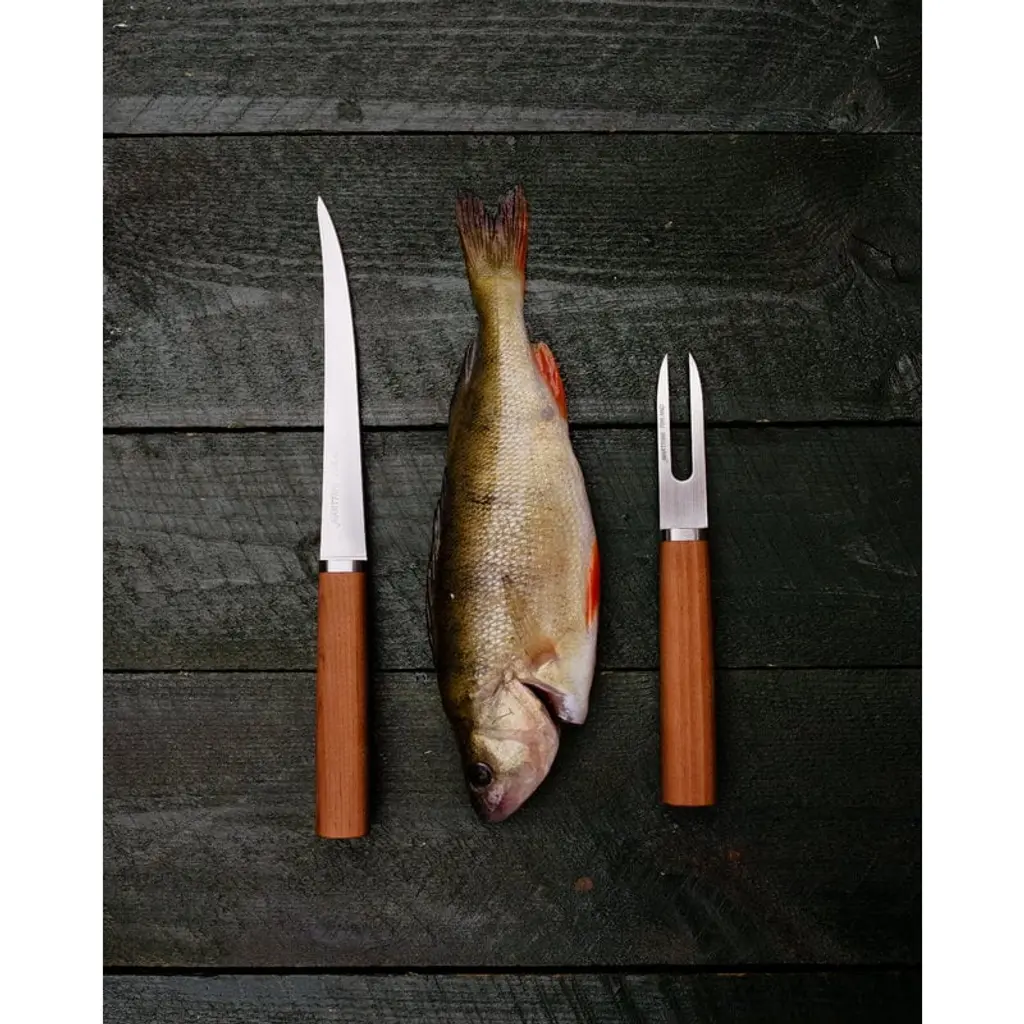 Marttiini's Cabin Chef filet knife is a top-quality tool for fileting fish, whether self-caught or from a counter. The fileting knife has a 6.1 in (15,5 cm) stainless steel blade, making it best suited for handling fish that weighs approximately 1 kilogram. The handle of the knife is shaped so that it feels comfortable and firm in the hand whatever the grip may be. In addition to the form, the handle’s material was also chosen for its ergonomic properties: thermally modified birch feels warm and pleasant to touch and its matte finish ensures a good grip even in wet conditions. The material is not only durable, but also ages beautifully. The Cabin Chef fileting knife is part of the eponymous knife collection, designed by Harri Koskinen, that fuses unpretentiously beautiful design with utmost functionality. Created in collaboration with Marttiini and top chef Pekka Terävä, the collection was inspired by the unique charm of Nordic nature: it offers all the knives you could need for handling nature’s gifts in the camping or cabin kitchen as well as when cooking at home. The Cabin Chef knives are made in Finland and come with a traditional natural leather sheath.