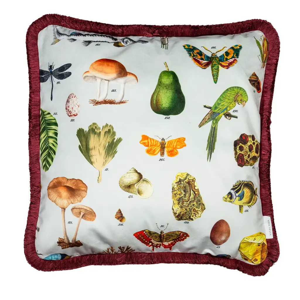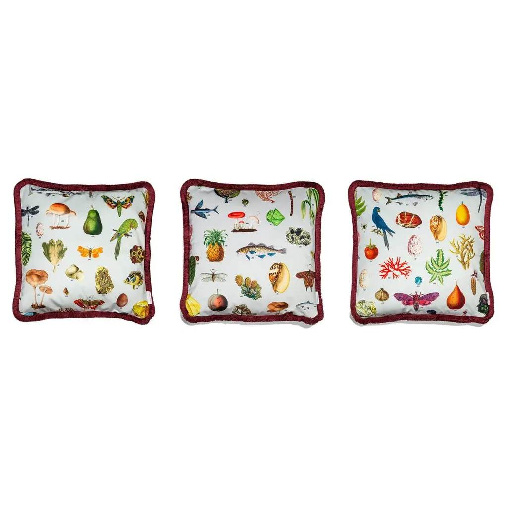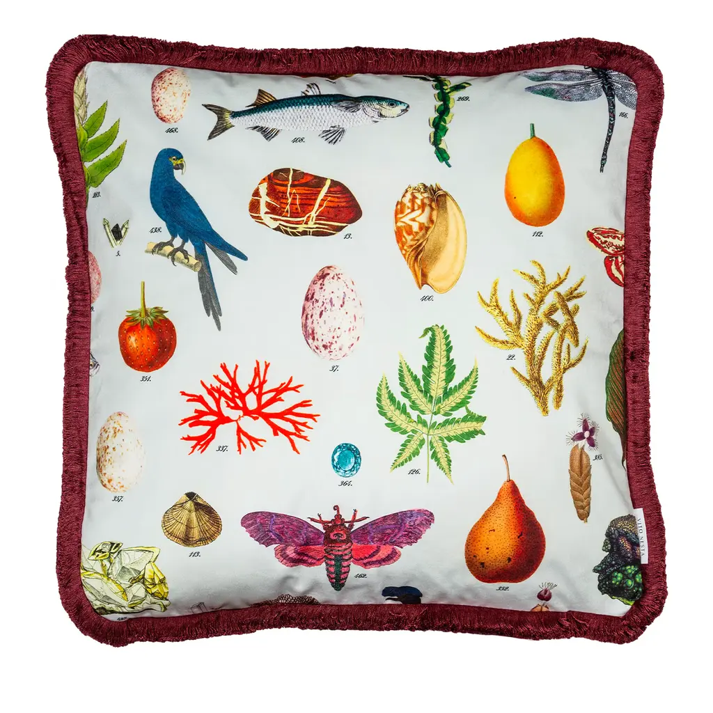Belonging to the Cabinet de Curiosités Collection, this oval platter is entirely handcrafted of ceramic and painted with a wide range of colorful botanical elements, bird species, minerals and shells.
