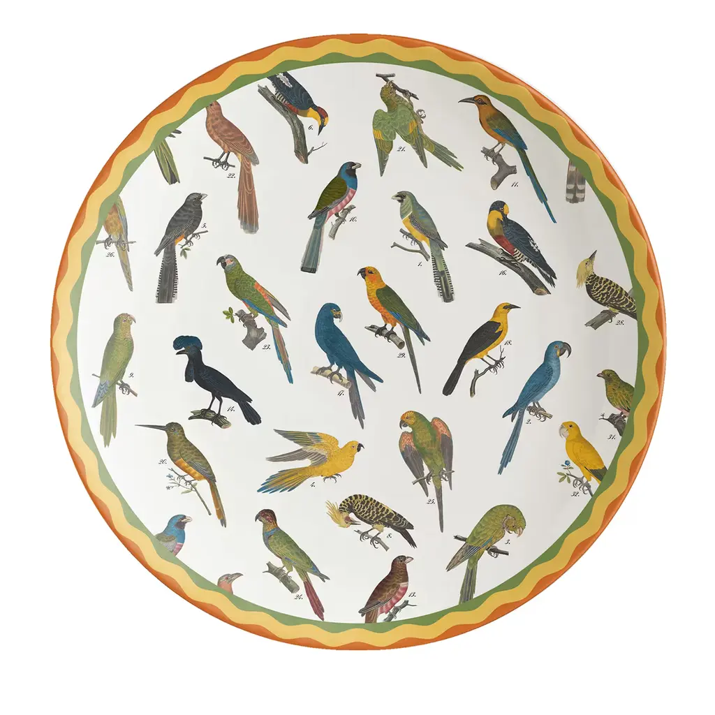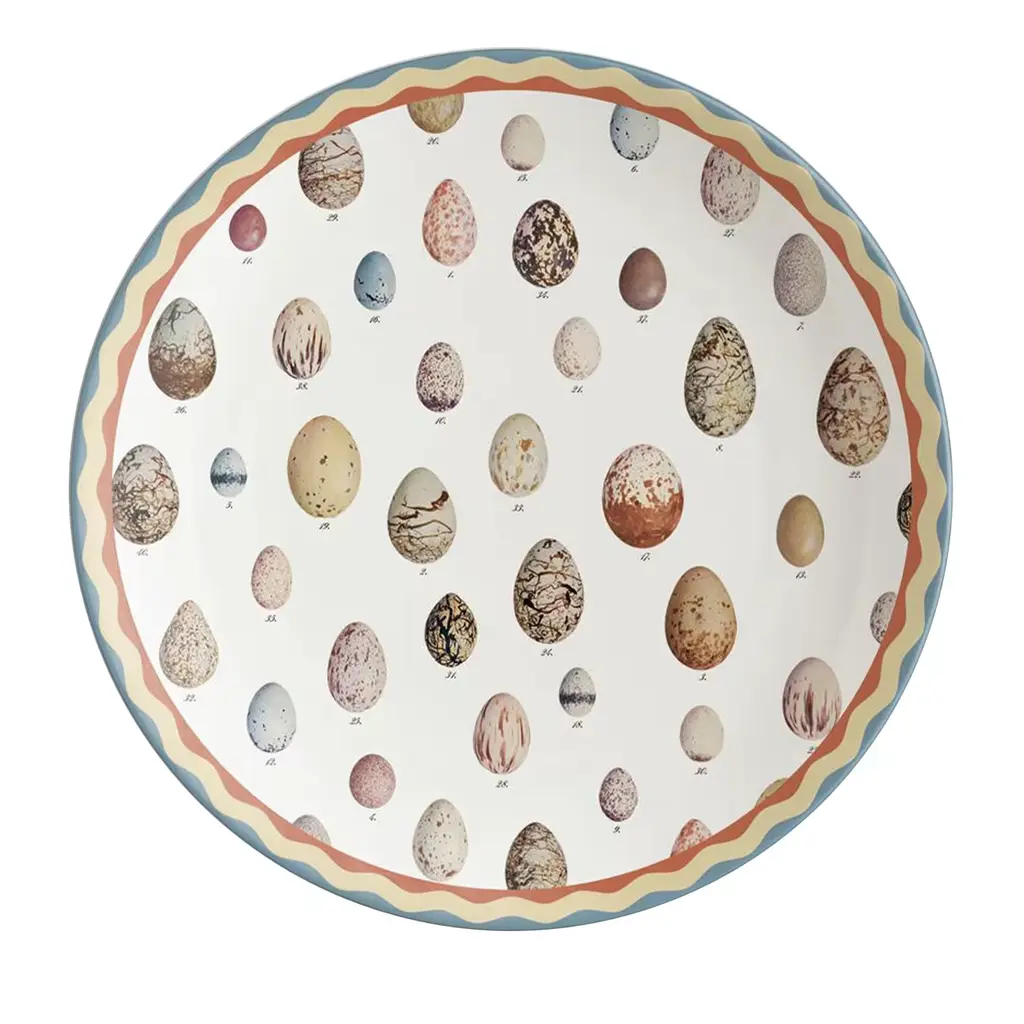 This gorgeous dinner plate from the Eggs series of the Cabinet de Curiosités Collection is a refined design of unprecedented charm: handcrafted of ceramic, it is exquisitely decorated with a captivating array of different egg species, and a lively colored rim combining orange, yellow, and turquoise shades.