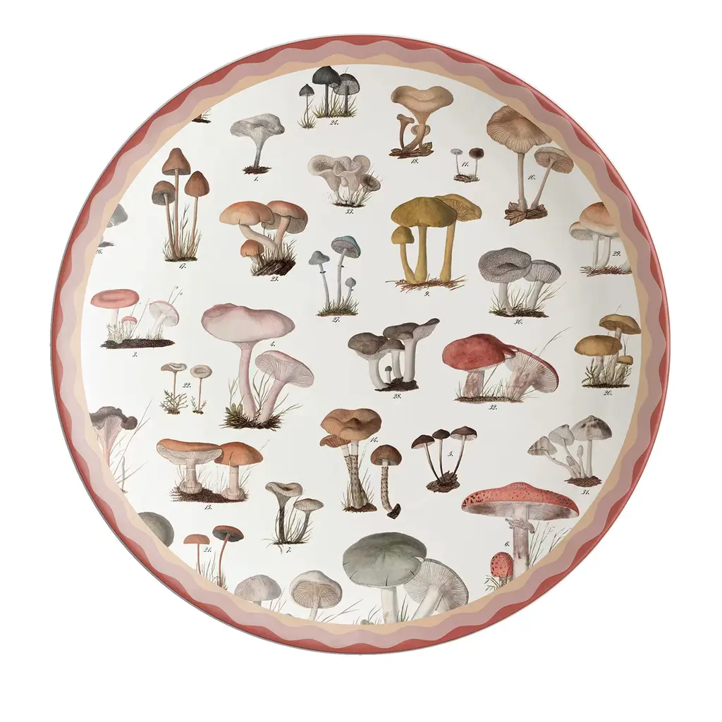 This stupendous dinner plate is marked by an extraordinary handmade decoration of a vast array of mushroom species rendered in a striking botanical-like way, and enhanced with a sublime, captivating palette of rose and red shades. A celebration of the natural world, it is deftly handcrafted of ceramic.