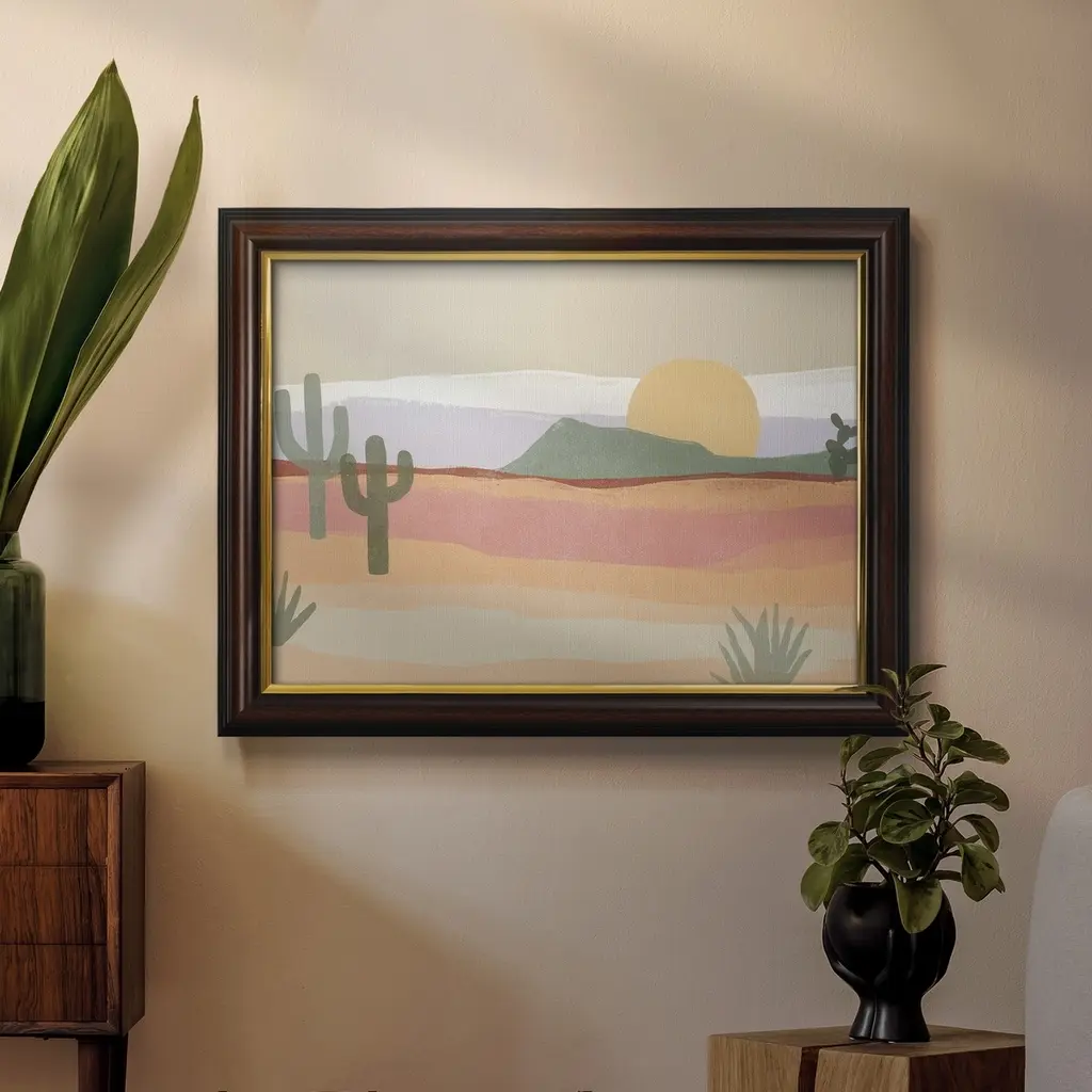Cactus Plateau I Premium Framed Canvas- Ready to Hang A Premium Framed Canvas created to last. Framed in distressed wood and available in an array of sizes and colors Featuring a beveled a solid wood stretcher bar, each piece comes ready to hand 3 SIZES AVAILABLE 16''X20'' - Overall Size 18'X27'' - Overall Size 24''x36'' - Overall Size Each piece is made to order. Each piece comes with hanging hardware. Made in the USA Ready to Hang Giclee Paper Print Acrylic Glass Beveled Matt Board