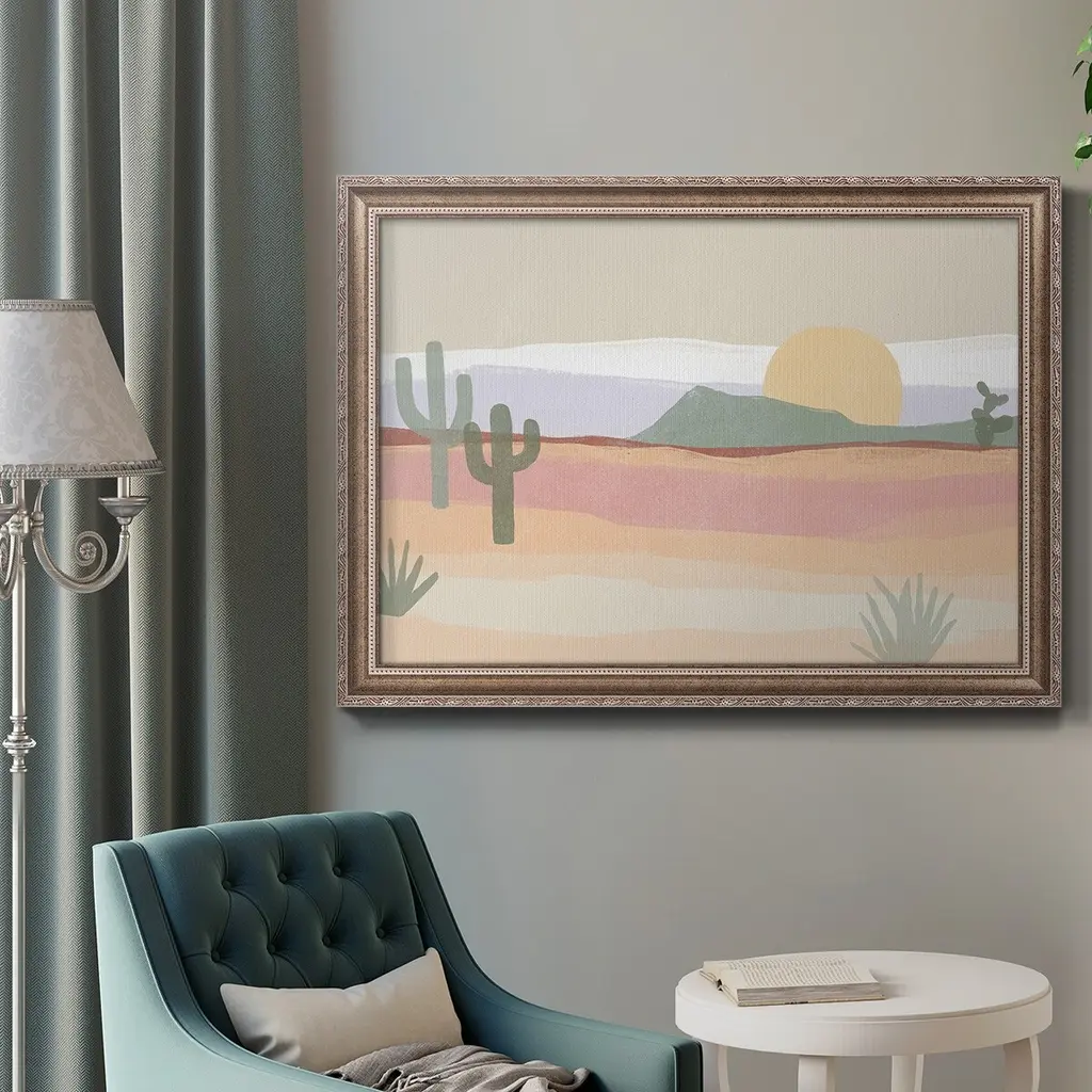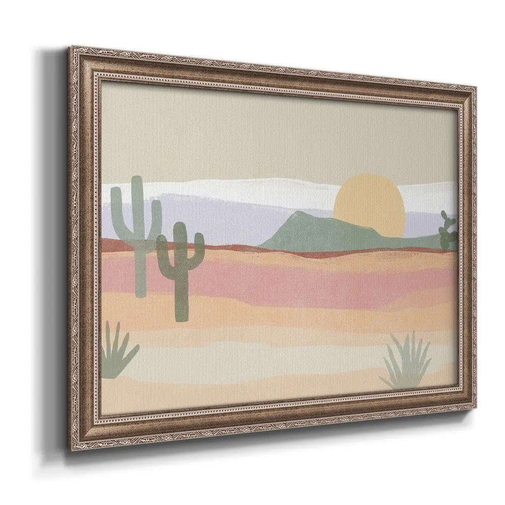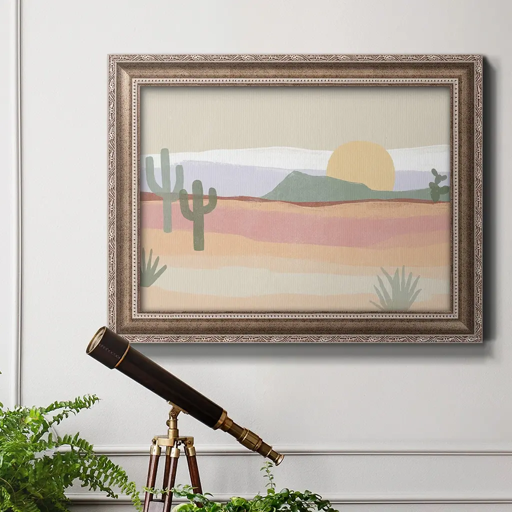 Cactus Plateau I Premium Framed Canvas- Ready to Hang A Premium Framed Canvas created to last. Framed in distressed wood and available in an array of sizes and colors Featuring a beveled a solid wood stretcher bar, each piece comes ready to hand 3 SIZES AVAILABLE 16''X20'' - Overall Size 18'X27'' - Overall Size 24''x36'' - Overall Size Each piece is made to order. Each piece comes with hanging hardware. Made in the USA Ready to Hang Giclee Paper Print Acrylic Glass Beveled Matt Board