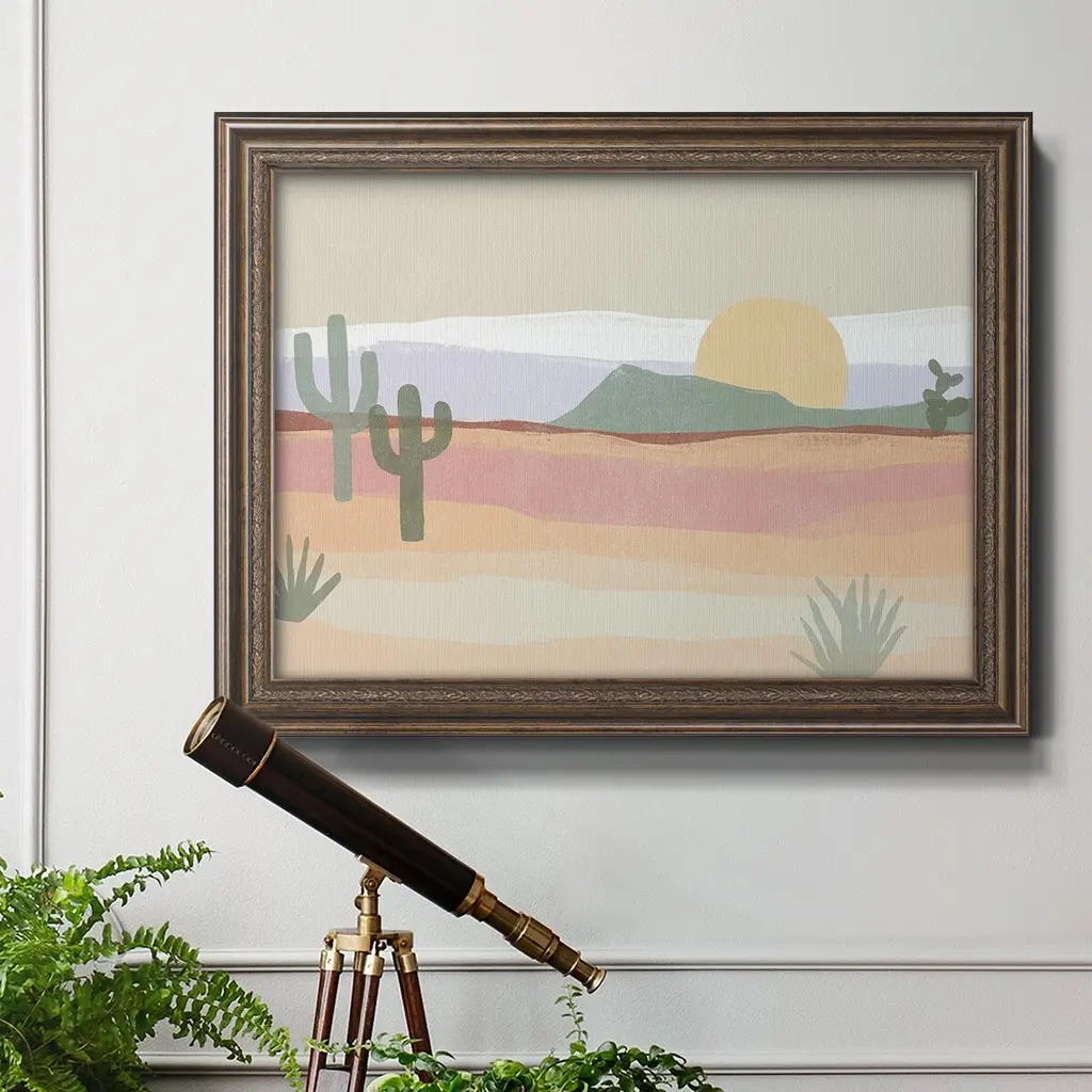 Cactus Plateau I Premium Framed Canvas- Ready to Hang A Premium Framed Canvas created to last. Framed in distressed wood and available in an array of sizes and colors Featuring a beveled a solid wood stretcher bar, each piece comes ready to hand 3 SIZES AVAILABLE 16''X20'' - Overall Size 18'X27'' - Overall Size 24''x36'' - Overall Size Each piece is made to order. Each piece comes with hanging hardware. Made in the USA Ready to Hang Giclee Paper Print Acrylic Glass Beveled Matt Board
