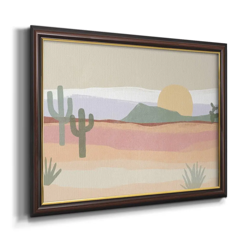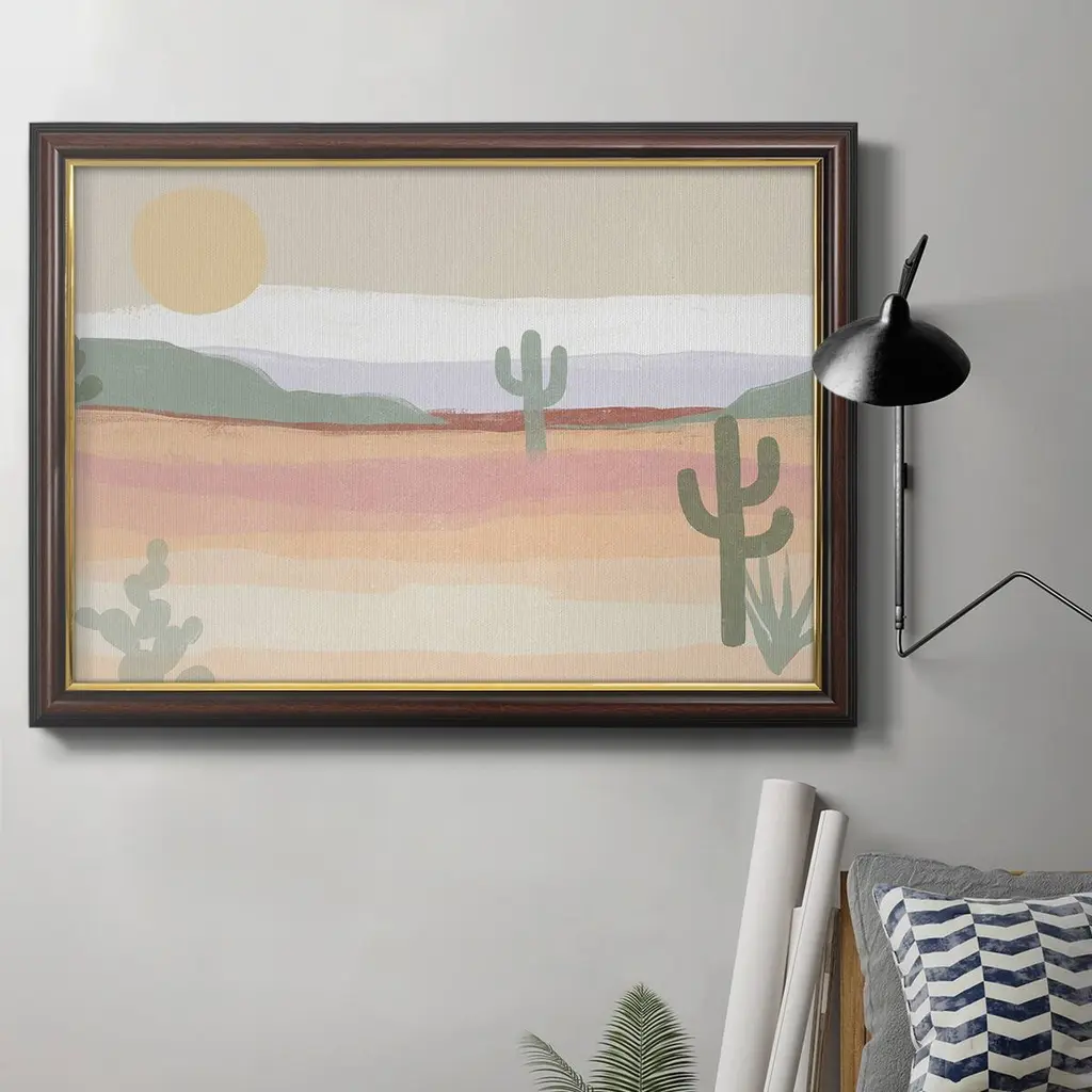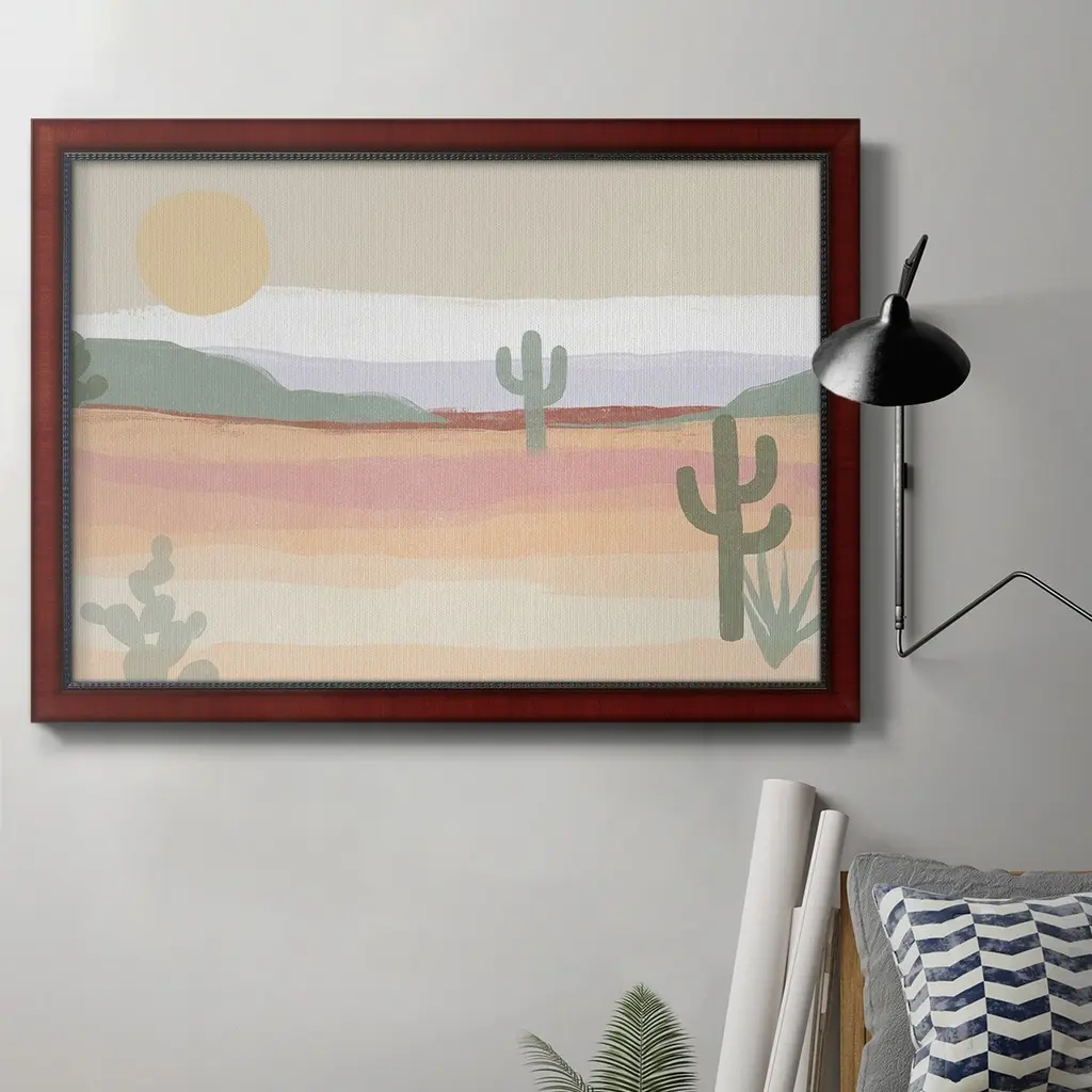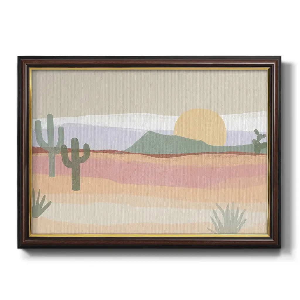 Cactus Plateau I Premium Framed Canvas- Ready to Hang A Premium Framed Canvas created to last. Framed in distressed wood and available in an array of sizes and colors Featuring a beveled a solid wood stretcher bar, each piece comes ready to hand 3 SIZES AVAILABLE 16''X20'' - Overall Size 18'X27'' - Overall Size 24''x36'' - Overall Size Each piece is made to order. Each piece comes with hanging hardware. Made in the USA Ready to Hang Giclee Paper Print Acrylic Glass Beveled Matt Board