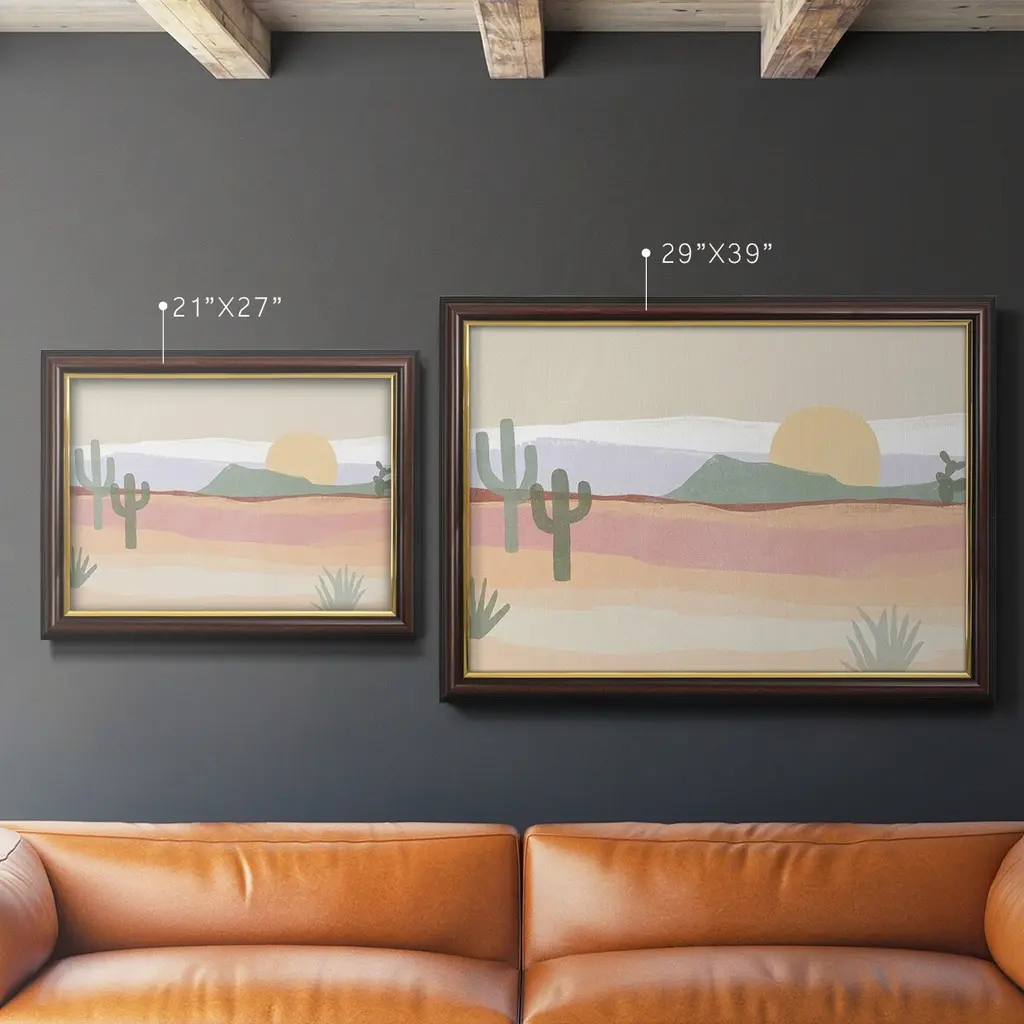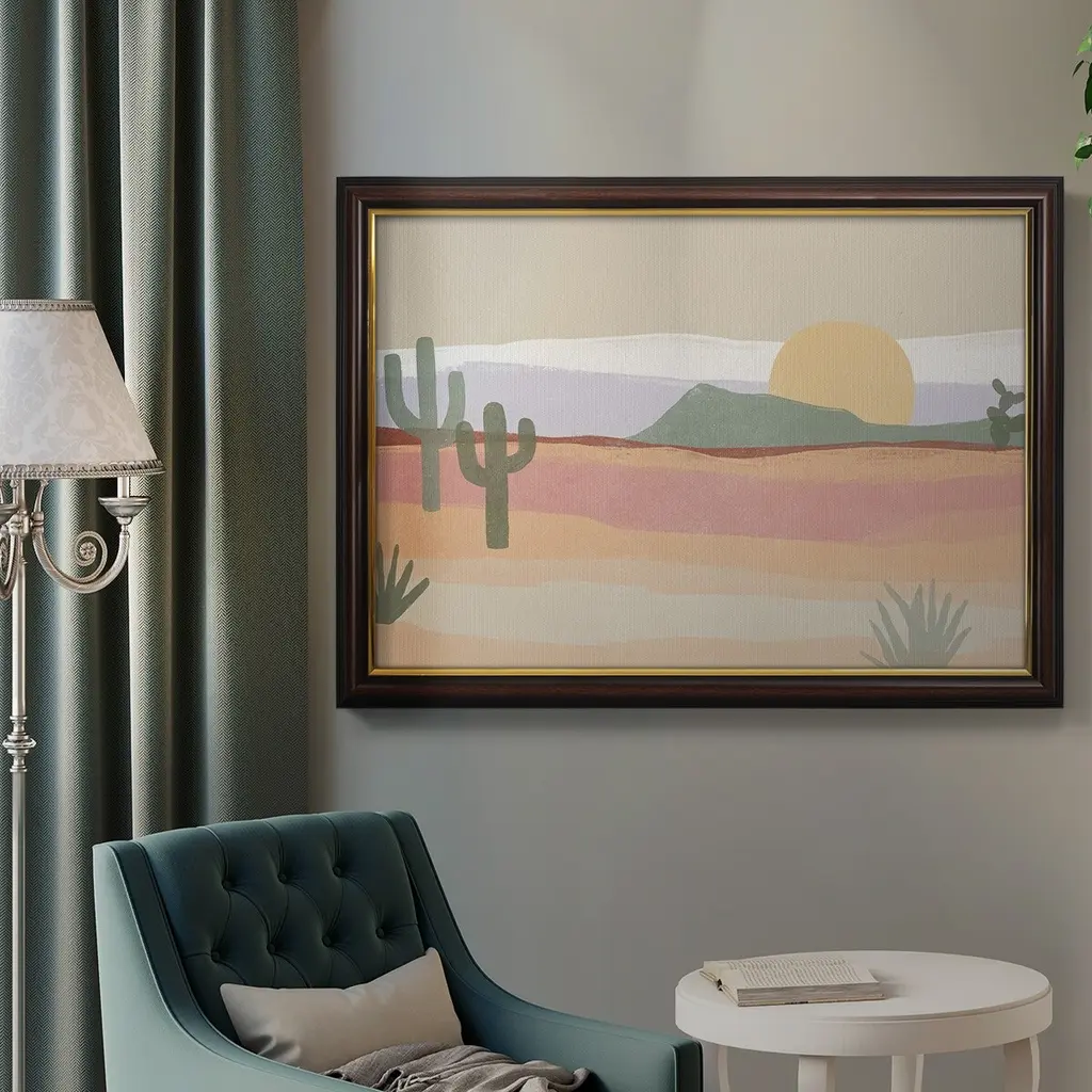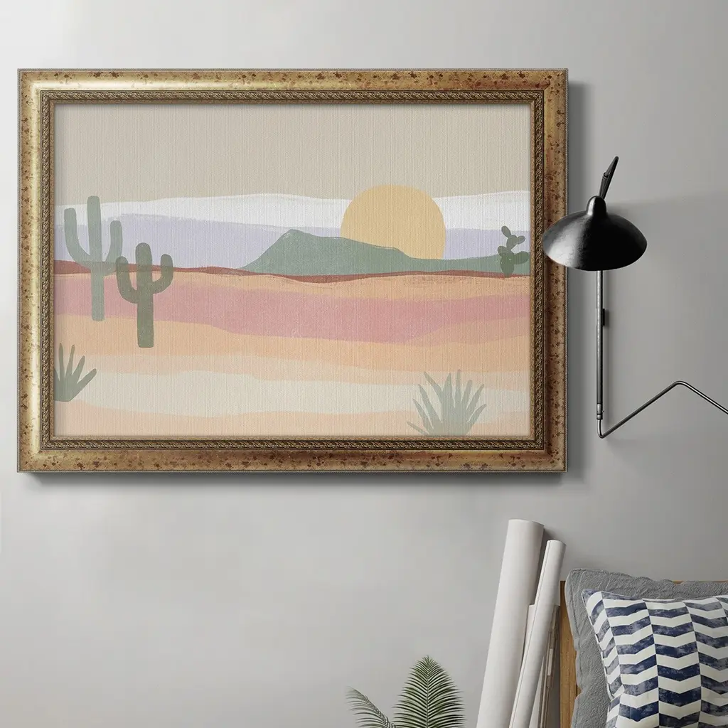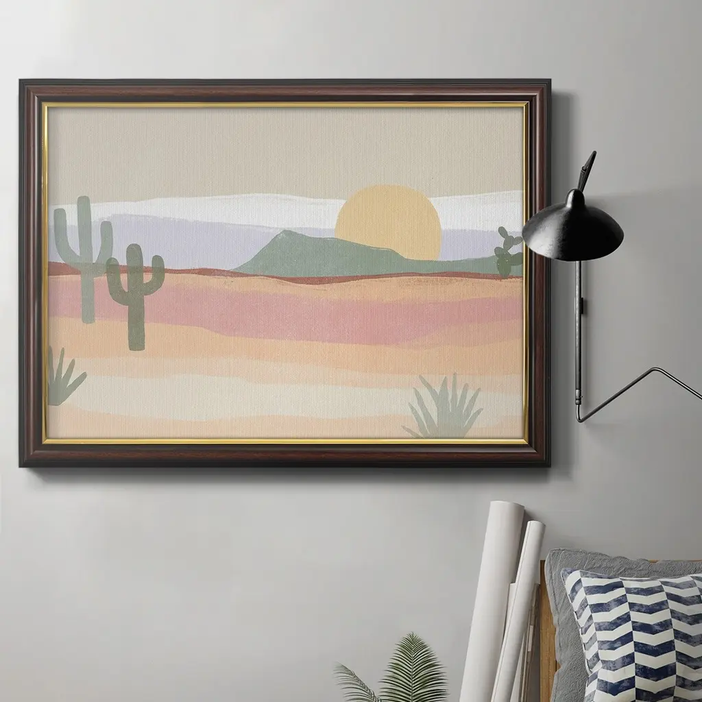 Cactus Plateau I Premium Framed Canvas- Ready to Hang A Premium Framed Canvas created to last. Framed in distressed wood and available in an array of sizes and colors Featuring a beveled a solid wood stretcher bar, each piece comes ready to hand 3 SIZES AVAILABLE 16''X20'' - Overall Size 18'X27'' - Overall Size 24''x36'' - Overall Size Each piece is made to order. Each piece comes with hanging hardware. Made in the USA Ready to Hang Giclee Paper Print Acrylic Glass Beveled Matt Board