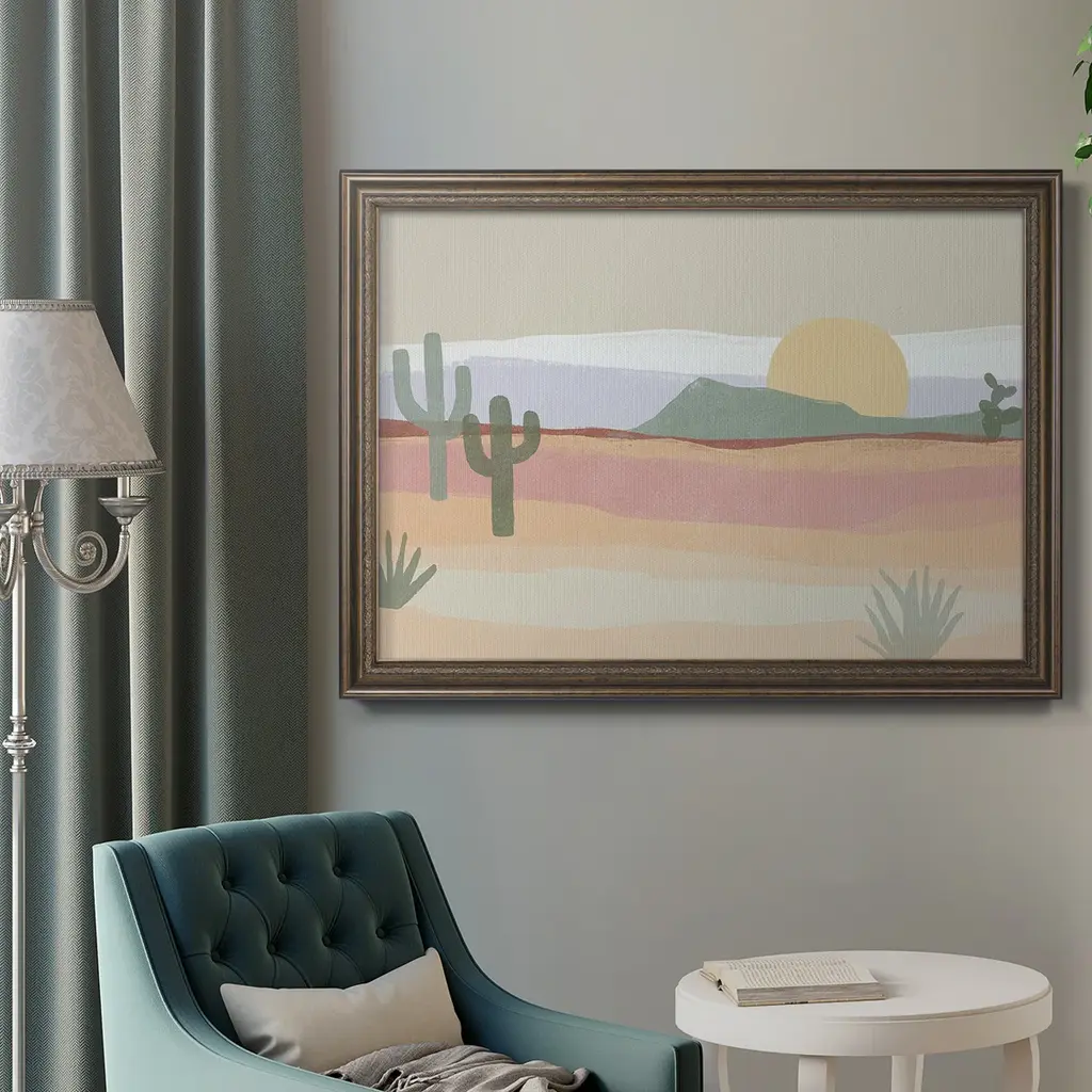 Cactus Plateau I Premium Framed Canvas- Ready to Hang A Premium Framed Canvas created to last. Framed in distressed wood and available in an array of sizes and colors Featuring a beveled a solid wood stretcher bar, each piece comes ready to hand 3 SIZES AVAILABLE 16''X20'' - Overall Size 18'X27'' - Overall Size 24''x36'' - Overall Size Each piece is made to order. Each piece comes with hanging hardware. Made in the USA Ready to Hang Giclee Paper Print Acrylic Glass Beveled Matt Board