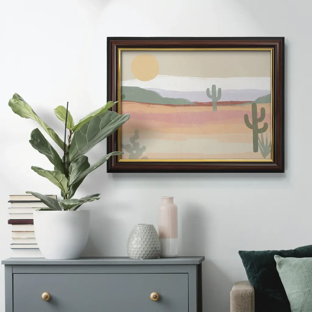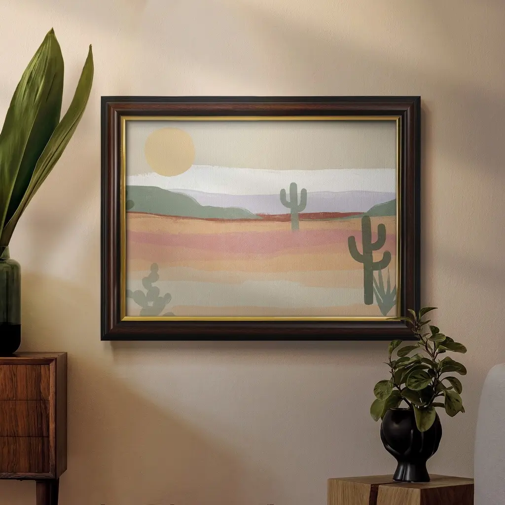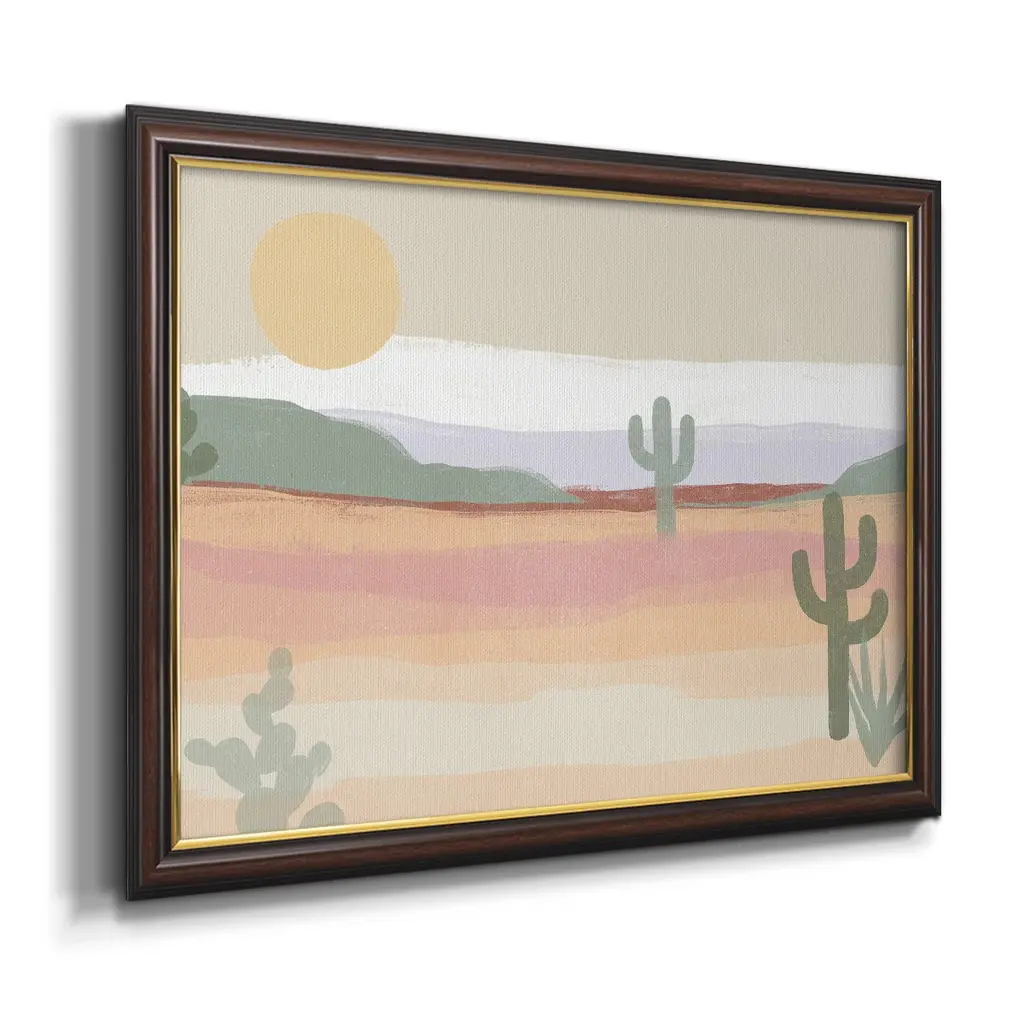 Cactus Plateau II Premium Framed Canvas- Ready to Hang A Premium Framed Canvas created to last. Framed in distressed wood and available in an array of sizes and colors Featuring a beveled a solid wood stretcher bar, each piece comes ready to hand 3 SIZES AVAILABLE 16''X20'' - Overall Size 18'X27'' - Overall Size 24''x36'' - Overall Size Each piece is made to order. Each piece comes with hanging hardware. Made in the USA Ready to Hang Giclee Paper Print Acrylic Glass Beveled Matt Board