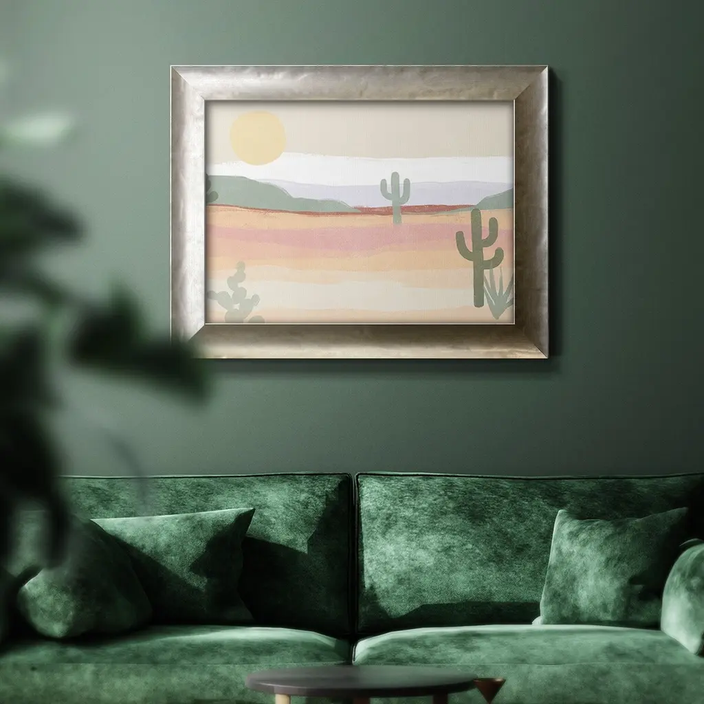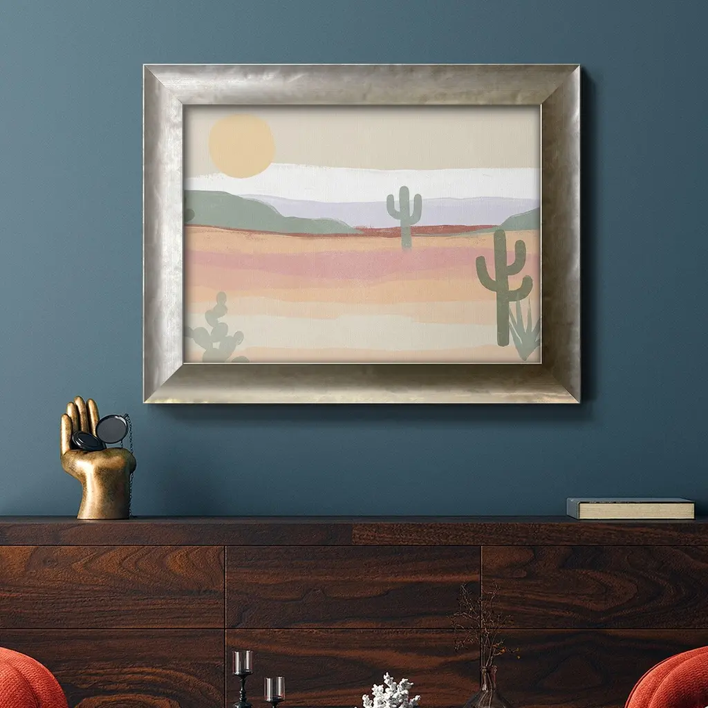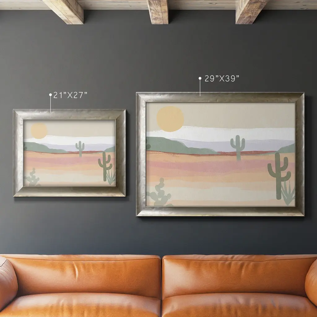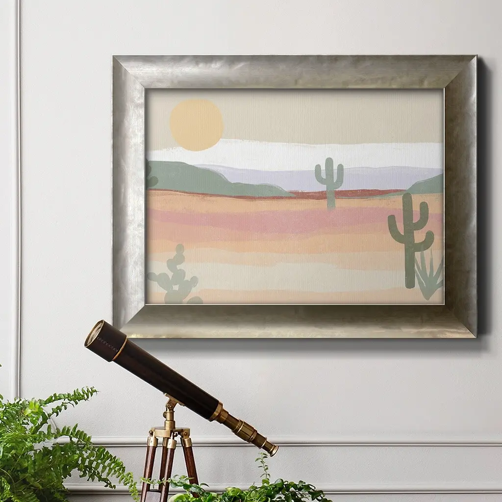 Cactus Plateau II Premium Framed Canvas- Ready to Hang A Premium Framed Canvas created to last. Framed in distressed wood and available in an array of sizes and colors Featuring a beveled a solid wood stretcher bar, each piece comes ready to hand 3 SIZES AVAILABLE 16''X20'' - Overall Size 18'X27'' - Overall Size 24''x36'' - Overall Size Each piece is made to order. Each piece comes with hanging hardware. Made in the USA Ready to Hang Giclee Paper Print Acrylic Glass Beveled Matt Board