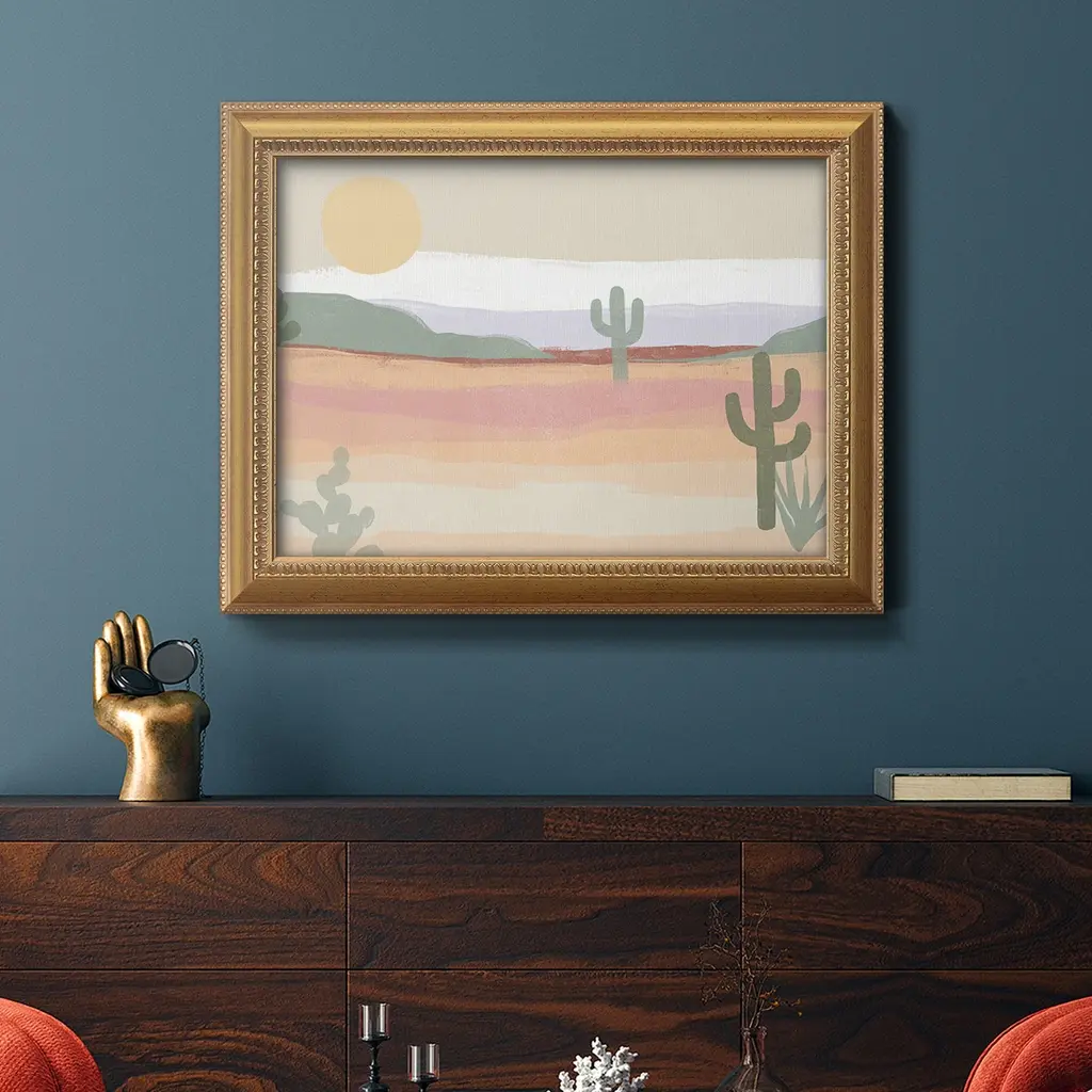 Cactus Plateau II Premium Framed Canvas- Ready to Hang A Premium Framed Canvas created to last. Framed in distressed wood and available in an array of sizes and colors Featuring a beveled a solid wood stretcher bar, each piece comes ready to hand 3 SIZES AVAILABLE 16''X20'' - Overall Size 18'X27'' - Overall Size 24''x36'' - Overall Size Each piece is made to order. Each piece comes with hanging hardware. Made in the USA Ready to Hang Giclee Paper Print Acrylic Glass Beveled Matt Board