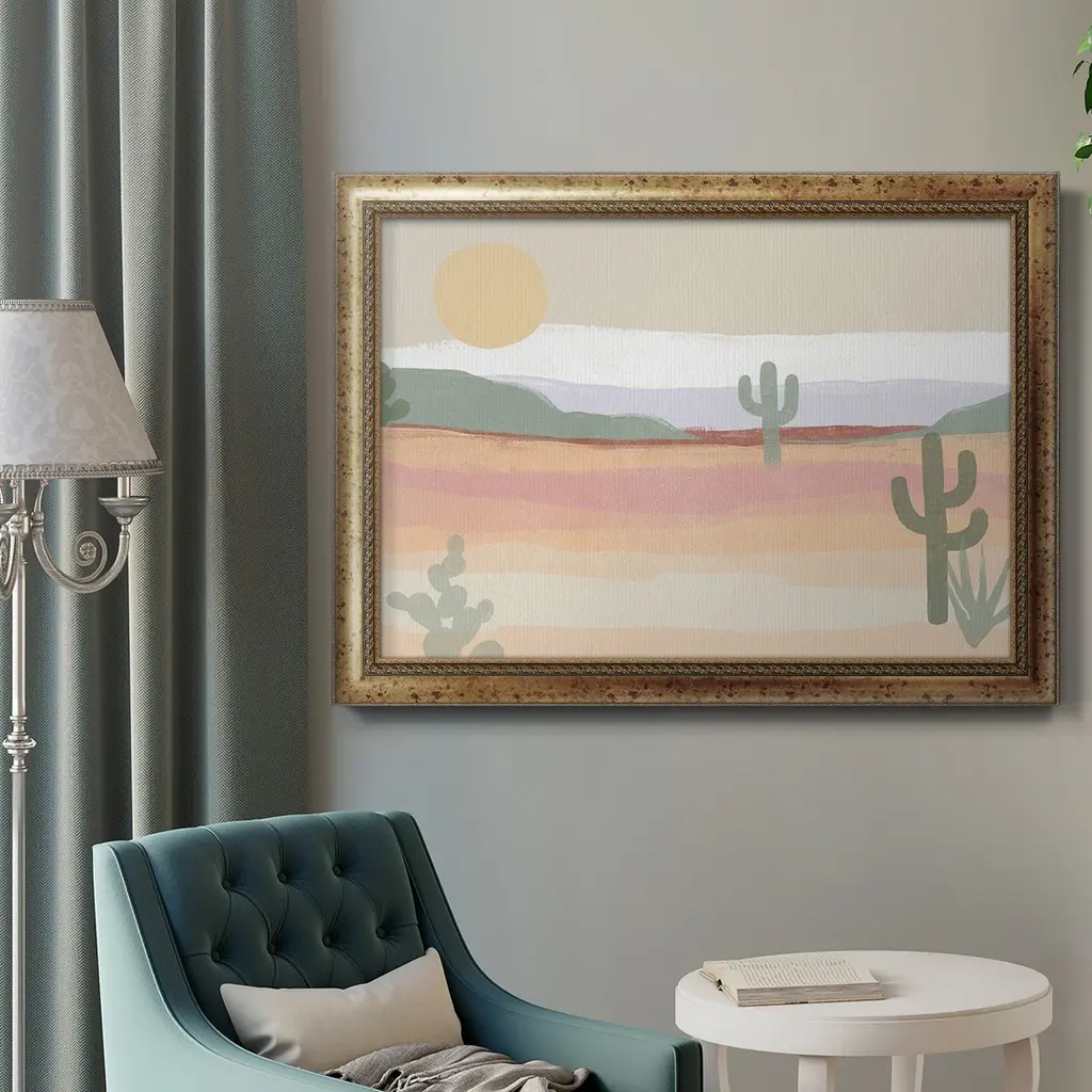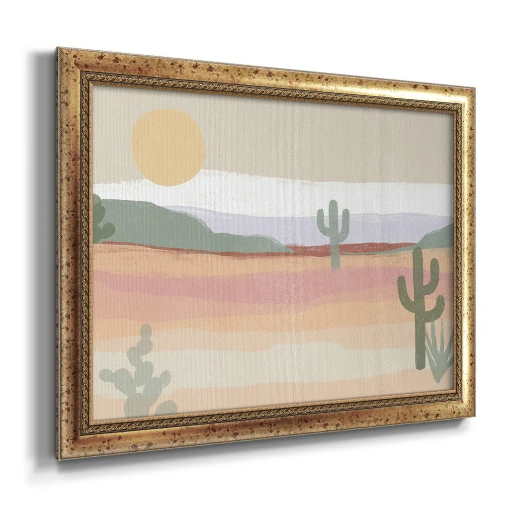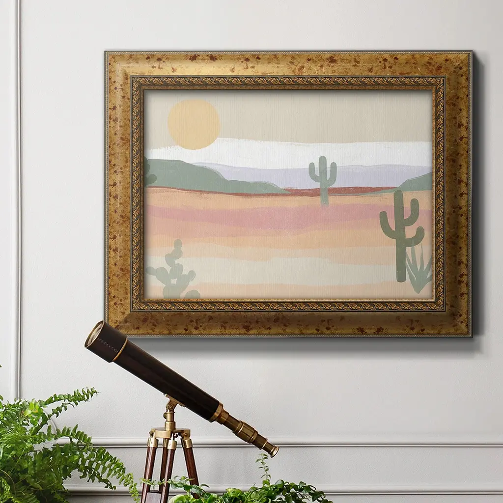 Cactus Plateau II Premium Framed Canvas- Ready to Hang A Premium Framed Canvas created to last. Framed in distressed wood and available in an array of sizes and colors Featuring a beveled a solid wood stretcher bar, each piece comes ready to hand 3 SIZES AVAILABLE 16''X20'' - Overall Size 18'X27'' - Overall Size 24''x36'' - Overall Size Each piece is made to order. Each piece comes with hanging hardware. Made in the USA Ready to Hang Giclee Paper Print Acrylic Glass Beveled Matt Board