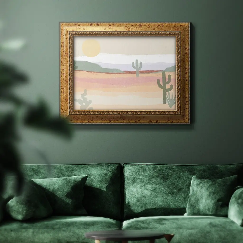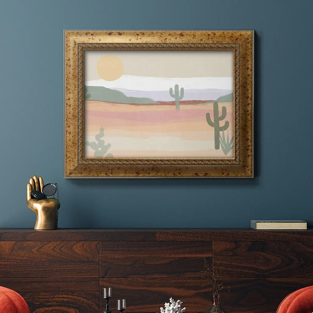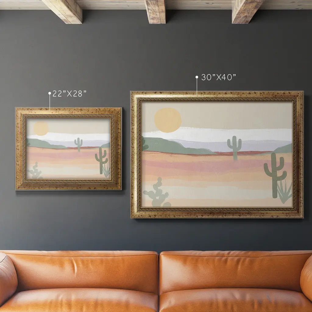 Cactus Plateau II Premium Framed Canvas- Ready to Hang A Premium Framed Canvas created to last. Framed in distressed wood and available in an array of sizes and colors Featuring a beveled a solid wood stretcher bar, each piece comes ready to hand 3 SIZES AVAILABLE 16''X20'' - Overall Size 18'X27'' - Overall Size 24''x36'' - Overall Size Each piece is made to order. Each piece comes with hanging hardware. Made in the USA Ready to Hang Giclee Paper Print Acrylic Glass Beveled Matt Board