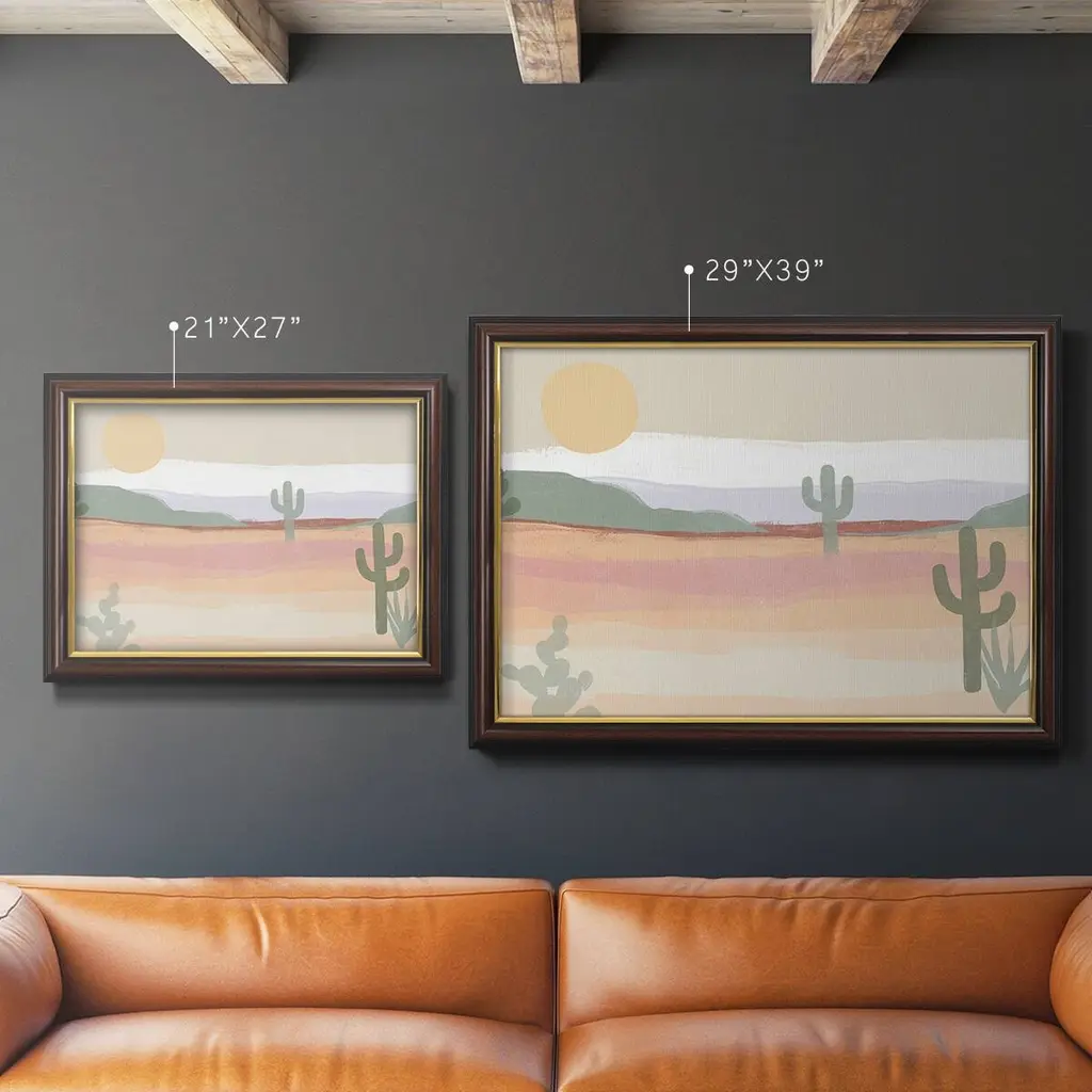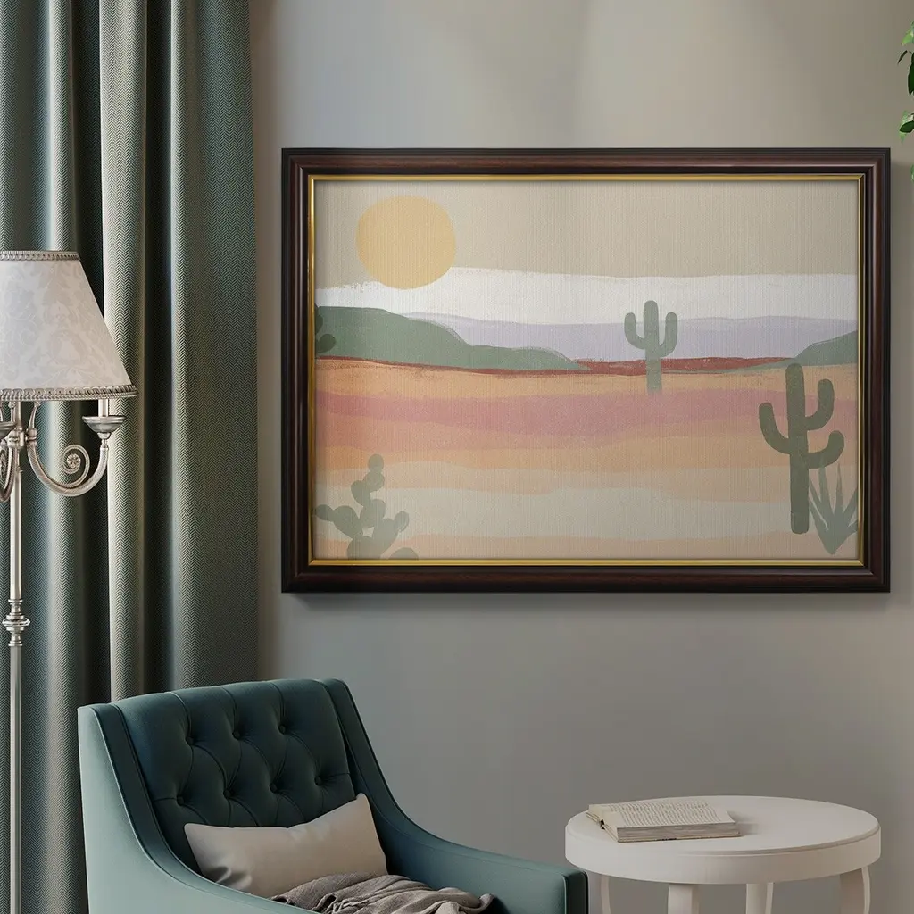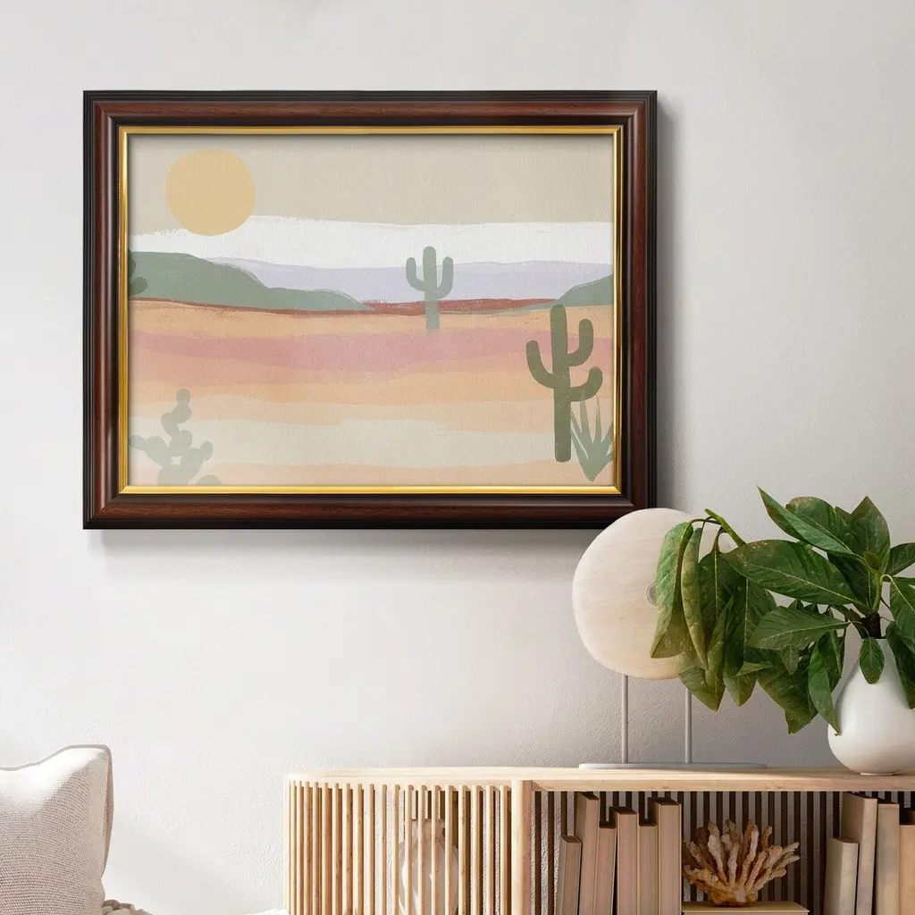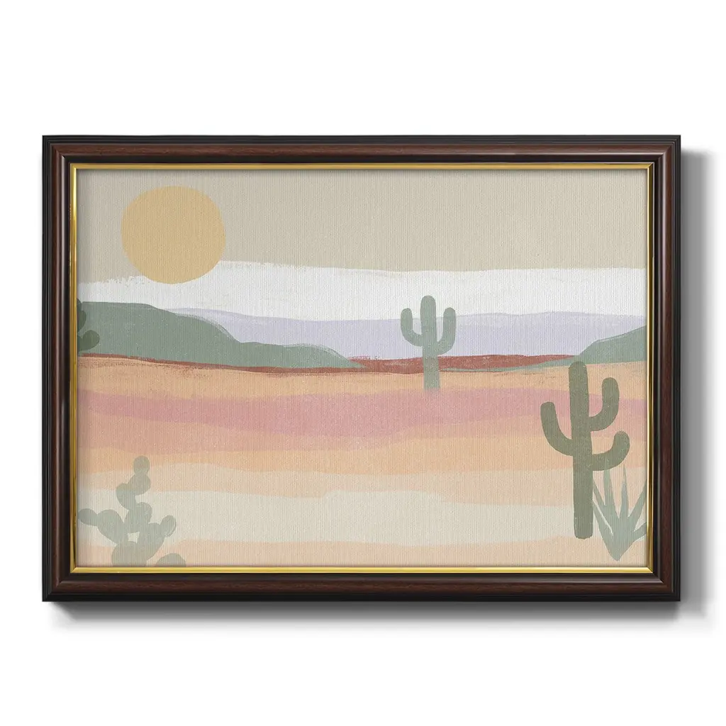 Cactus Plateau II Premium Framed Canvas- Ready to Hang A Premium Framed Canvas created to last. Framed in distressed wood and available in an array of sizes and colors Featuring a beveled a solid wood stretcher bar, each piece comes ready to hand 3 SIZES AVAILABLE 16''X20'' - Overall Size 18'X27'' - Overall Size 24''x36'' - Overall Size Each piece is made to order. Each piece comes with hanging hardware. Made in the USA Ready to Hang Giclee Paper Print Acrylic Glass Beveled Matt Board