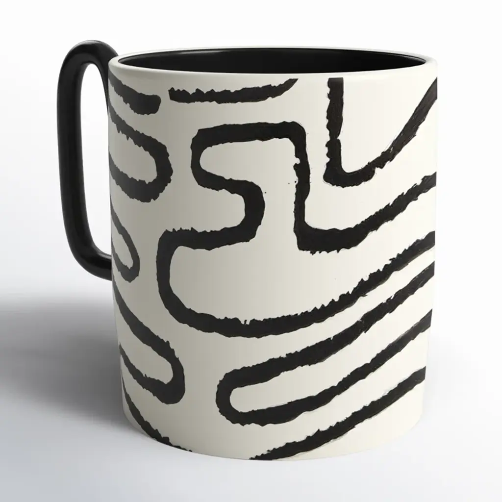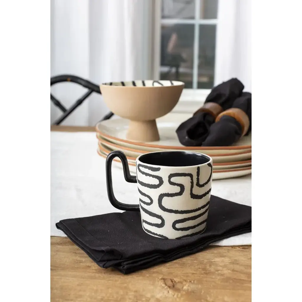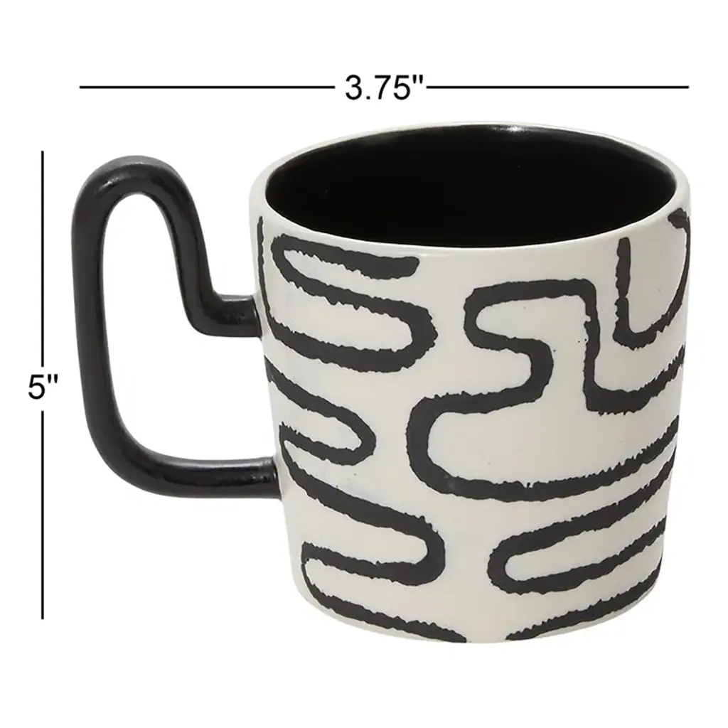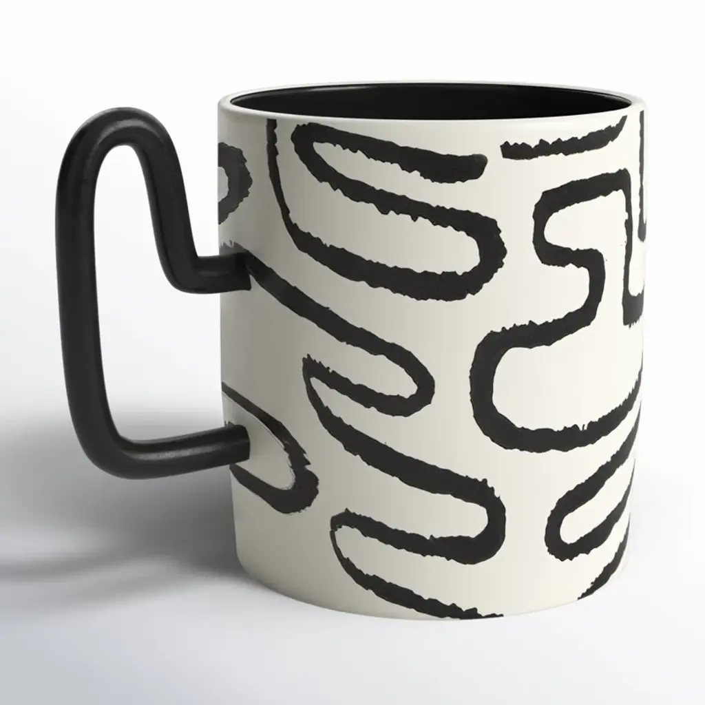 The Caigan mug features a simple black finish on the inside and a fun hand-painted black and white squiggle design on the outside. A unique squiggle handle completes the look, making the Caigan mug a modern way to sip your favorite coffee or tea. Holds 12 fluid ounces.