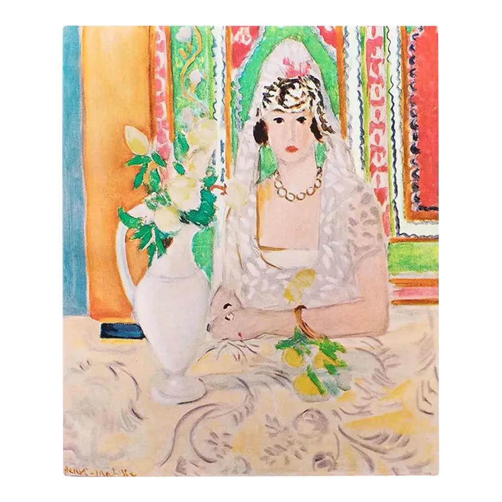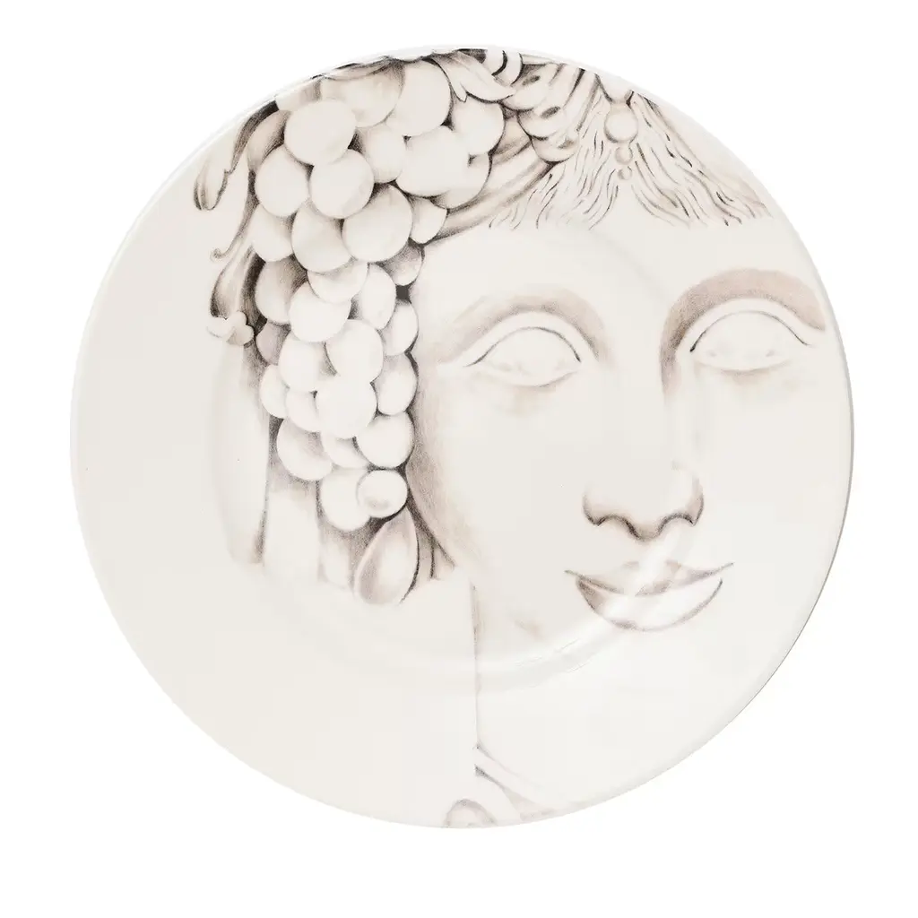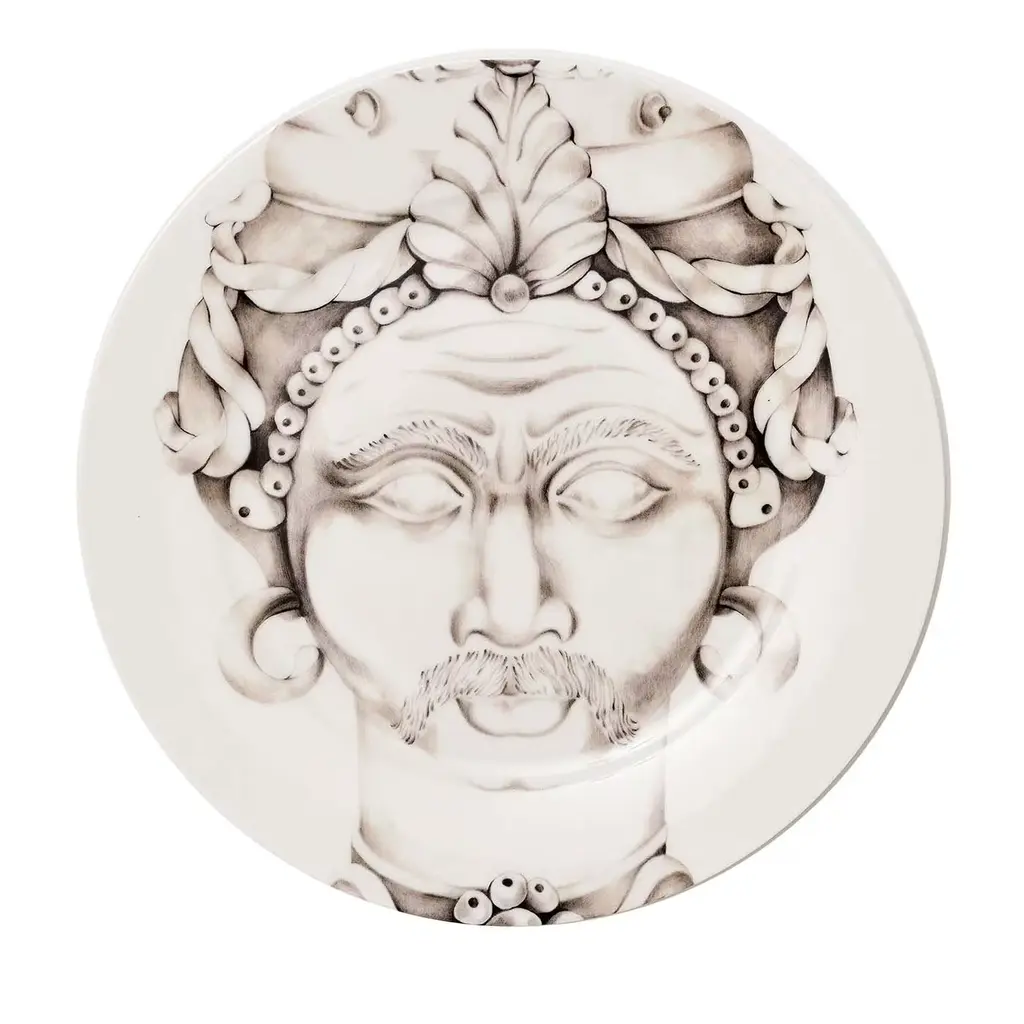 This porcelain dinner plate is part of the Cairo collection, inspired by the landscape of North Africa and the Berber culture. In this design, one of six different ones, the black and white vintage image of a Berber woman adds a refined accent to the piece showcasing characteristic jewelry and headpiece, while a garland of blooming flowers and oranges surrounds the portrait, for a splash of vivid colors to complement the pale yellow background.