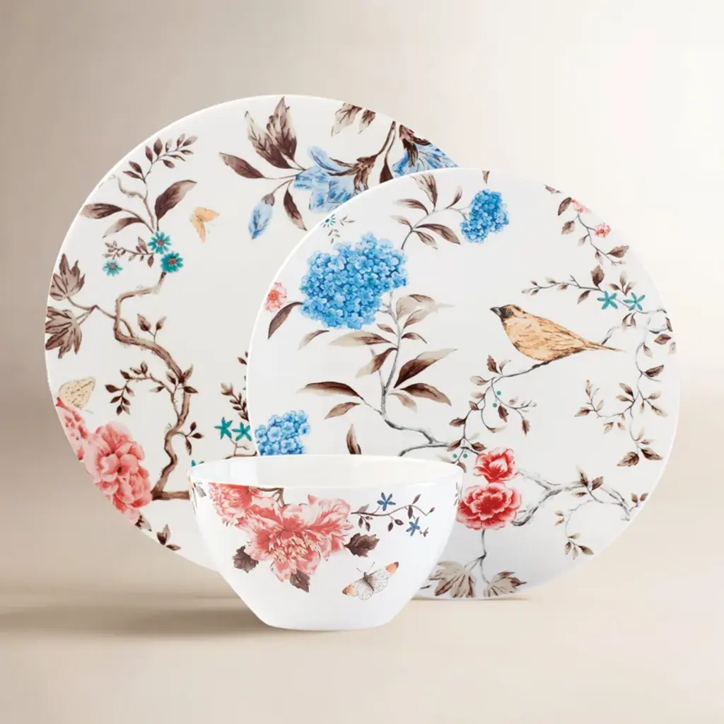 A delicate pale blue background is the canvas for the opulent decoration that graces this stunning porcelain dessert plate, part of the Cairo collection. A celebration of the North African landscape, this series combines colorful blooming flowers and luxuriant vegetation to create a sensual ambiance that is refined and suitable for any special occasion. Either with identical ones or combined with the other five designs, this eclectic plate will make a statement on any dining table.