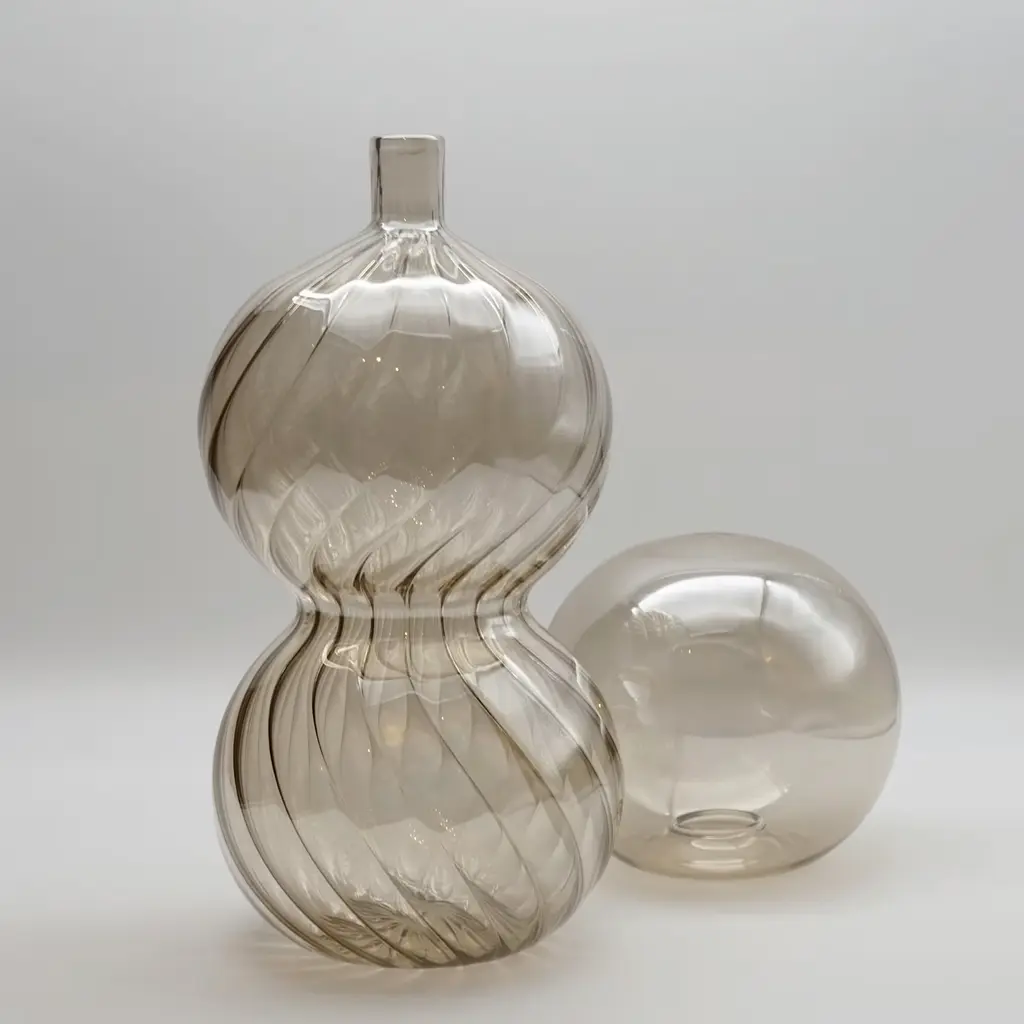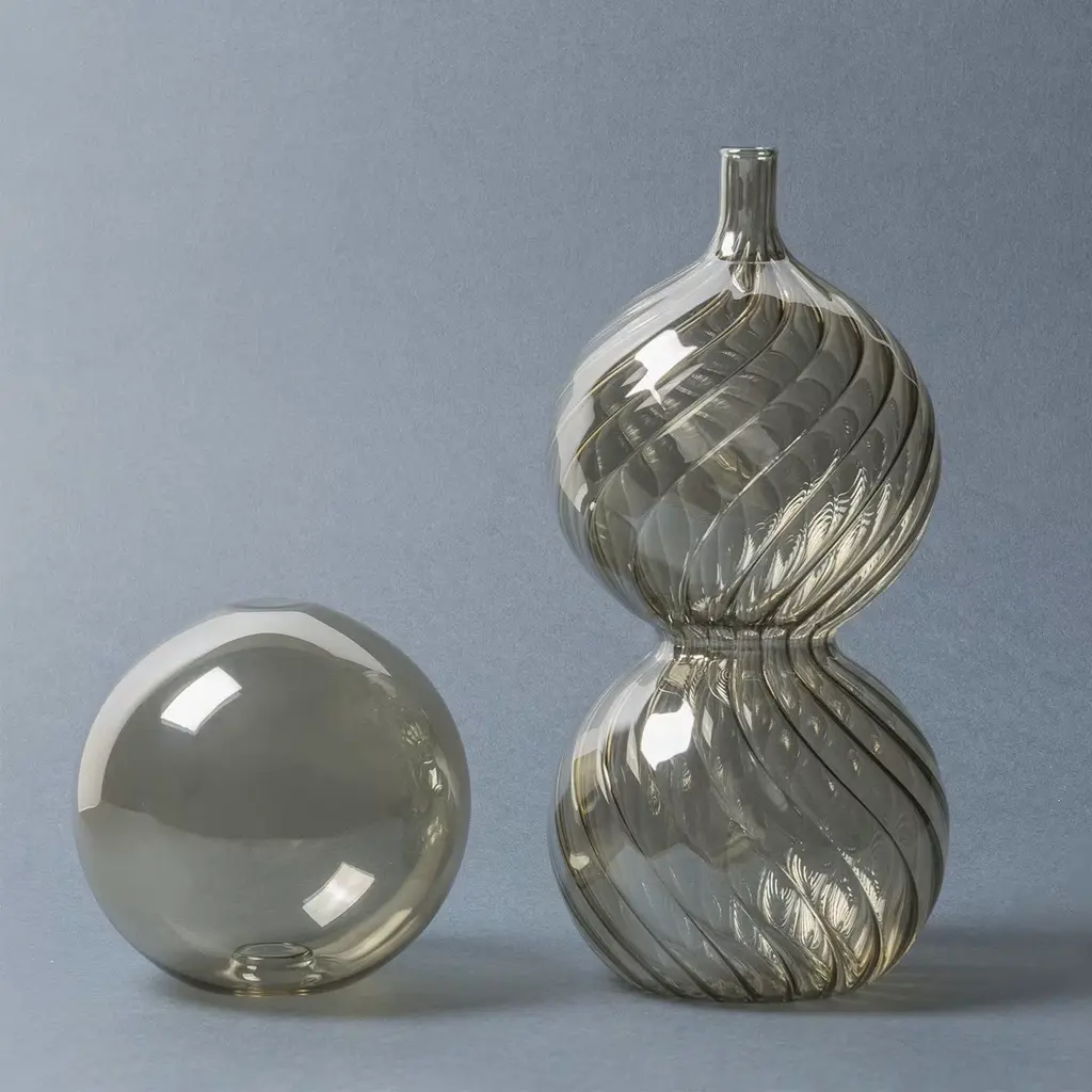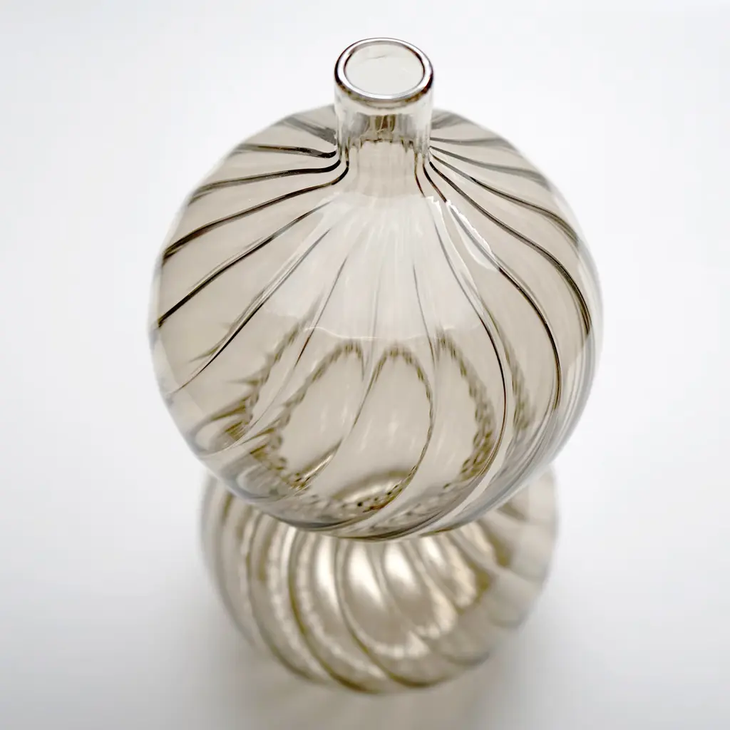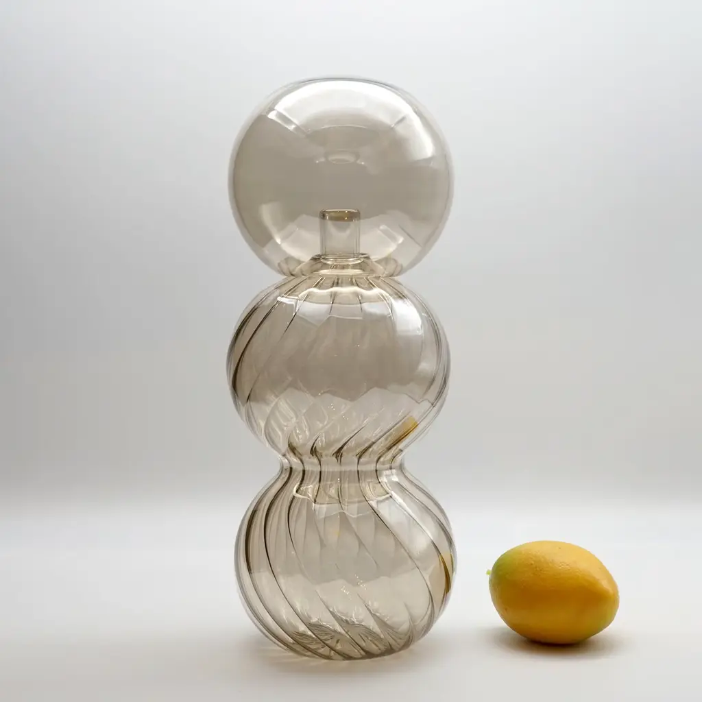 The geometric silhouette of this bottle combines architectural design and dramatic flair to give the piece a striking appearance. Either used on a dining table or as a sculptural piece in an entryway or a living room, this bottle will make an elegant statement, thanks to its sinuous frame made up of three spheres. The top smooth one is the lid and rests on the other two spheres, which are both strikingly adorned with a wave-like pattern of parallel curves.