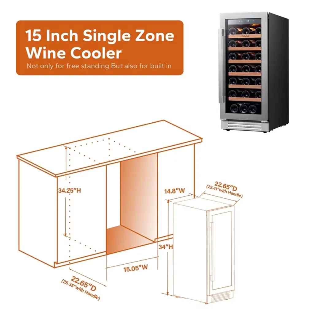 Ca'Lefort 15 inch Wine Refrigerator, 33 Bottle Wine Cooler Freestanding & Built-in Specification Products Name: Ca'Lefort 15 inch Wine Fridge Capacity : 33 standard 750ml wine bottles Temperature Range: 40-65°F (5°C-18°C) Net Weight: 71 lbs Gross Weight: 86.6 lbs Unit Dimension: 14.8"W x 22.4"D x 34"H