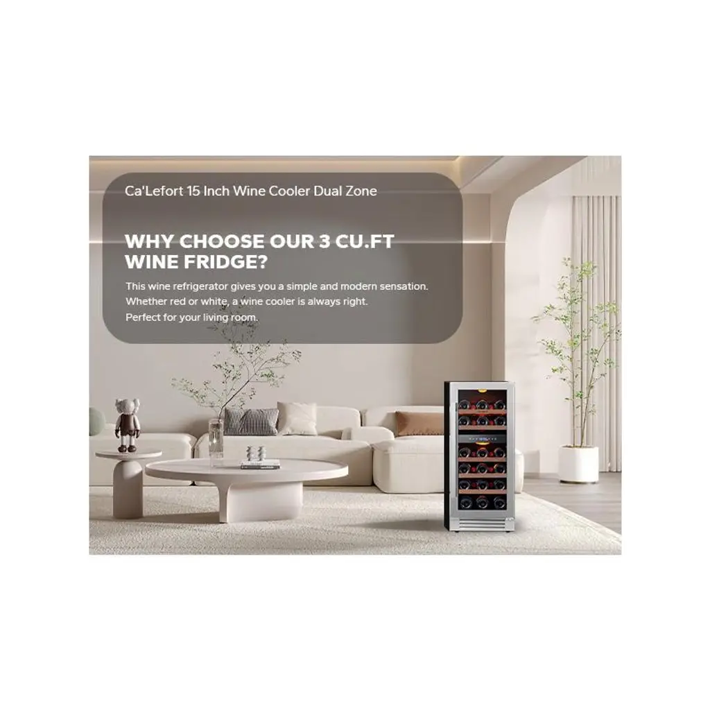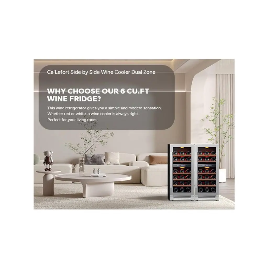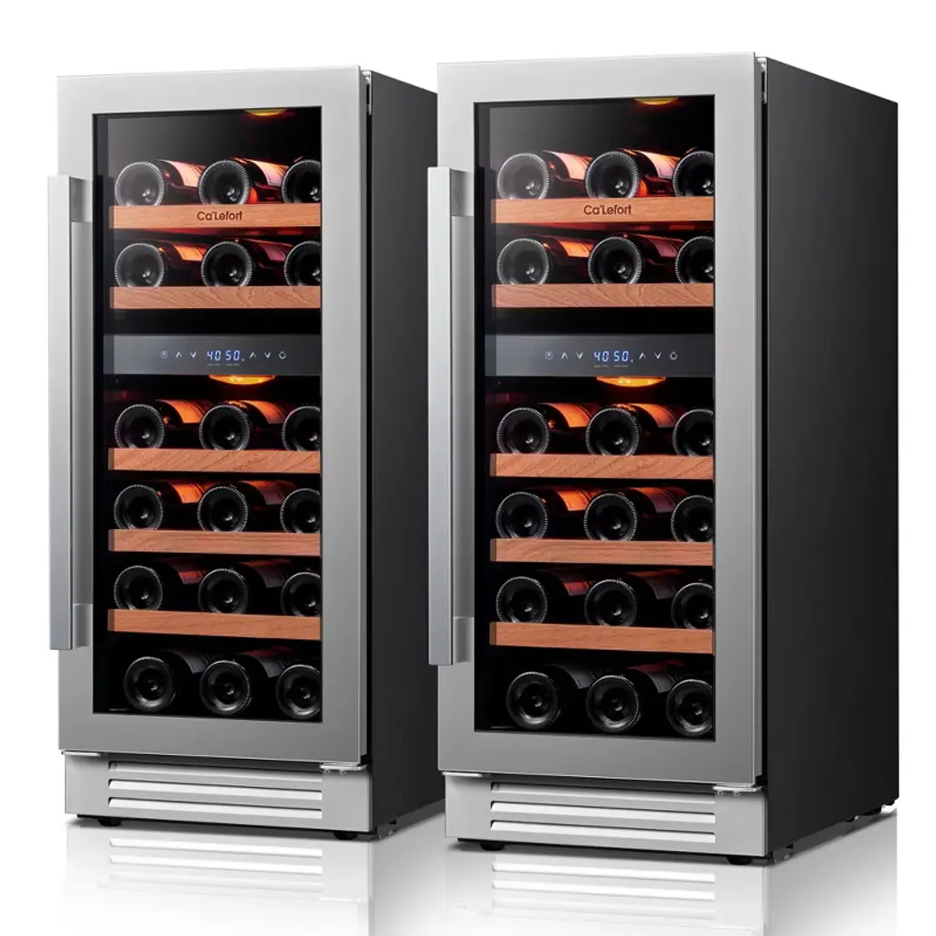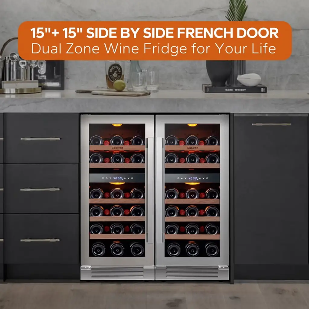 Ca'Lefort Dual 15" Dual Zone Wine Fridge Combo,56 Bottle Dual Zone Wine Cooler Refrigerator,Freestanding & Built-in with Stainless Steel frame for Kitchen Office Products Name:Ca'Lefort 15 inch Dual Zone Wine Fridge Combo Capacity : 56 standard 750ml wine bottles Temperature Range: 40-65°F (5°C-18°C) Net Weight: 71 lbs of single fridge Gross Weight: 86.6 lbs of single fridge Unit Dimension: 14.8"W x 22.4"D x 34"H of single fridge