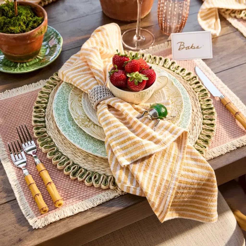 20-piece service for 4 features bamboo-shaped, dishwasher safe plastic handles. Perfect for giving a natural, tropical aesthetic. Pair with rattan chargers and chinoiserie plates for a timeless, colorful tablescape.