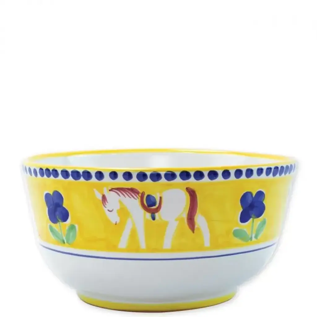 The colorful yellow and blue Campagna Cavallo Large Serving Bowl features whimsical handpainted horses among beautiful wildflowers. Since 1983, Vietri has specialized exclusively in Italian handcrafted ceramics, stainless and pewter flatware, mouth blown glassware, lamps, urns and planters. Families of artisans with 3 or 4 generations of history create these special pieces using centuries-old techniques. The subtle color from a paintbrush and the curving stroke of the artist's hand are never repeated in quite the same way, making each piece truly unique.