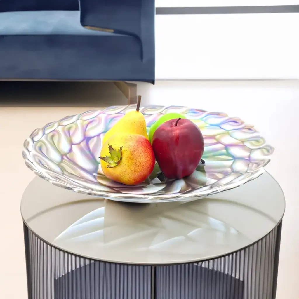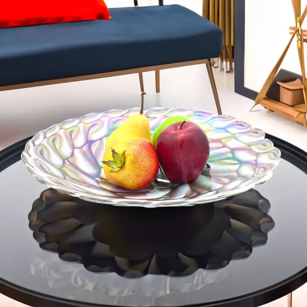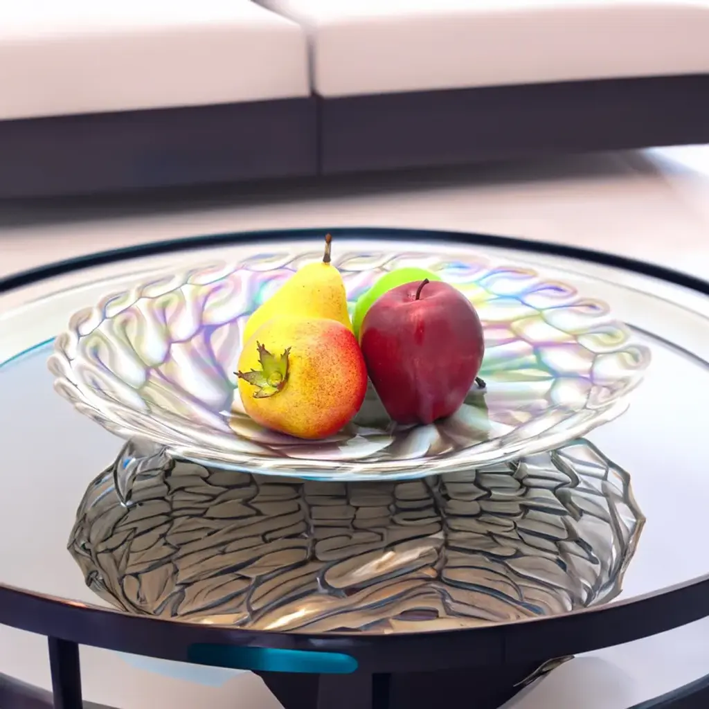 CANEVA is a modern Murano glass plate in ivory color, with mother of pearl and brown inlay details. Entirely hand-made, this unique creation is the perfect decorative piece to complete any room with elegance and originality. Imagine it as the centerpiece of your dining table.Whether you're looking for an elegant addition to decorate your dining room or an original Venetian glass gift idea to amaze someone, these decorative fruit plates in Venetian glass are the perfect solution! Find the perfect match for your home and create a truly unique and original interior design. All our products are handcrafted and of the highest production quality. Non-substantial variations in shape, size, color, and/or minor imperfections are inevitable and are typical of manual glasswork, highlighting the artisanal craftsmanship.