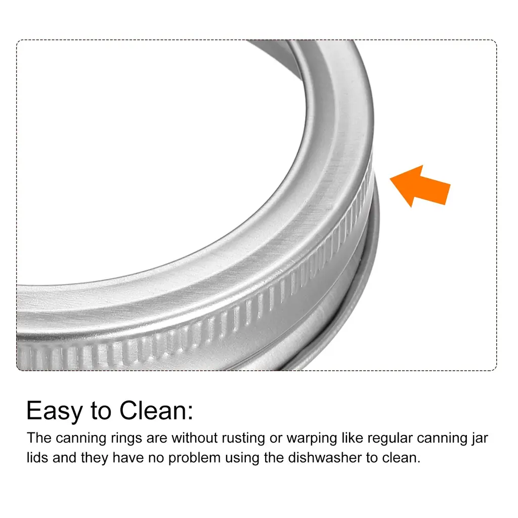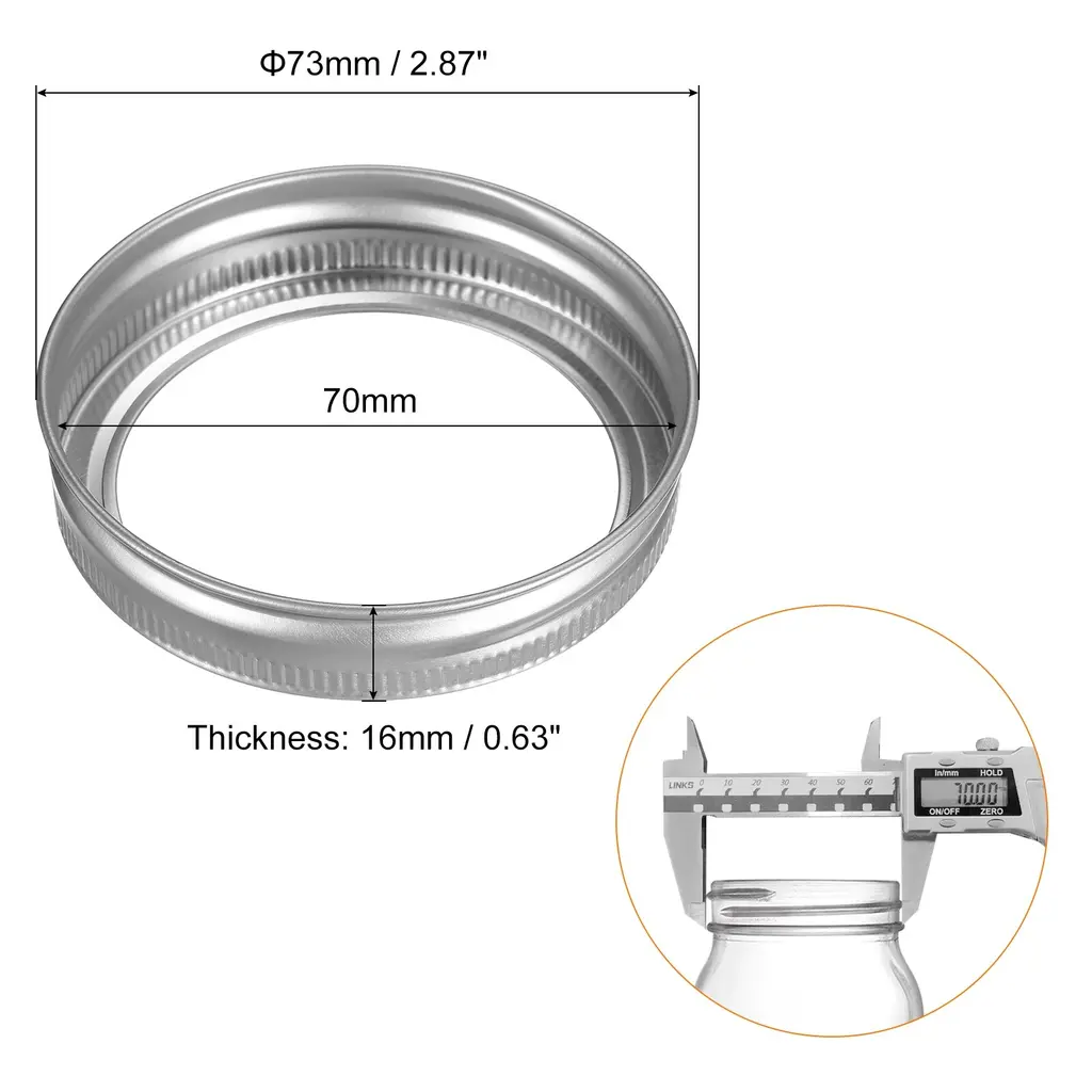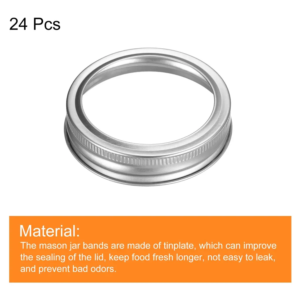 Features:Good Material: The mason jar bands are made of tinplate, which can improve the sealing of the lid, keep food fresh longer, not easy to leak, and prevent bad odors.Vertical Pattern: The canning ring can be used with canning lids and glasses jar lids. Canning ring concave-convex design with vertical stripes to increase friction between palm and lid, anti-slip, and facilitate opening and closing.Easy to Clean: The canning rings are without rusting or warping like regular canning jar lids and they have no problem using the dishwasher to clean. It can be used in the refrigerator for refrigeration.Scope of Application: A good gift for a friend who love jars for storing and cooking in the kitchen. Suitable for the freezer and refrigerator as well as dry storage, such as soup, yogurt, sports drinks, cereal, candy, etc.Specification:Outer Diameter: 73mm / 2.87”Suitable Diameter: 70mm / 2.76”Thickness: 16mm / 0.63”Material: TinplateColor: SilverPackage Content:24 x Canning Jar Rings