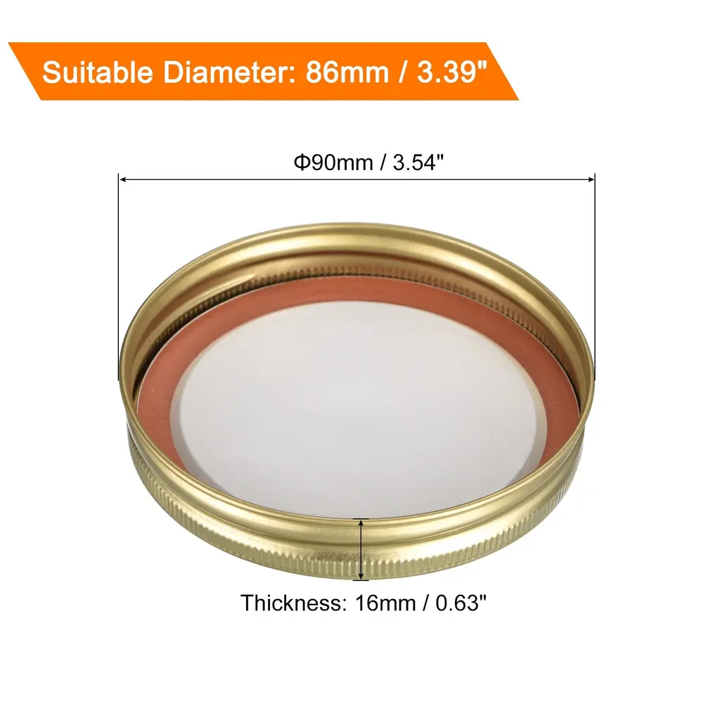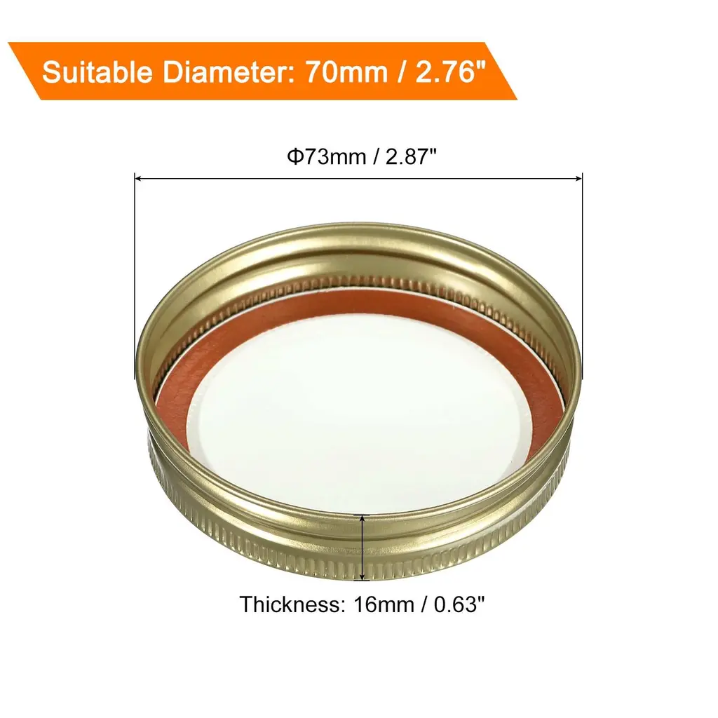 Features:Good Material: The mason jar lids are made of tinplate, which can improve the sealing of the lid, keep food fresh longer, not easy to leak, and prevent bad odors.Split Design: The split cover can be used with canning lids and glasses lids. Canning ring concave-convex design with vertical stripes to increase friction between palm and lid, anti-slip, and facilitate opening and closing. Easy to Clean: The canning lid is without rusting or warping like regular canning jar lids and they have no problem using the dishwasher to clean. It can be used in the refrigerator for refrigeration.Scope of Application: A good gift for a friend who love jars for storing and cooking in the kitchen. Suitable for the freezer and refrigerator as well as dry storage, such as soup, yogurt, sports drinks, cereal, candy, etc.Specification:Outer Diameter: 73mm / 2.87”Suitable Diameter: 70mm / 2.76”Thickness: 16mm / 0.63”Material: TinplateColor: GoldPackage Content:12 sets of Canning Lids and Bands