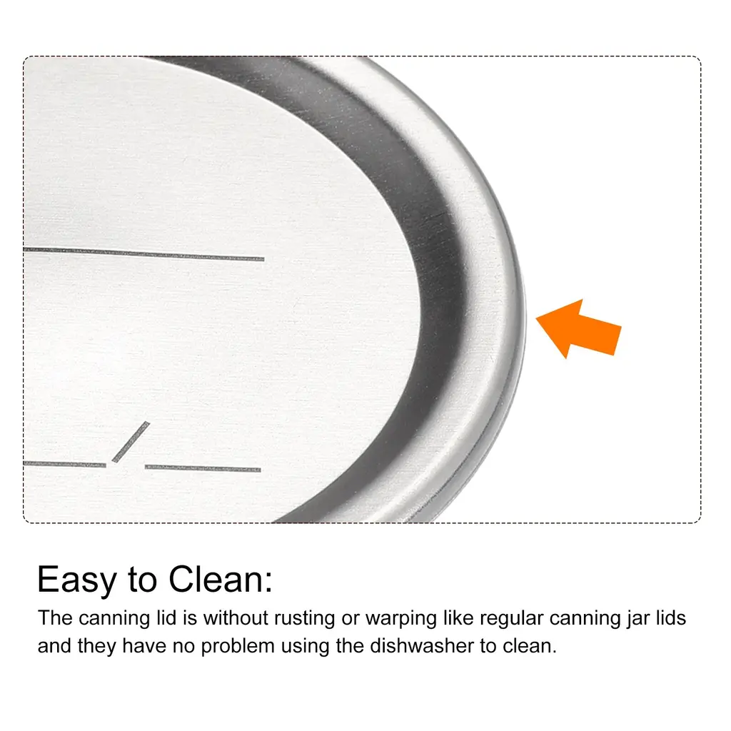 Good Material: The mason jar lids are made of tinplate, which can improve the sealing of the lid, keep food fresh longer, not easy to leak, and prevent bad odors.Split Design: The cover can be used with canning lids and glasses lids. This cover can be filled with the date, write the date and time on the jar with a marker to avoid confusion in the future. Please note that our products do not include a canning ring.Easy to Clean: The canning lid is without rusting or warping like regular canning jar lids and they have no problem using the dishwasher to clean. It can be used in the refrigerator for refrigeration.Scope of Application: A good gift for a friend who love jars for storing and cooking in the kitchen. Suitable for the freezer and refrigerator as well as dry storage, such as soup, yogurt, sports drinks, cereal, candy, etc.Specification:Outer Diameter: 68mm / 2.68”Suitable Diameter: 70mm / 2.76”Thickness: 2.5mm / 0.1”Material: TinplateColor: SilverPackage Content: 24 x Canning Lids