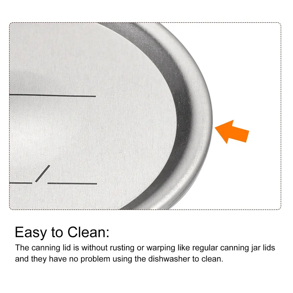 Good Material: The mason jar lids are made of tinplate, which can improve the sealing of the lid, keep food fresh longer, not easy to leak, and prevent bad odors.Split Design: The cover can be used with canning lids and glasses lids. This cover can be filled with the date, write the date and time on the jar with a marker to avoid confusion in the future. Please note that our products do not include a canning ring.Easy to Clean: The canning lid is without rusting or warping like regular canning jar lids and they have no problem using the dishwasher to clean. It can be used in the refrigerator for refrigeration.Scope of Application: A good gift for a friend who love jars for storing and cooking in the kitchen. Suitable for the freezer and refrigerator as well as dry storage, such as soup, yogurt, sports drinks, cereal, candy, etc.Specification:Outer Diameter: 84mm / 3.31”Suitable Diameter: 86mm / 3.39”Thickness: 3mm / 0.12”Material: TinplateColor: SilverPackage Content: 80 x Canning Lids
