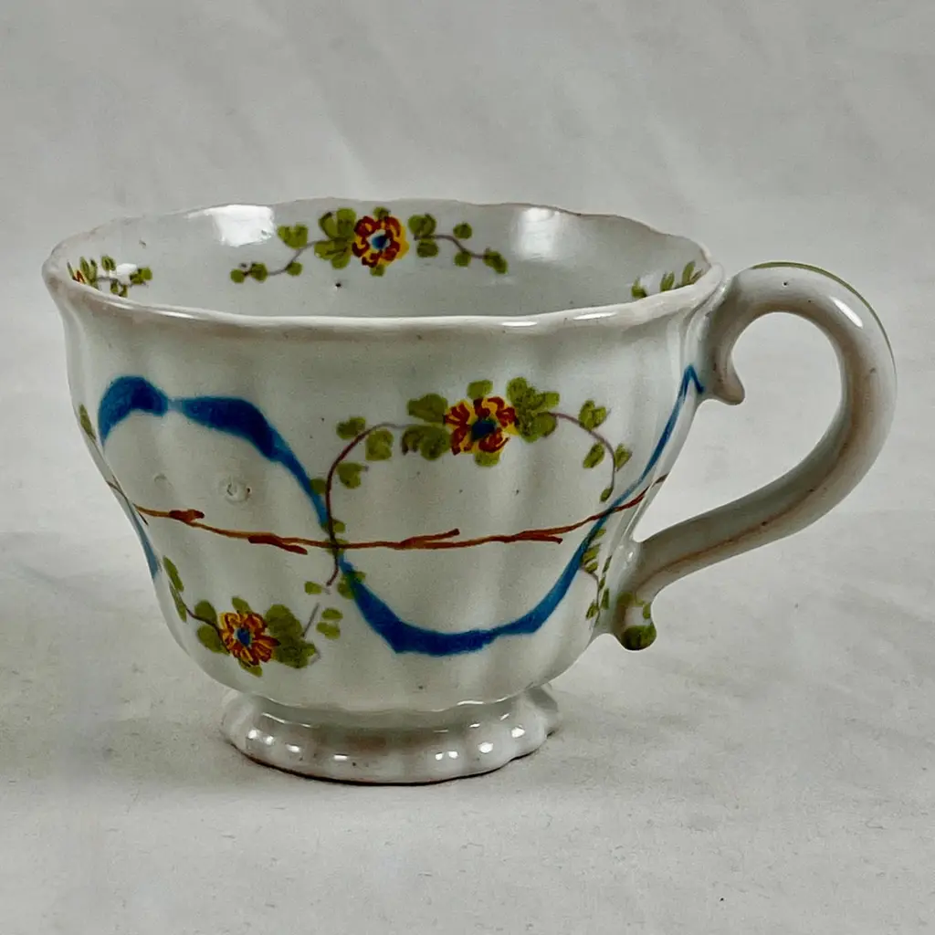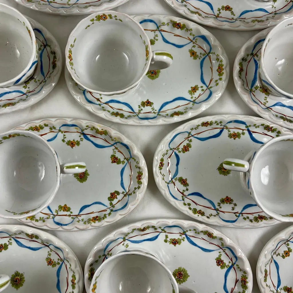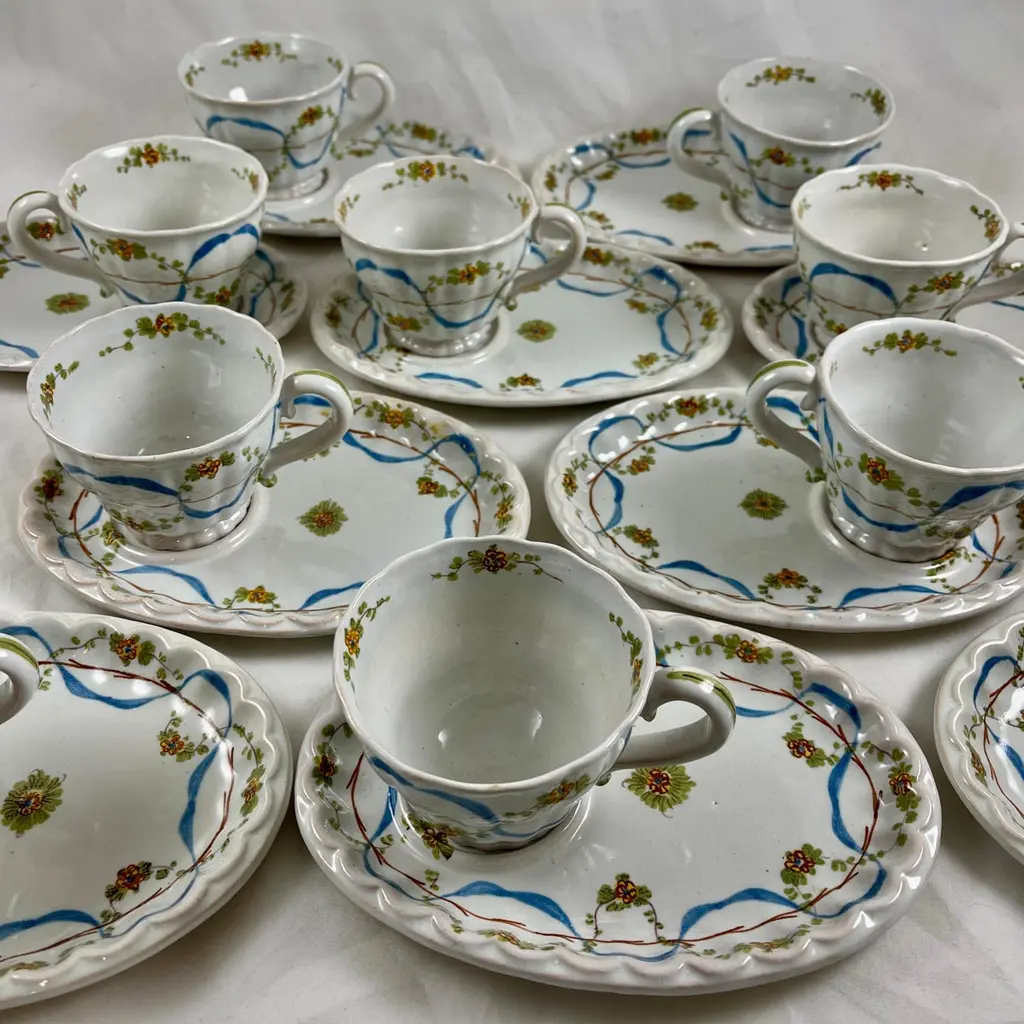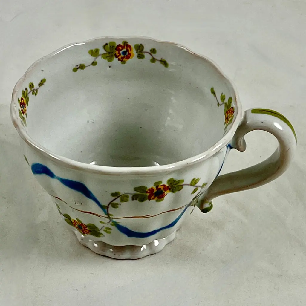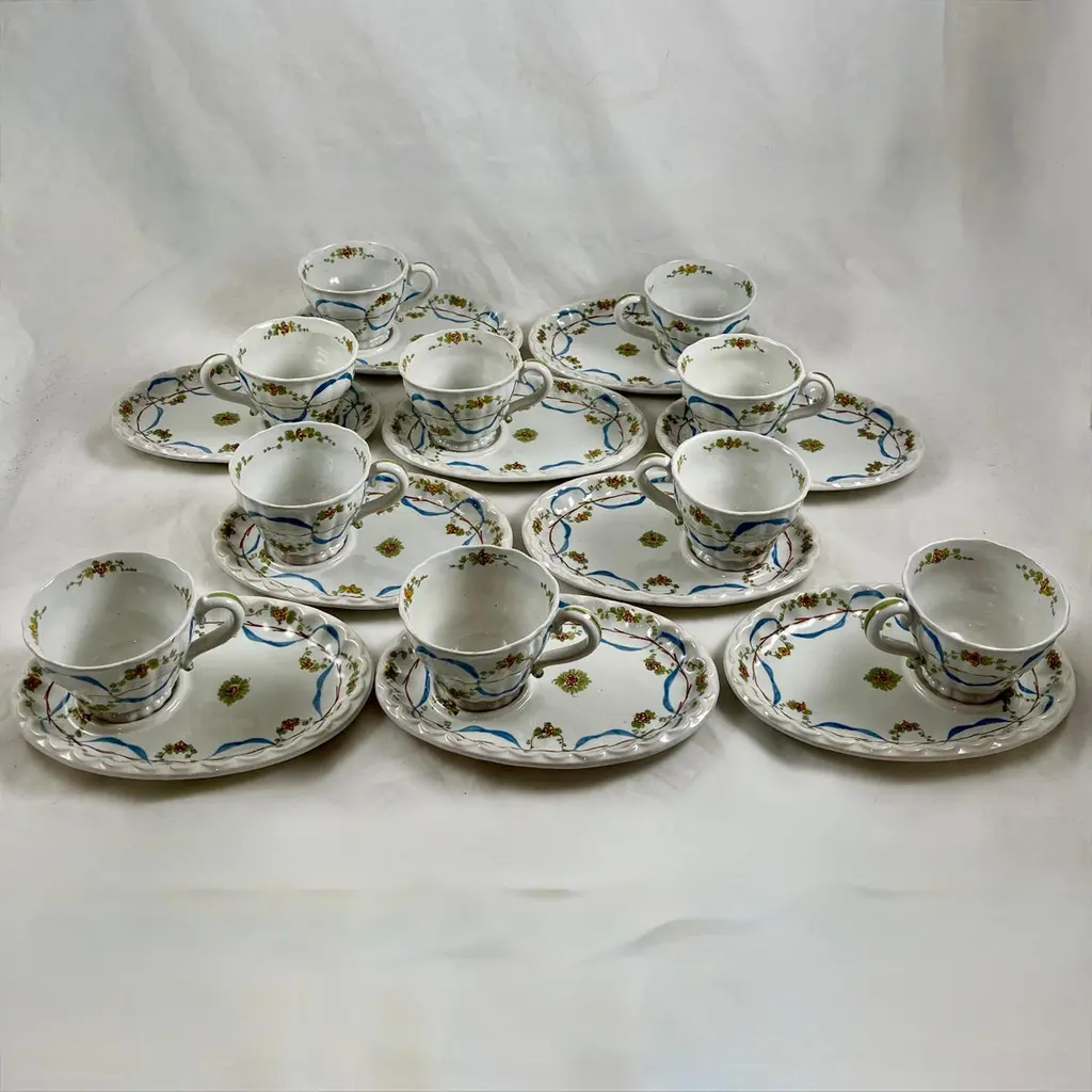 From The Cantagalli Pottery in Florence, Italy, a hand painted earthenware cup and saucer set, showing the Crowing Rooster mark used in the early 20th Century.Beautifully painted in the Renaissance Revival style with a blue ribbon and floral garland, on a creamy white ground.The saucers have a raised scalloped border, a molded cup holder, and are oval shaped with enough room for a small sweet.The footed, fluted cups are decorated on the inside and out with a corresponding running ribbon and floral pattern, with green lining on the handle.The Cantagalli family operated their pottery works in Florence beginning in the 15th Century until the pottery closed its doors in 1985.Saucers: 7.5 in. L x 5 in. W x .50 in. HCups: 3.25 in. Diameter x 2.5 in. HAll pieces are marked with the painted Rooster logo.Multiple sets are available, offered individually, all without issue.Please message if interested in purchasing multiple sets and the shipping will be adjusted accordingly.