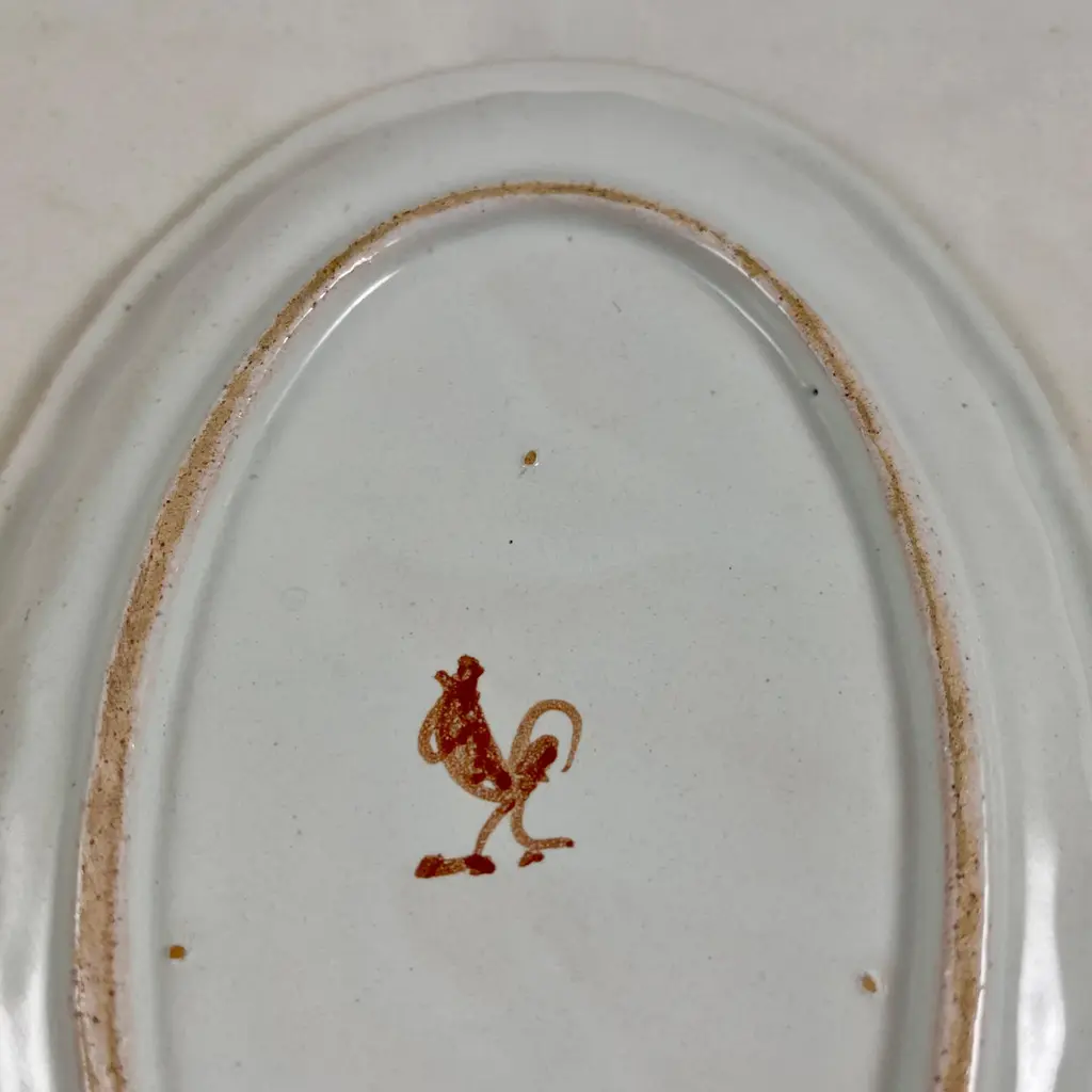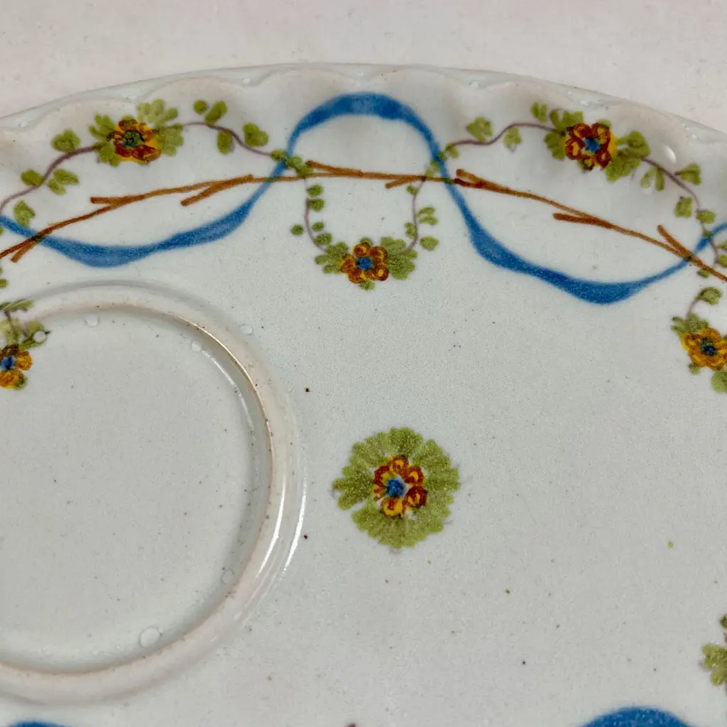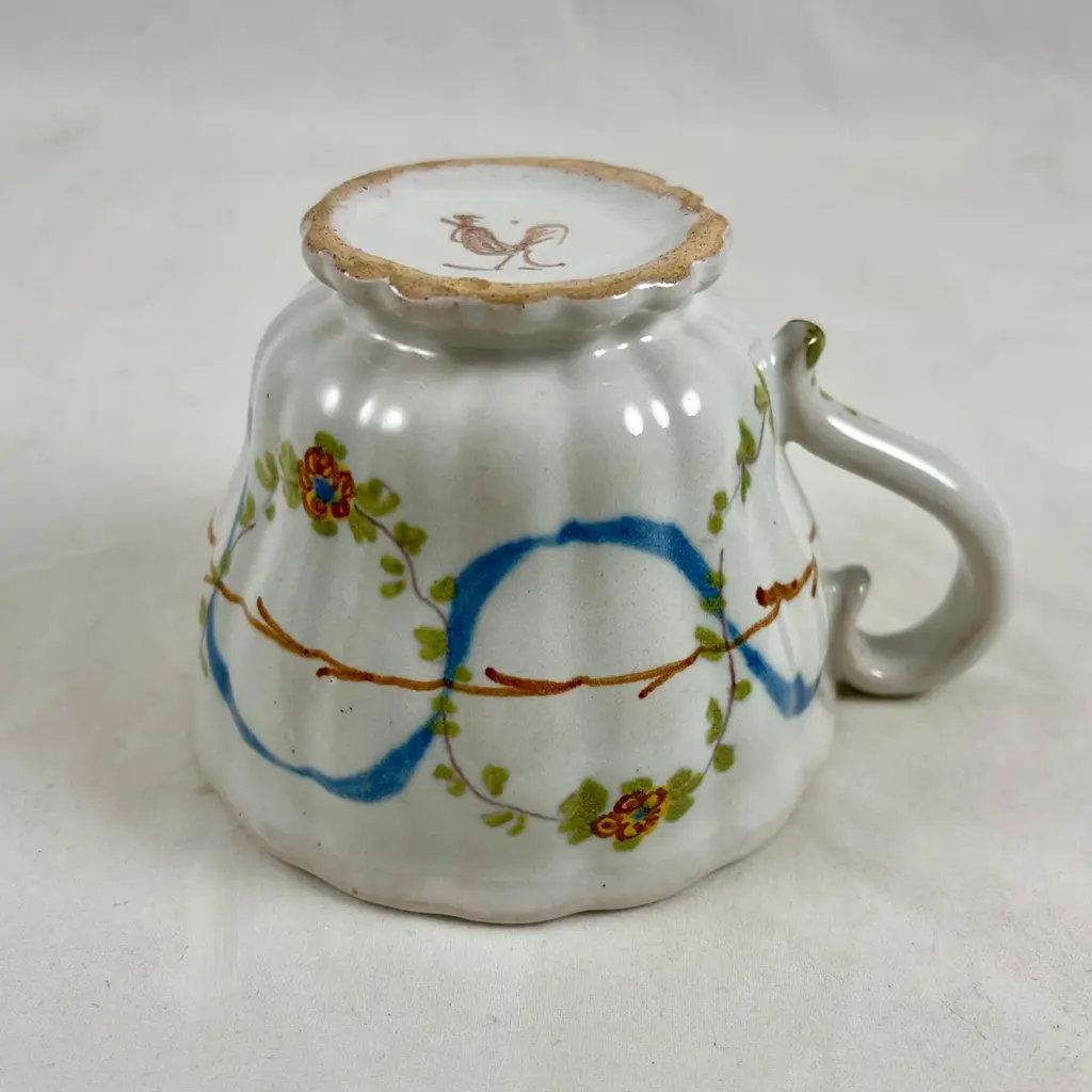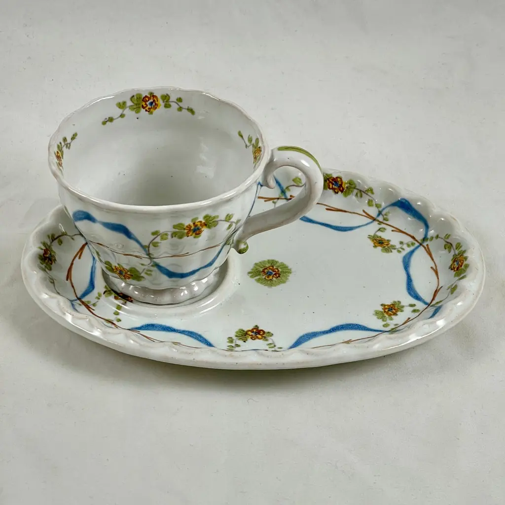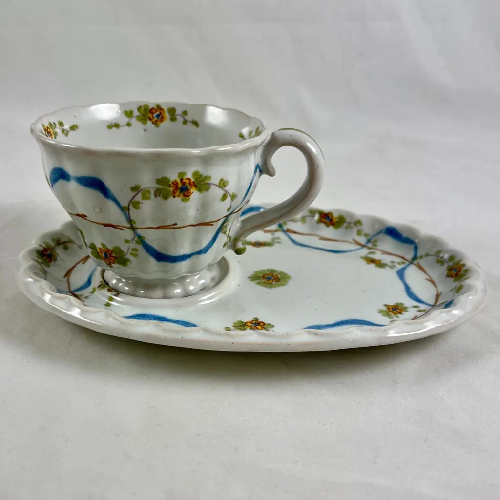 From The Cantagalli Pottery in Florence, Italy, a hand painted earthenware cup and saucer set, showing the Crowing Rooster mark used in the early 20th Century.Beautifully painted in the Renaissance Revival style with a blue ribbon and floral garland, on a creamy white ground.The saucers have a raised scalloped border, a molded cup holder, and are oval shaped with enough room for a small sweet.The footed, fluted cups are decorated on the inside and out with a corresponding running ribbon and floral pattern, with green lining on the handle.The Cantagalli family operated their pottery works in Florence beginning in the 15th Century until the pottery closed its doors in 1985.Saucers: 7.5 in. L x 5 in. W x .50 in. HCups: 3.25 in. Diameter x 2.5 in. HAll pieces are marked with the painted Rooster logo.Multiple sets are available, offered individually, all without issue.Please message if interested in purchasing multiple sets and the shipping will be adjusted accordingly.
