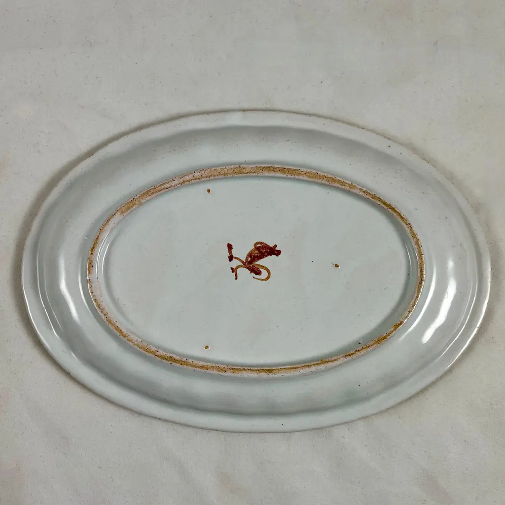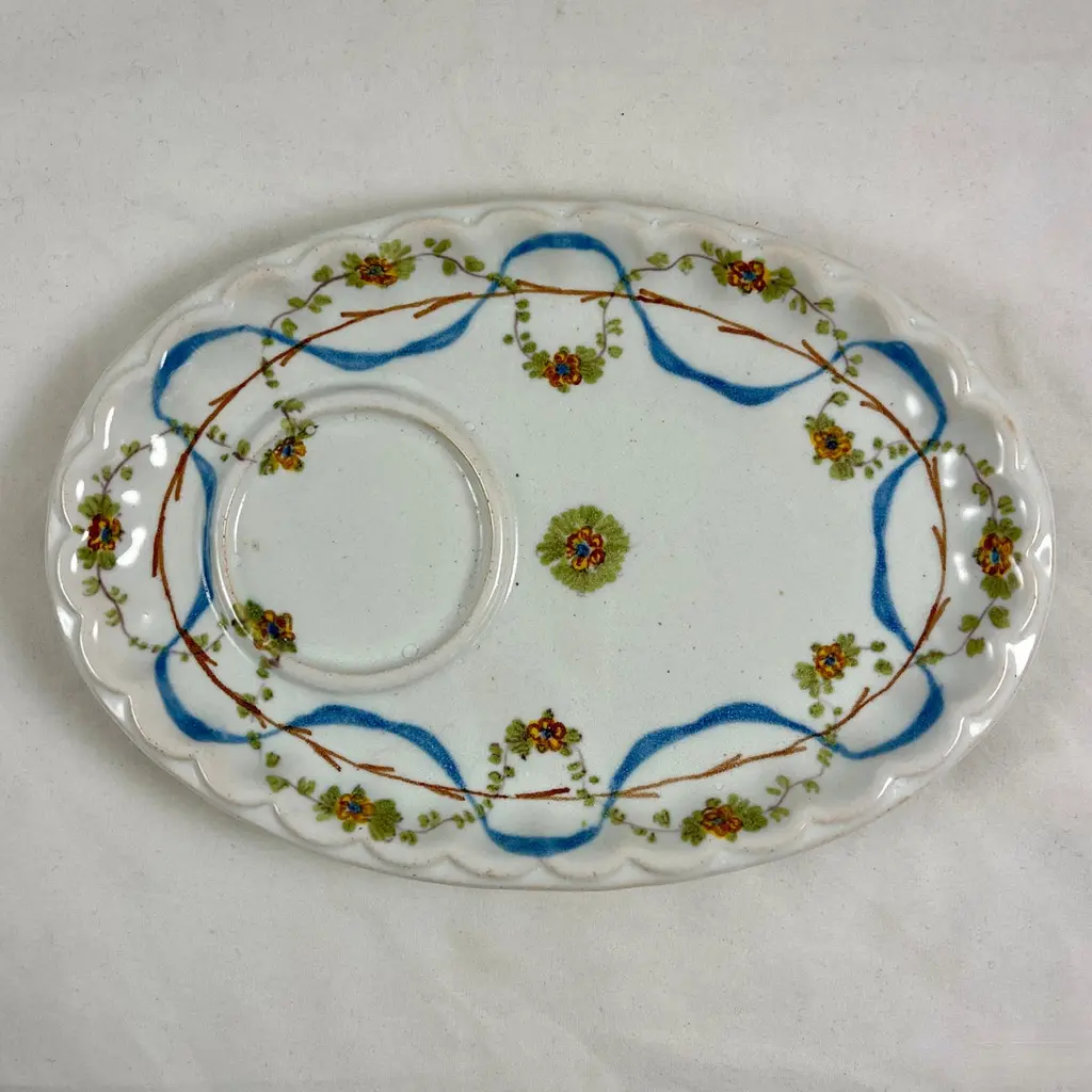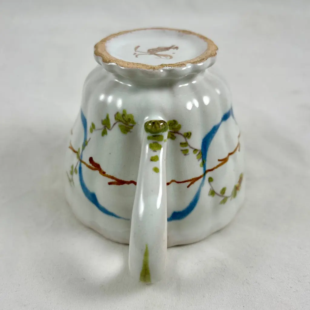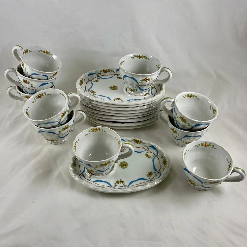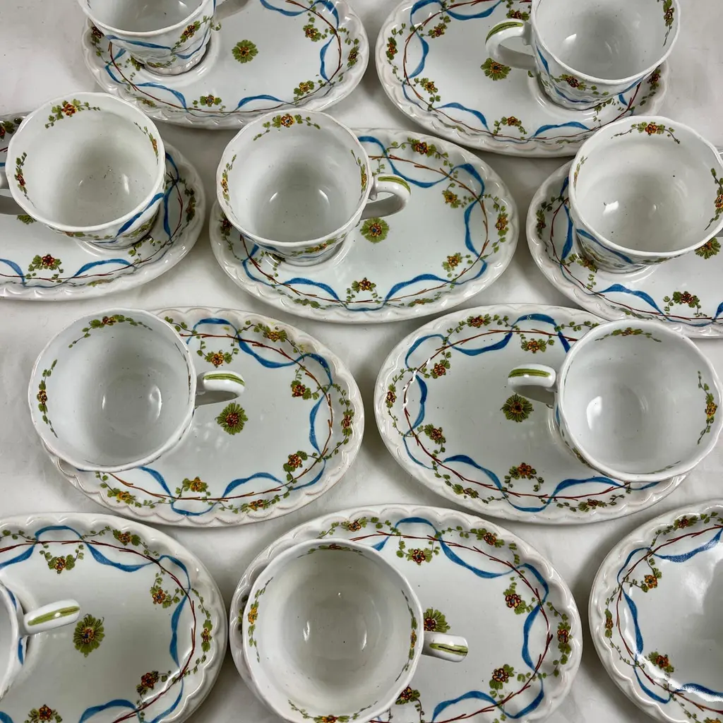 From The Cantagalli Pottery in Florence, Italy, a hand painted earthenware cup and saucer set, showing the Crowing Rooster mark used in the early 20th Century.Beautifully painted in the Renaissance Revival style with a blue ribbon and floral garland, on a creamy white ground.The saucers have a raised scalloped border, a molded cup holder, and are oval shaped with enough room for a small sweet.The footed, fluted cups are decorated on the inside and out with a corresponding running ribbon and floral pattern, with green lining on the handle.The Cantagalli family operated their pottery works in Florence beginning in the 15th Century until the pottery closed its doors in 1985.Saucers: 7.5 in. L x 5 in. W x .50 in. HCups: 3.25 in. Diameter x 2.5 in. HAll pieces are marked with the painted Rooster logo.Multiple sets are available, offered individually, all without issue.Please message if interested in purchasing multiple sets and the shipping will be adjusted accordingly.