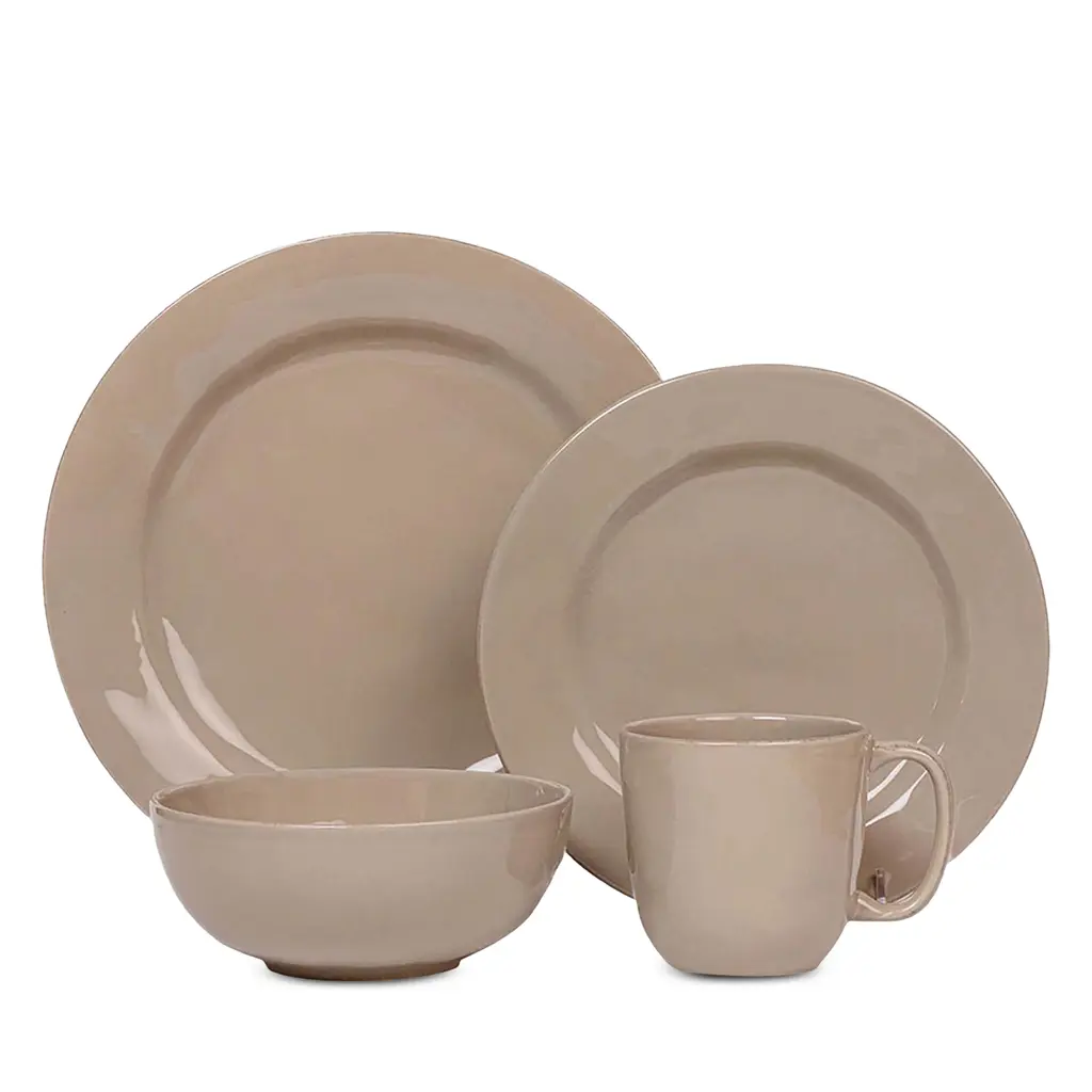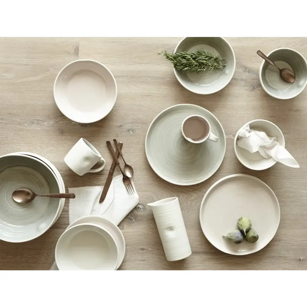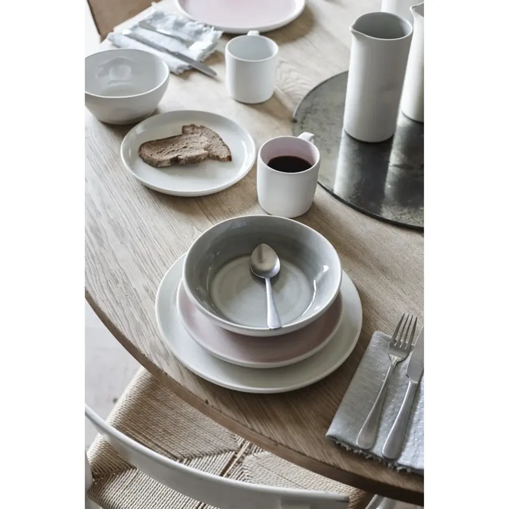 Working with both Linda Bloomfield, one of the UK's most respected potters and author of numerous books on glazes, and a well-respected, small-scale ceramics factory in Portugal, we have arrived at a collection that combines the expertise of all collaborators. With a focus on simplicity and clean form; an incredibly subtle color palette is only possible because of Linda's mastery of glazing possibilities, and our Portuguese partner's expertise in applying studio glaze recipes in a factory setting. This 4-piece service for one includes a dinner plate, salad plate, cereal bowl, and mug.