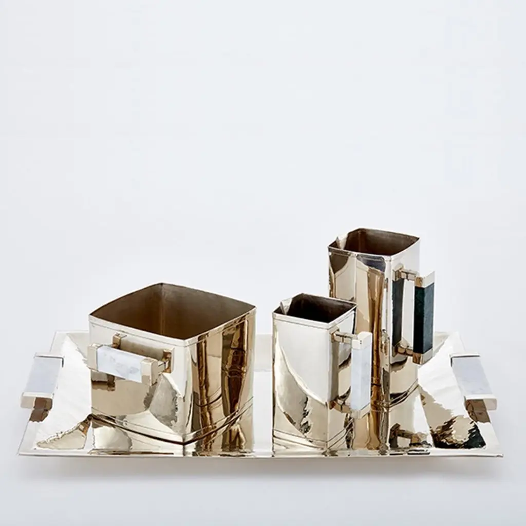 With the concept of intermingle materials from our earth, soft marbles and manually hammered alpaca, this sophisticated and elegant line is created, and it includes trays, champagne buckets and pitchers in different forms and sizes.Our pieces are made by hand. One of a kind.All natural stones may vary in color.