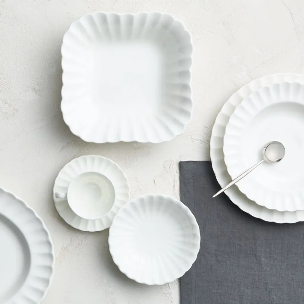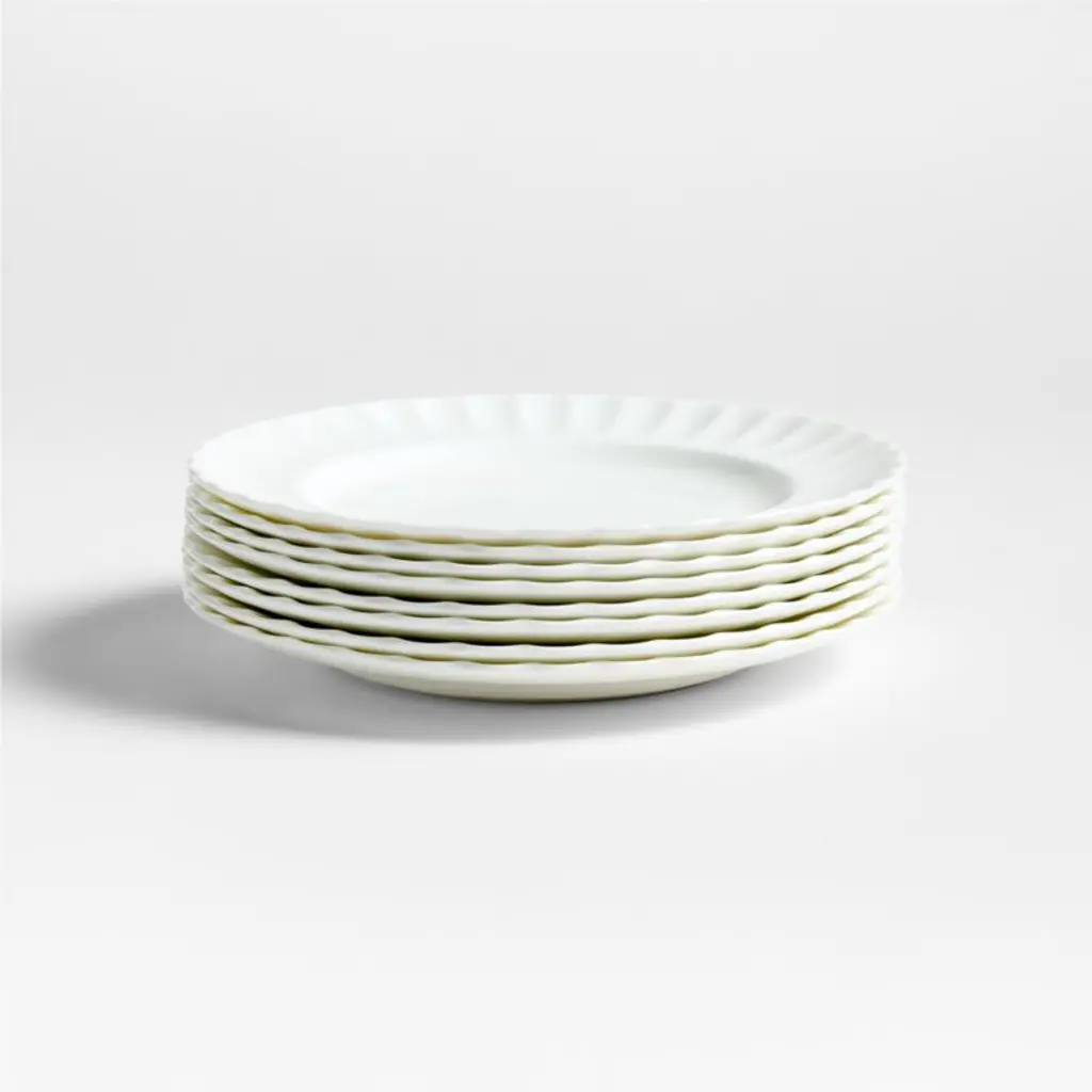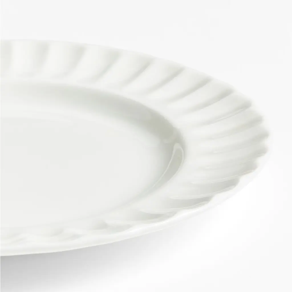 Softly translucent and classically white, our Capella bone china brings timeless elegance to the table. Scalloped rims lend a graceful accent to the salad plate's gentle coupe contours, while the ceramic's high calcium content gives it its creamy white color and subtle luminosity. Despite the delicate shape, the plate boasts exceptional durability and edge strength.