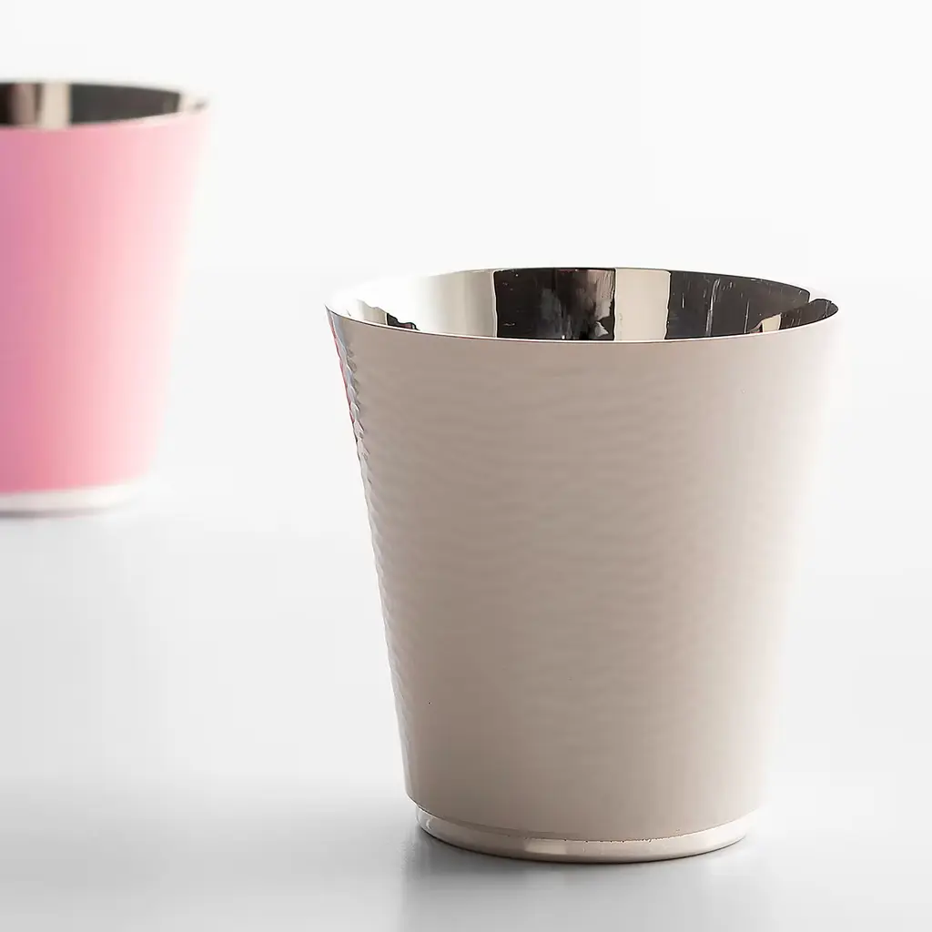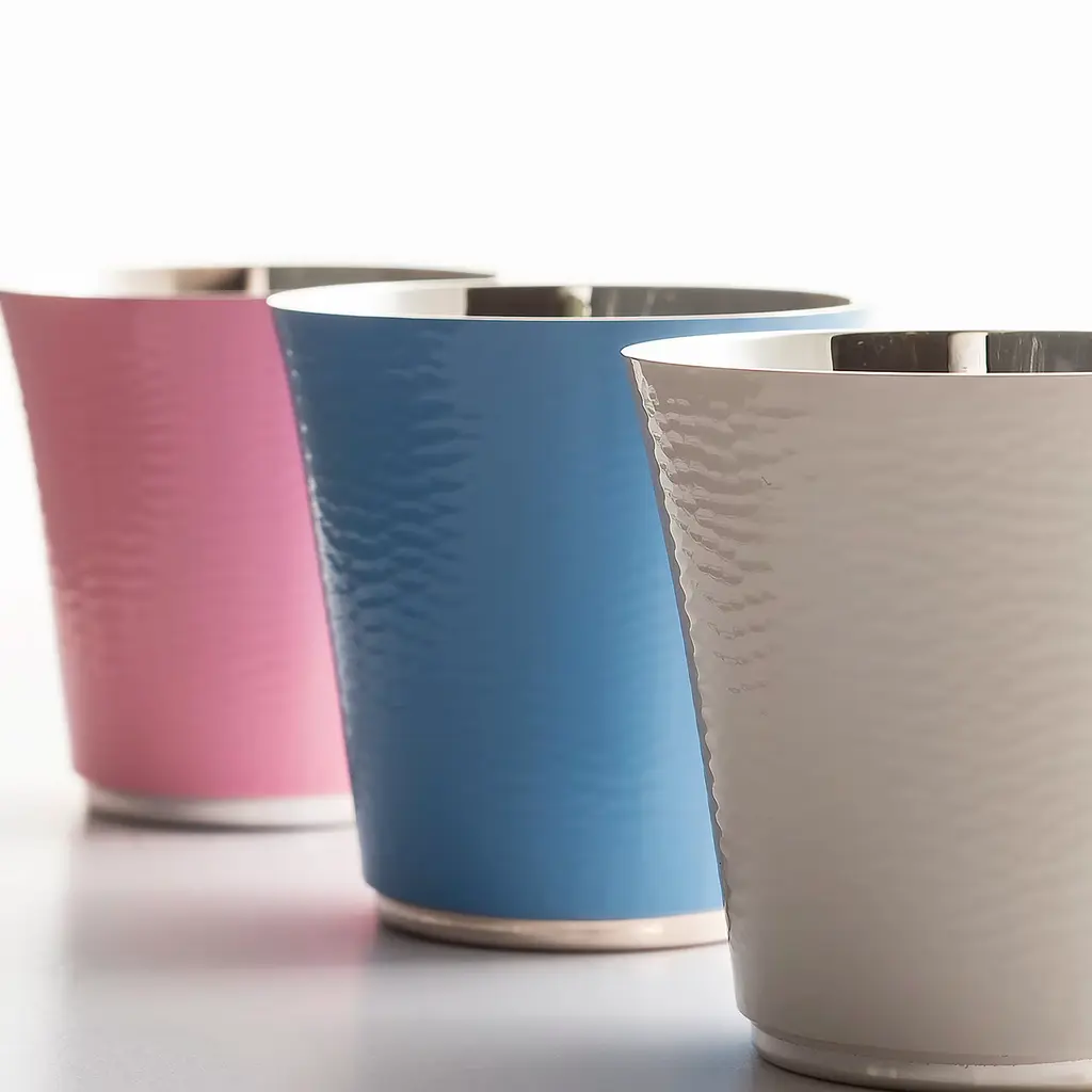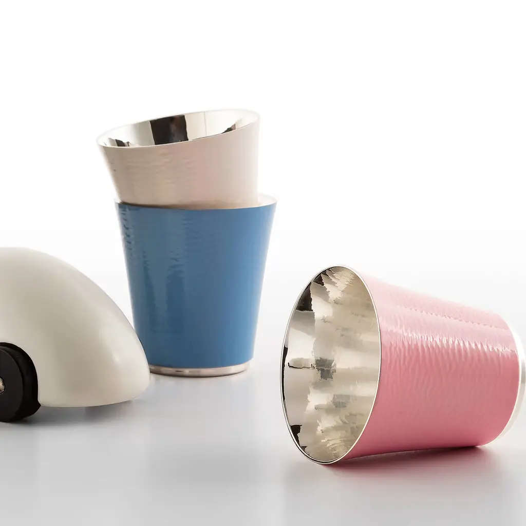 The Capri Kid's Cup is the perfect way to help children perceive colors, shapes, and materials. The rhodium-plated surface is textured with an "Acqua" (water) pattern reminiscent of sea waves. This cup is designed for children's hands, not only to drink from but also to play with the silver reflections they create, allowing them to explore the tactile variations under their fingertips. It is available in a delicate array of colors, ranging from pink, blue, and gray: please consult the Concierge for details.