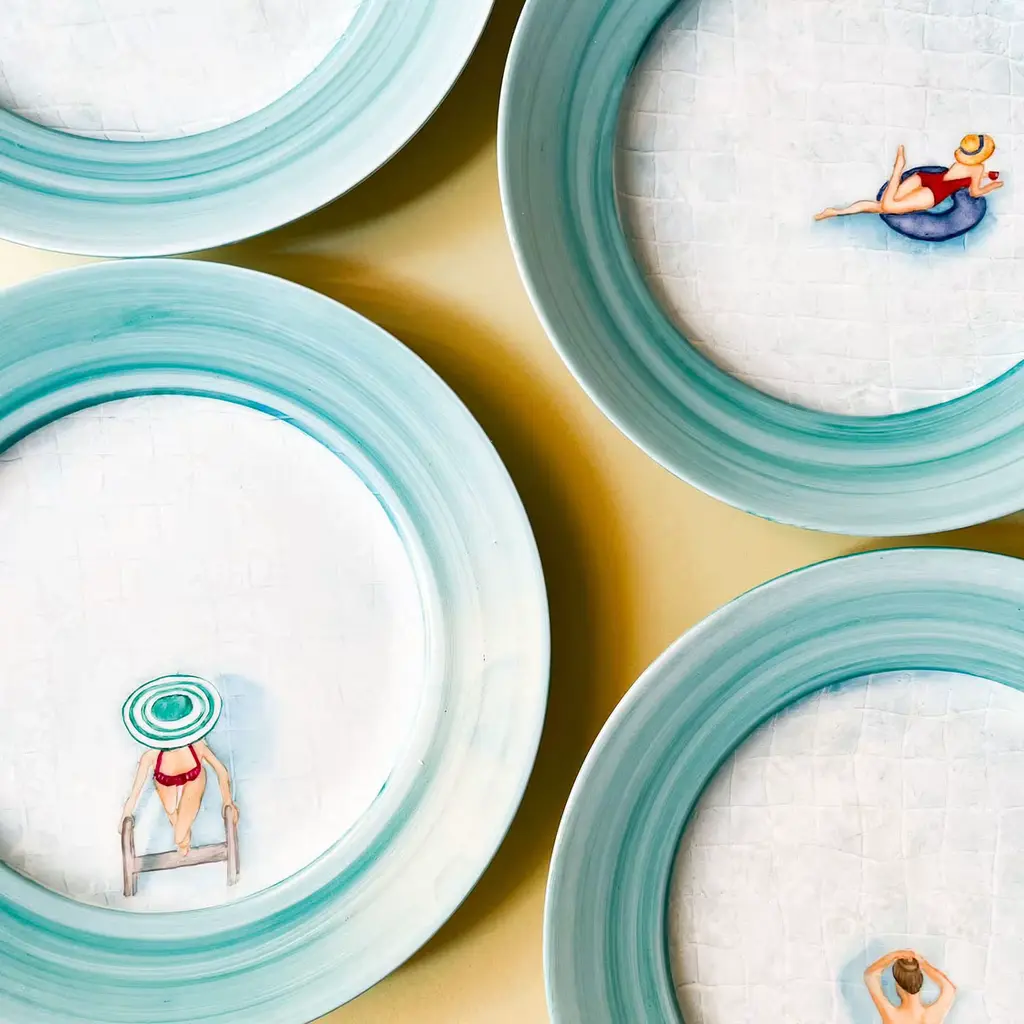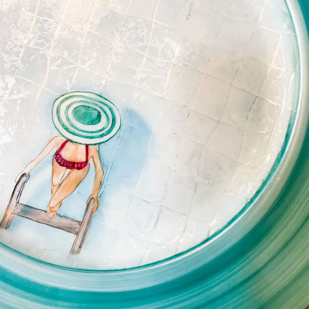 Inspired by the relaxed ambiance of Capri in the '50s and 60's, this precious white porcelain plate depicts a woman wearing a stylish hat and coming out of a pool. The deft manual decoration process also includes the application of nacreous luster glazes and the turquoise coloring of the brim, which is crafted on a lathe. It withstands gentle dishwasher settings, but handwashing is recommended.