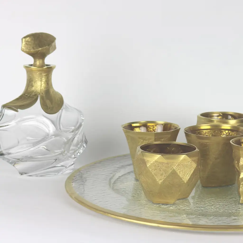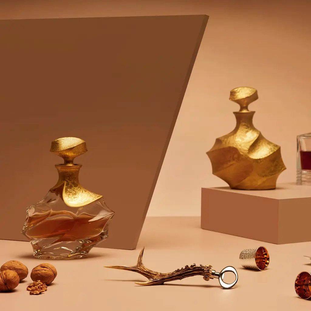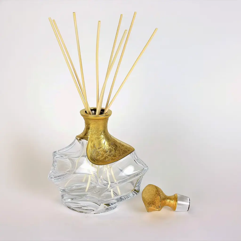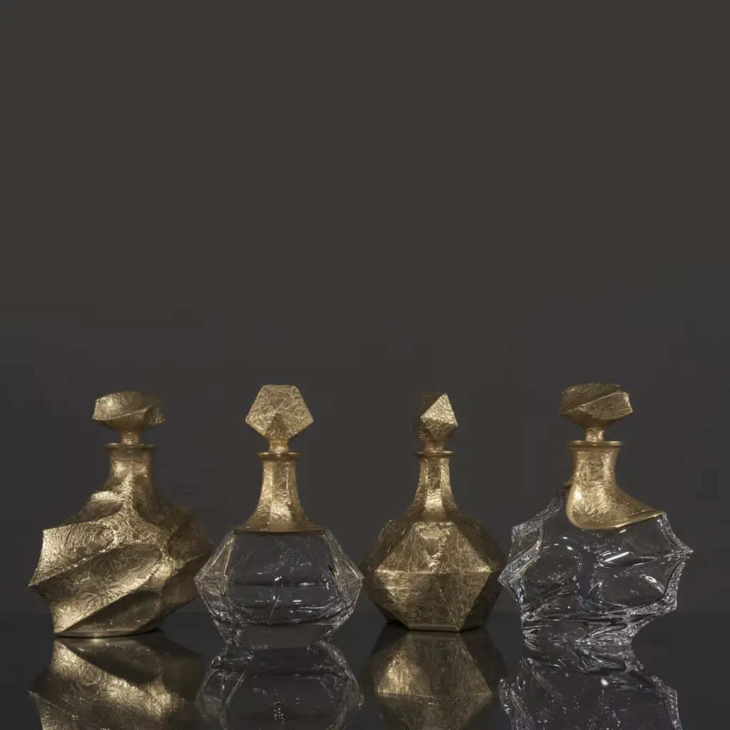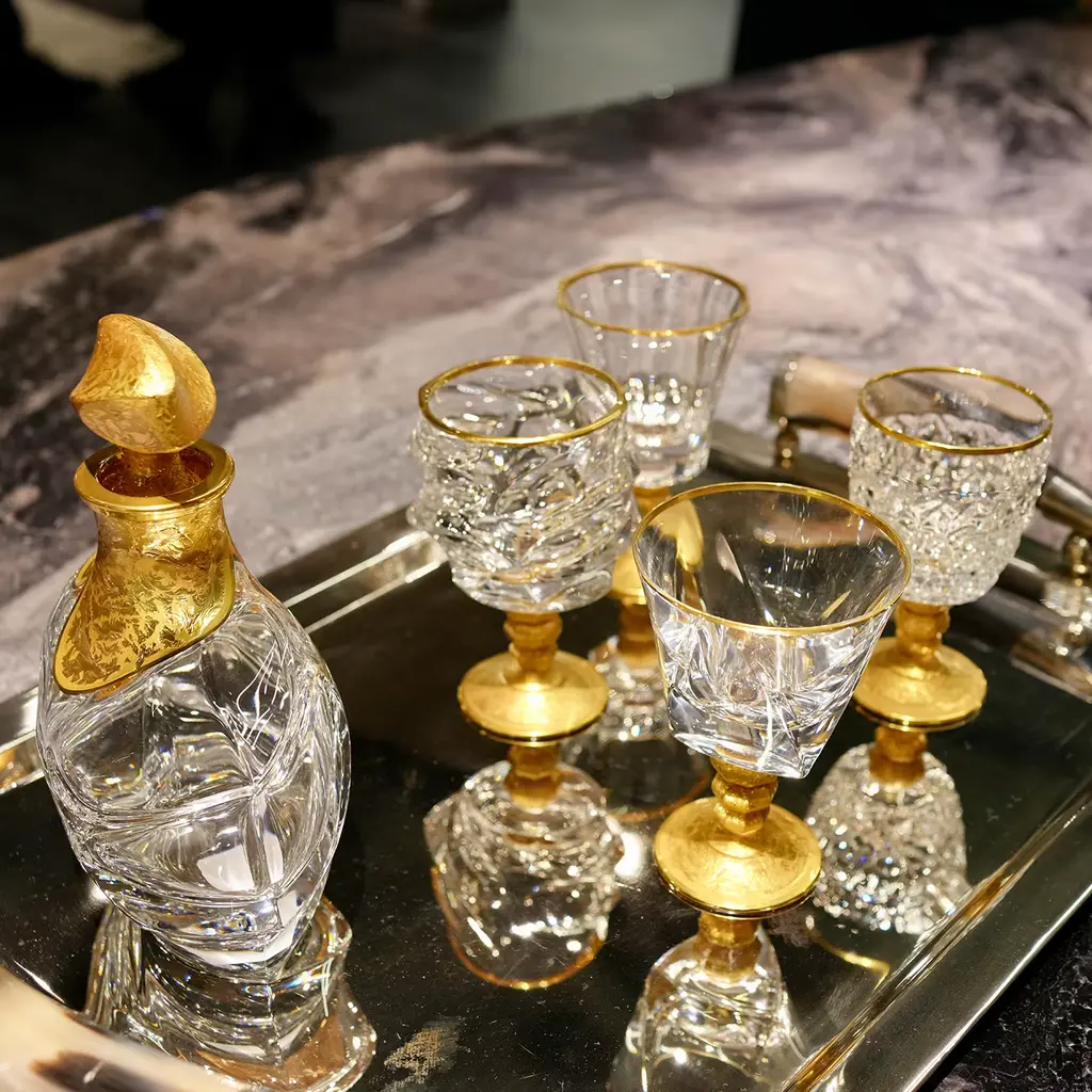 Part of the Capriccio collection, this bottle features a strong character and unique textures and will make a statement in any decor, adding a touch of timeless charm to a party. It was entirely made in transparent crystal that was sculpted in solid glass and then painted by hand at the top and on the lid with pure gold. The deep grooves that adorn its surface resemble waves that move the solid matter and create a dynamic effect.