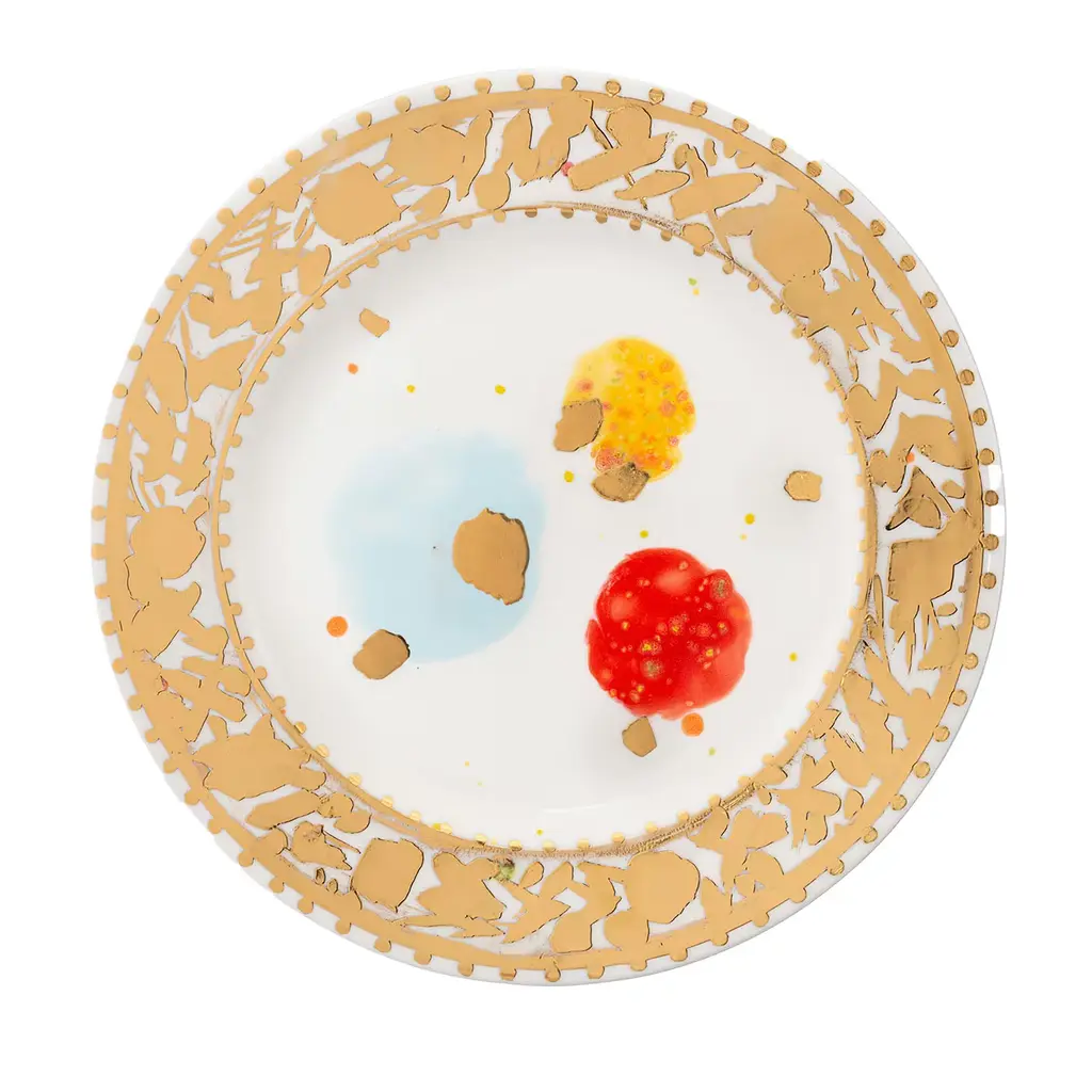 First introduced at Milan Design Week 2018 the Caravaggio collection of dinnerware combines the expressive work of the Baroque master painter interpreted with the eclectic sensitivity of artist Coralla Maiuri. The effect is a series of modern pieces handmade of porcelain that boast a gold leaf-decorated rim and a central decoration with vivid spots of yellow, pale blue and red for a dynamic effect, as this exquisite service plate.
