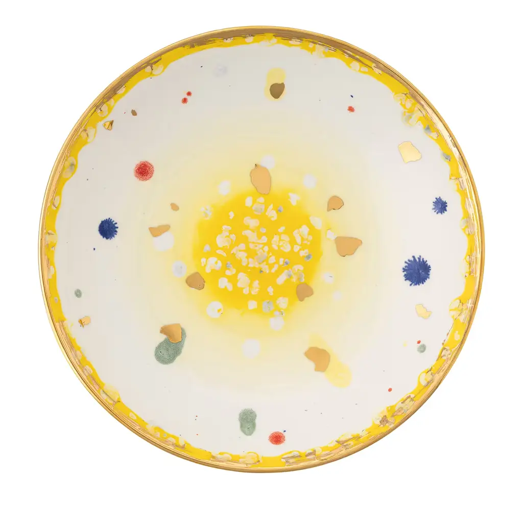 This set of two dessert plates in fine porcelain will uplift any table setting with its one-of-a-kind design coupling modern inspiration with details homaging the opulent elegance of Baroque art. Part of the Caravaggio Collection named after the master painter, this set is distinguished by a bold, shimmering garland in gold leaf adorning the rim, which surrounds an agglomerate of splashes in vivid red, yellow, and pale-blue reflecting the sensitivity of the artist who deftly handpainted it.