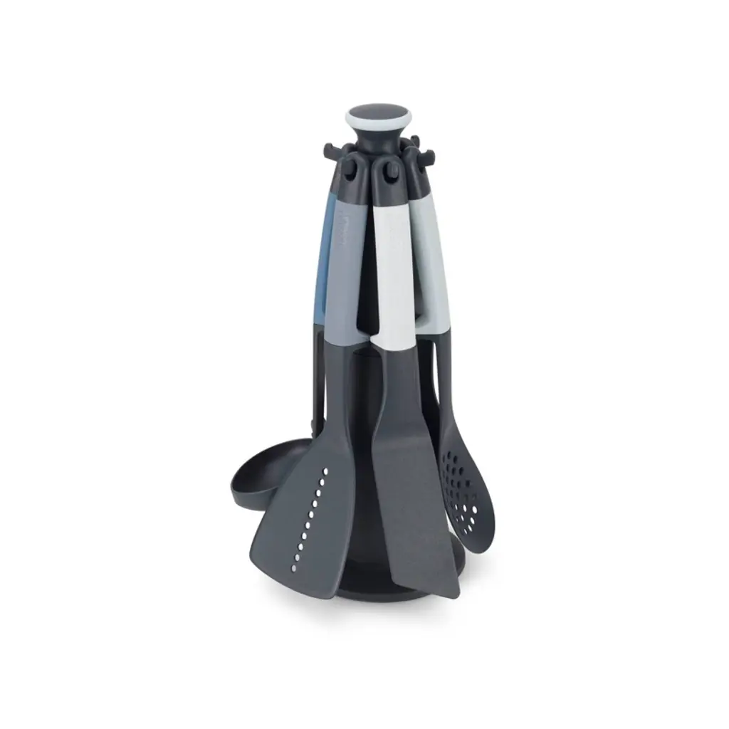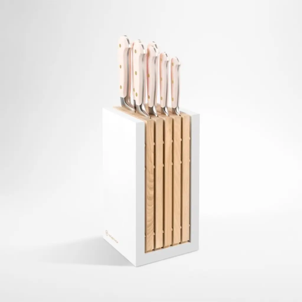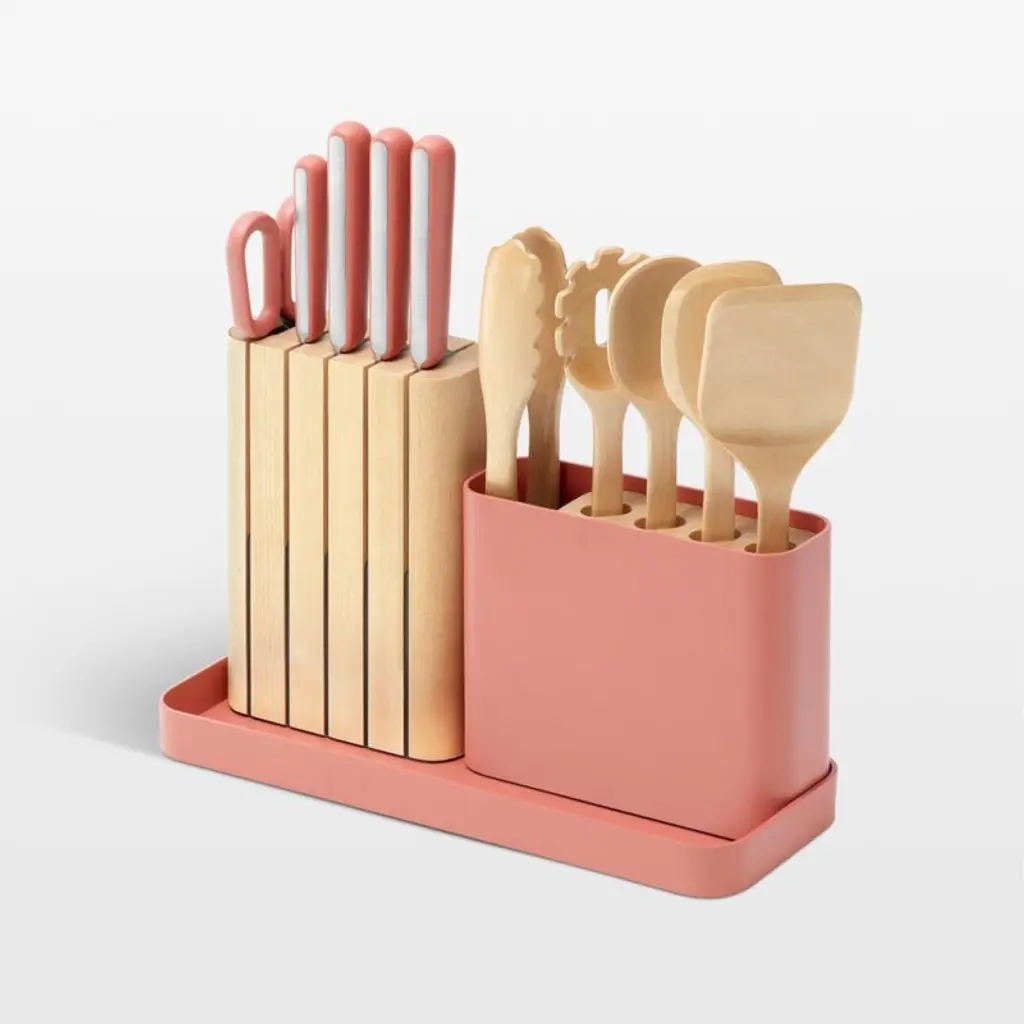 Outfit your kitchen in Caraway's signature modern minimalism with this streamlined prep set. Four essential kitchen knives and a pair of shearsall with hand-sharpened blades and sleek green handlesnestle within the linear block crafted of sustainably sourced birch. Five hand-sanded utensils made of the same wood store upright in a birch block within a misty green utensil container. The matching tray corrals all components to keep your countertop organized and attractive. A useful housewarming, graduation or wedding gift, this set includes an 8-inch chef's knife, 7-inch 6.5-inch prep knife, 3.5-inch paring knife, kitchen shears, spoon, server, scraper, spatula and tongs in a modular storage system.