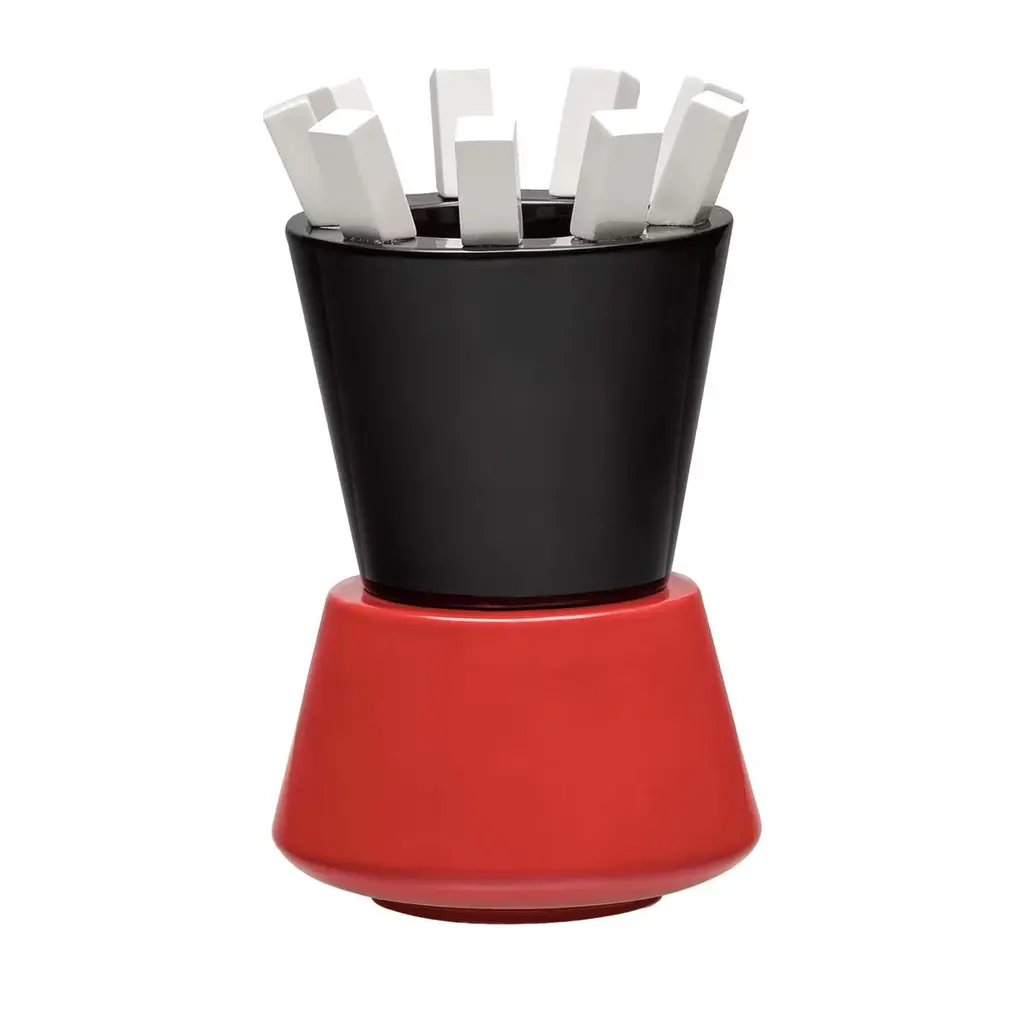 Outfit your kitchen in modern minimalism with this streamlined prep set. Four essential kitchen knives and a pair of shearsall with hand-sharpened blades and sleek handles in "perracotta," Caraway's unique pink-terracotta huenestle within the linear block crafted of sustainably sourced birch. Five hand-sanded utensils made of the same wood store upright in a birch block within a rosy utensil container. The matching tray corrals all components to keep your countertop organized and attractive. A useful housewarming, graduation or wedding gift, this set includes an 8-inch chef's knife, 7-inch 6.5-inch prep knife, 3.5-inch paring knife, kitchen shears, spoon, server, scraper, spatula and tongs in a modular storage system.