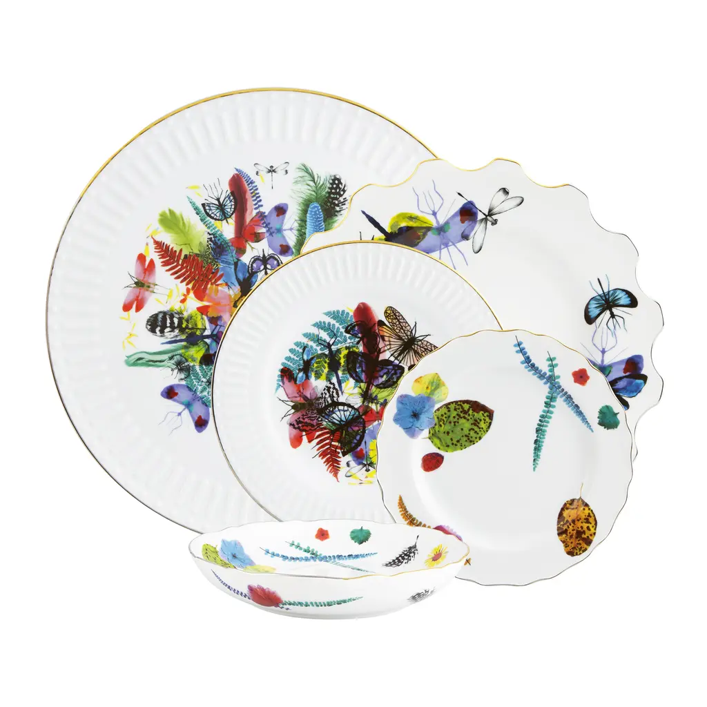 For this new porcelain collection developed by Vista Alegre, Christian Lacroix has imagined a decoration with tropical exuberance. Flowers, feathers, ferns and fireflies pose like a baroque herbarium over a white porcelain set with cutouts and friezes, evoking the english embroidery on the pristine petticoats worn by the beautiful women from Salvador da Bahia.