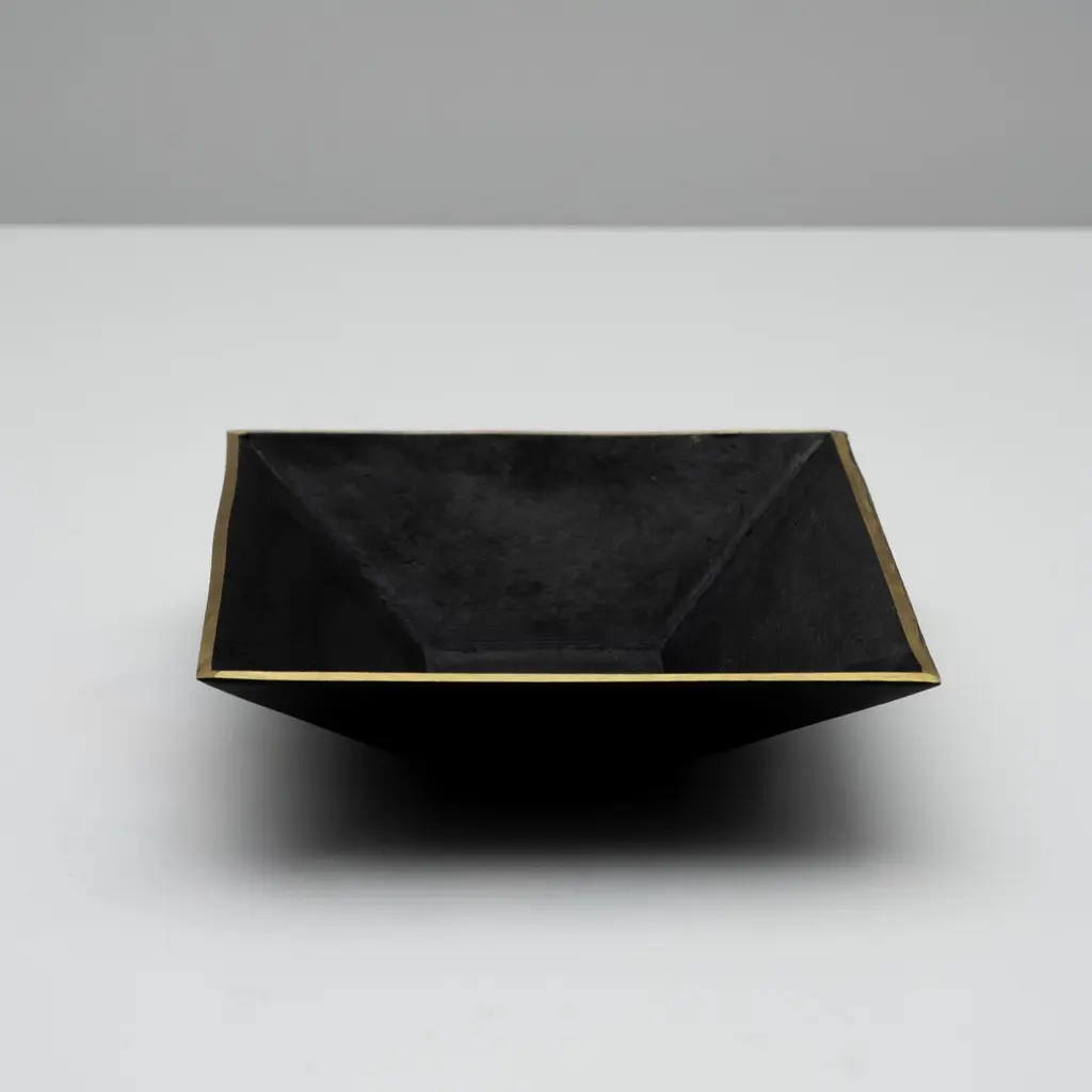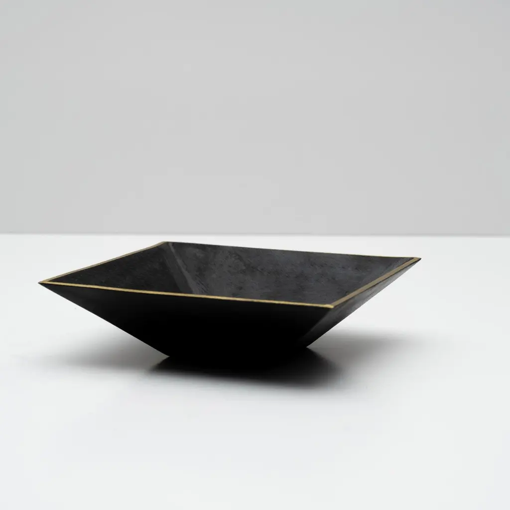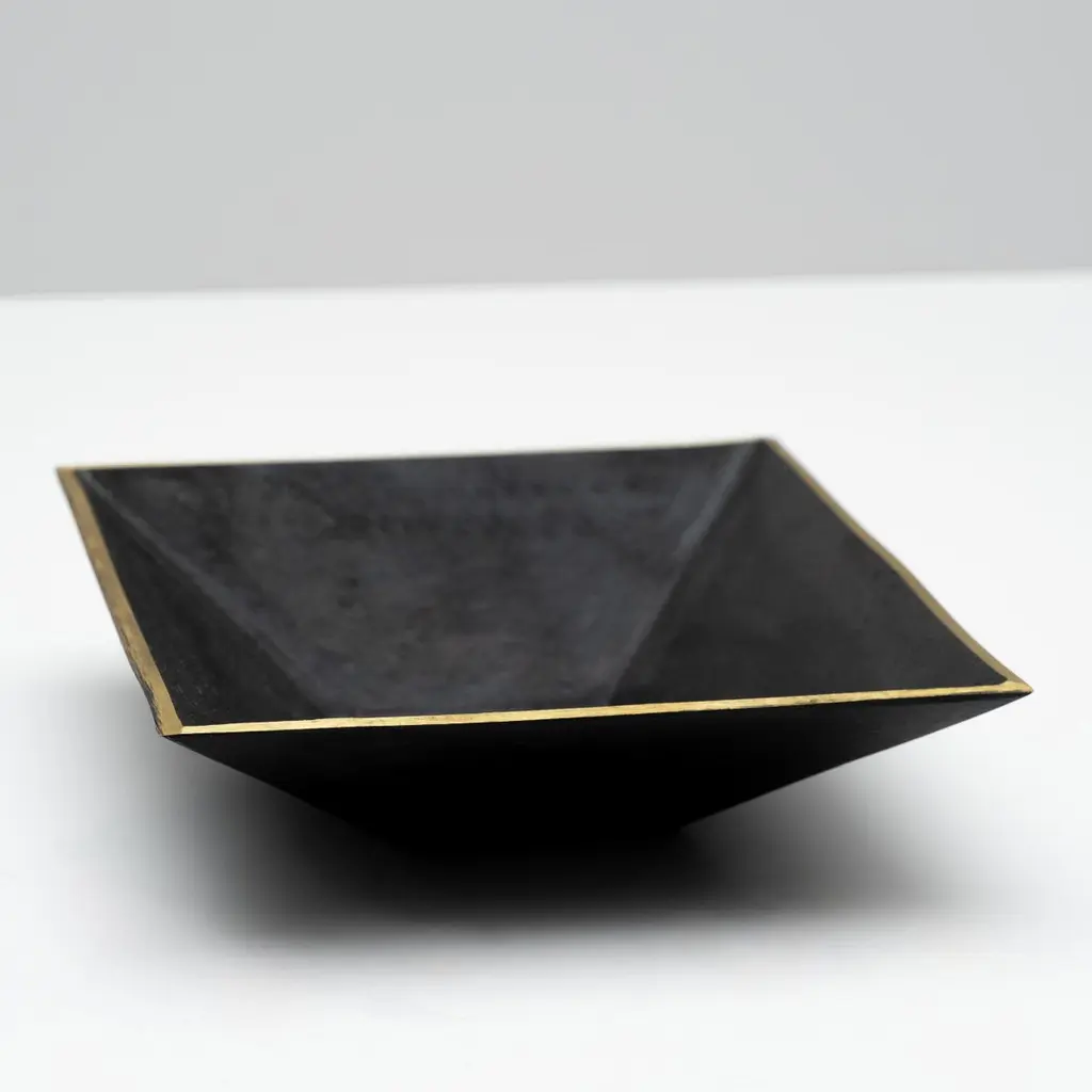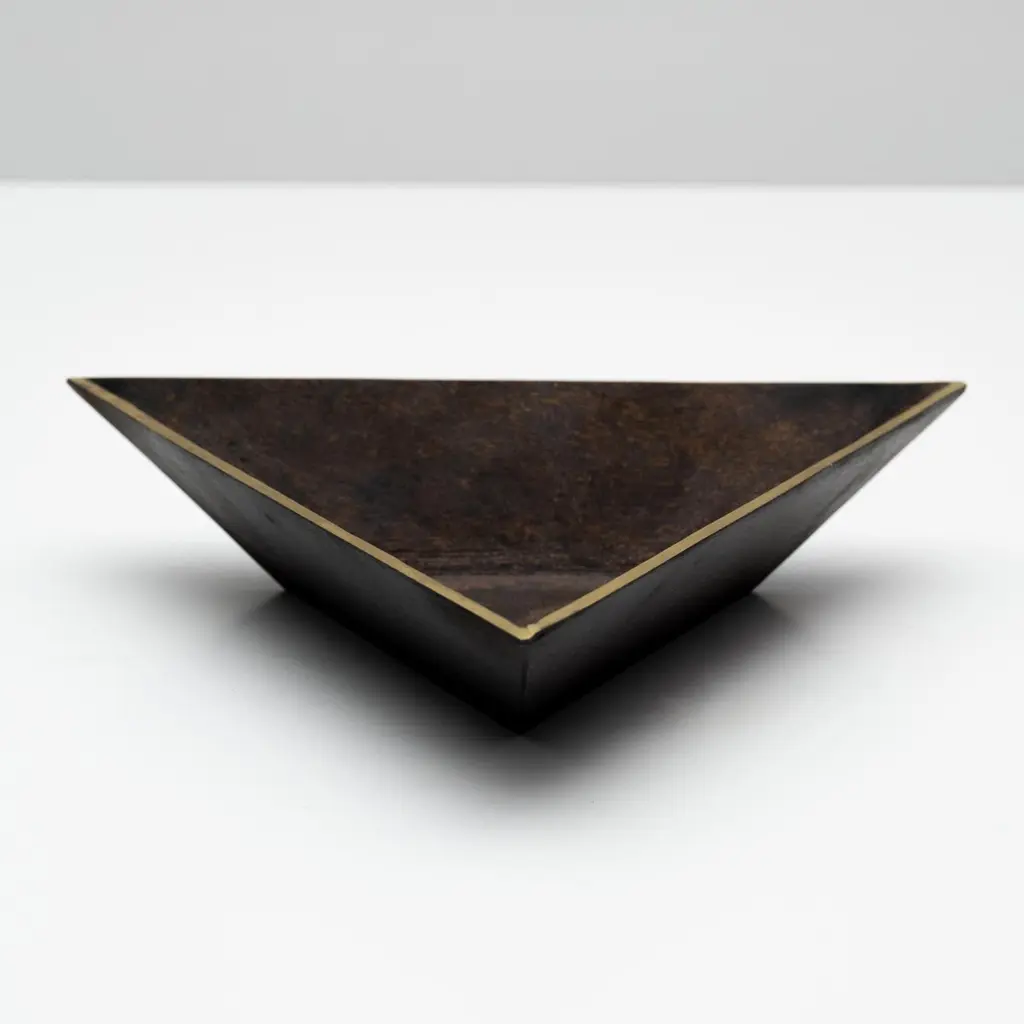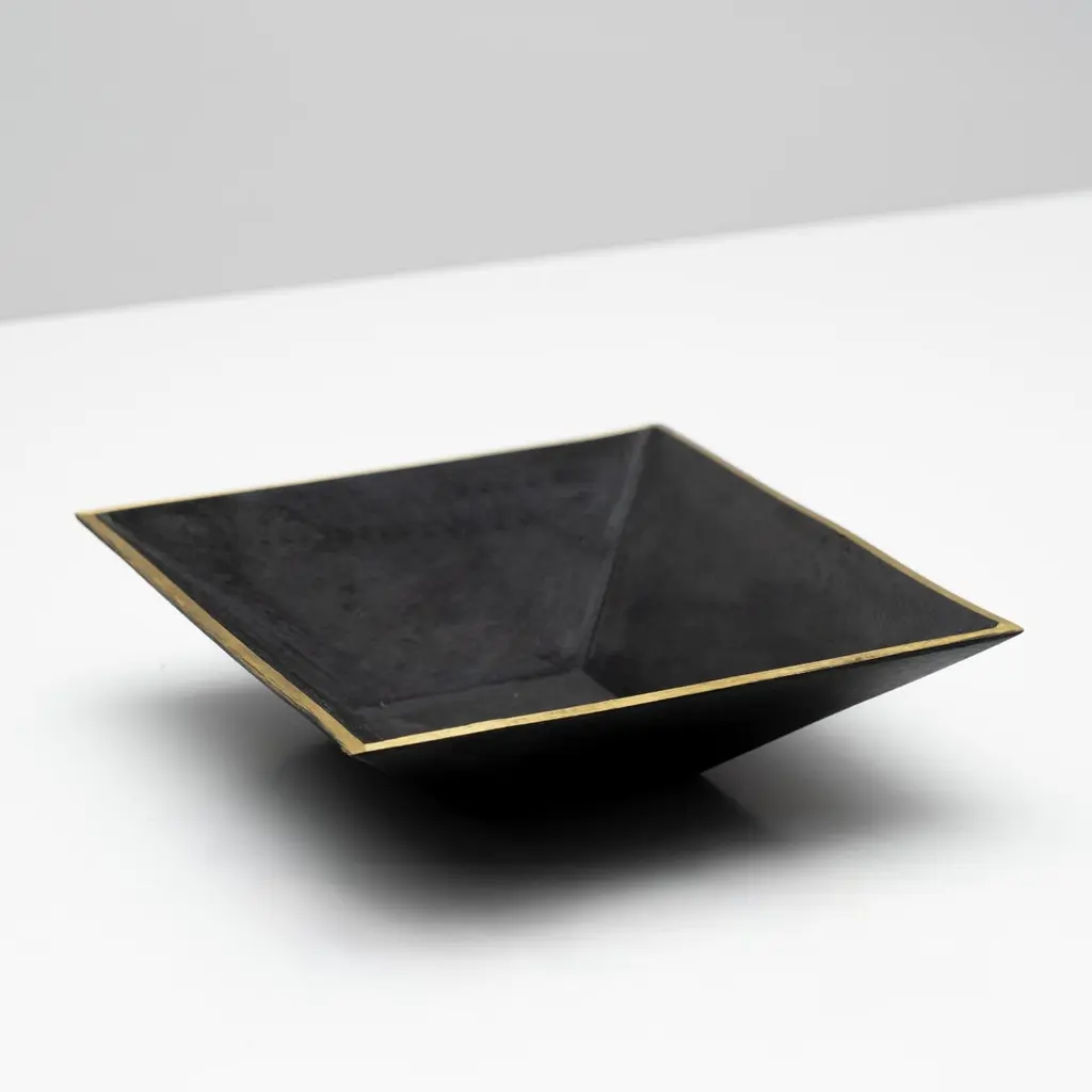 Carl Auböck Model #4482 patinated brass square dish. Designed in the 1950s, this incredibly refined and sculptural Viennese bowl is executed in polished and darkly patinated brass. Originally conceived as an ashtray, this decorative vessel can be used for a variety of purposes as a catch-all or display piece. Also available in a triangle-shaped variant in a separate listing.Price is per item. One in stock ready to ship. Available in unlimited quantities. Please note that in-stock availability is subject to change at any time. Out of stock lead time 2-3 weeks or more. For time-sensitive orders, kindly inquire prior to purchasing.Produced by Carl Auböck IV in the original Auböck Werkstätte in the 7th district of Vienna using the same exacting standards, high-quality materials, original molds and techniques of his legendary grandfather. Auböck's design career was long and varied, reaching its pinnacle of prestige at the Triennale di Milano in 1954, where he received four gold medals in recognition of his iconic work.Please note that only one representative example of each item is shown in the images. Finish varies from item to item due to the handmade nature of their fabrication and due to the unique chemical patination process, which is meant to simulate 80-100 years of exposure of brass to sunlight.Made to order. All sales are final.