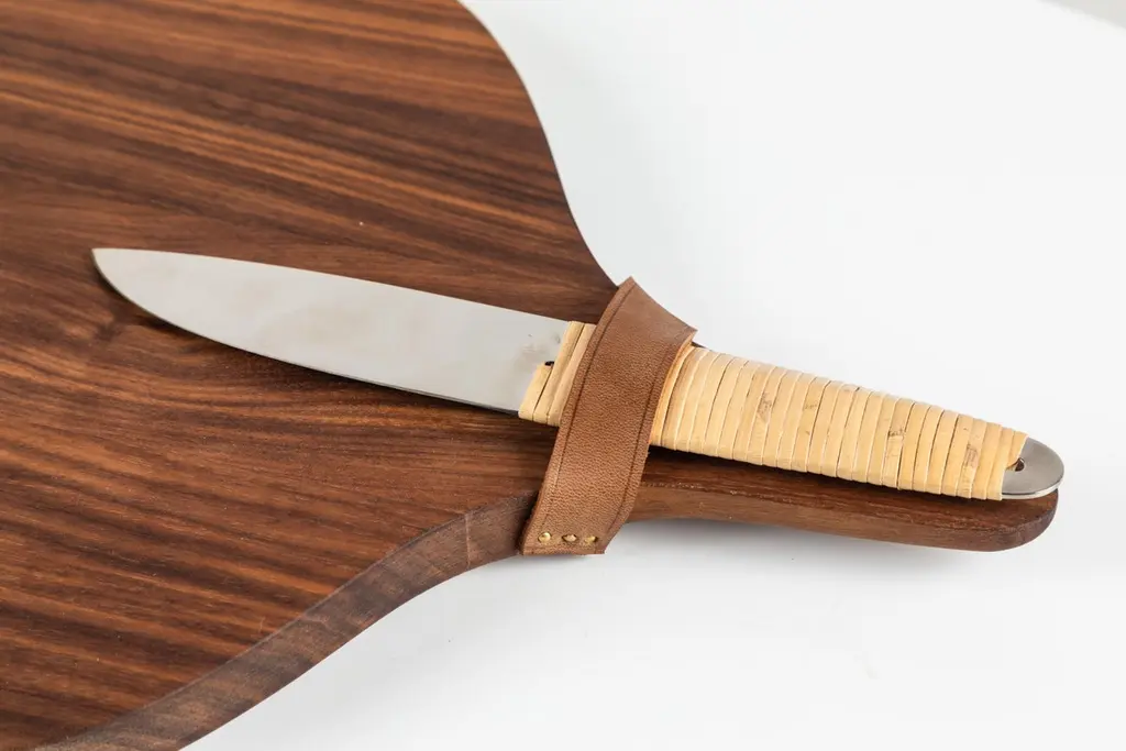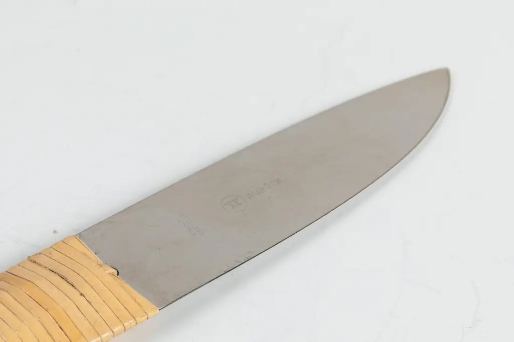 Carl Auböck Model #4828 cane and steel knife. Designed in the 1950s, this incredibly refined and sculptural knife is executed in polished steel and handwoven cane.Price is per item. This listing is for the knife only. One in stock ready to ship. Available in unlimited quantities. In-stock availability subject to change. Allow additional 2-3 weeks for items not in stock. Can take up to 8 weeks.Produced by Carl Auböck IV in the original Auböck Werkstätte in the 7th district of Vienna using the same exacting standards, high-quality materials, original molds and techniques of his legendary grandfather. Auböck's design career was long and varied, reaching its pinnacle of prestige at the Triennale di Milano in 1954, where he received four gold medals in recognition of his iconic work.Please note only one representative example shown in images. Finish varies from item to item due to the handmade nature of their fabrication.
