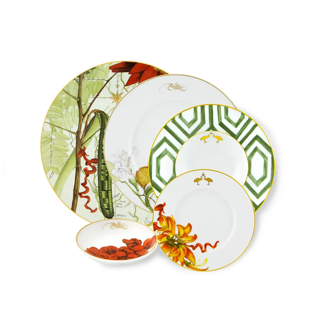A colorful and original addition to a modern table, this set of three porcelain plates is part of the Carte da Zogo Collection characterized by a charming motif with playing cards scattered on a yellow or white background and paired with multicolored butterflies. This set includes a yellow dinner plate (27 d cm), a yellow fruit/dessert plate (23 d cm), and a soup plate (20 d cm) and arrives in a signature gift box. Made to order, please allow 4-6 weeks for completion before delivery.