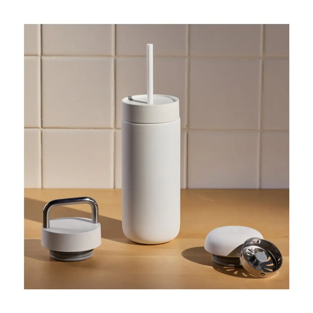 Fellow's Carter 3-in-1 Lid System is the perfect set for carrying hot or cold beverages, whether it's warm coffee or refreshing iced tea. The set features a high-quality Carter Move travel mug with a double-walled construction that effectively insulates heat. Its ceramic True Taste coating ensures your drink retains its pure flavor without the metallic or off-notes common in many thermoses. In addition to the Carter Move thermo mug, the set includes three lid options for different uses: Move lid + splash guard: Featuring a snap-in splash guard, this secure screw lid keeps hot drinks warm for about 12 hours and cold drinks cool for up to 24 hours, Cold lid + straw: Designed for cold brew coffee, soft drinks or even cocktails, this lid comes with a spill-resistant Tritan straw. Carry lid: A lid with a metal handle, convenient for carrying around on the streets, in transit or at the office. The Carter 3-in-1 Lid System is packaged in a stylish box, making it a great gift option as well.